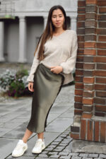 Pent skjørt fra Samsøe Samsøe i en frisk oransjefarge. Agneta Skirt kommer med en dekorativ kant hvilket gjør at det er like fint med en overdel innenfor kanten som utenfor. Med sin flatterende lengde og skimrende overflate er dette et skjørt som kan pyntes opp og ned etter bruk. Kombiner med et par boots eller sneakers med en strikket genser til hverdags og bytt ut overdelen og skoene med et par pumps og en topp til fest.