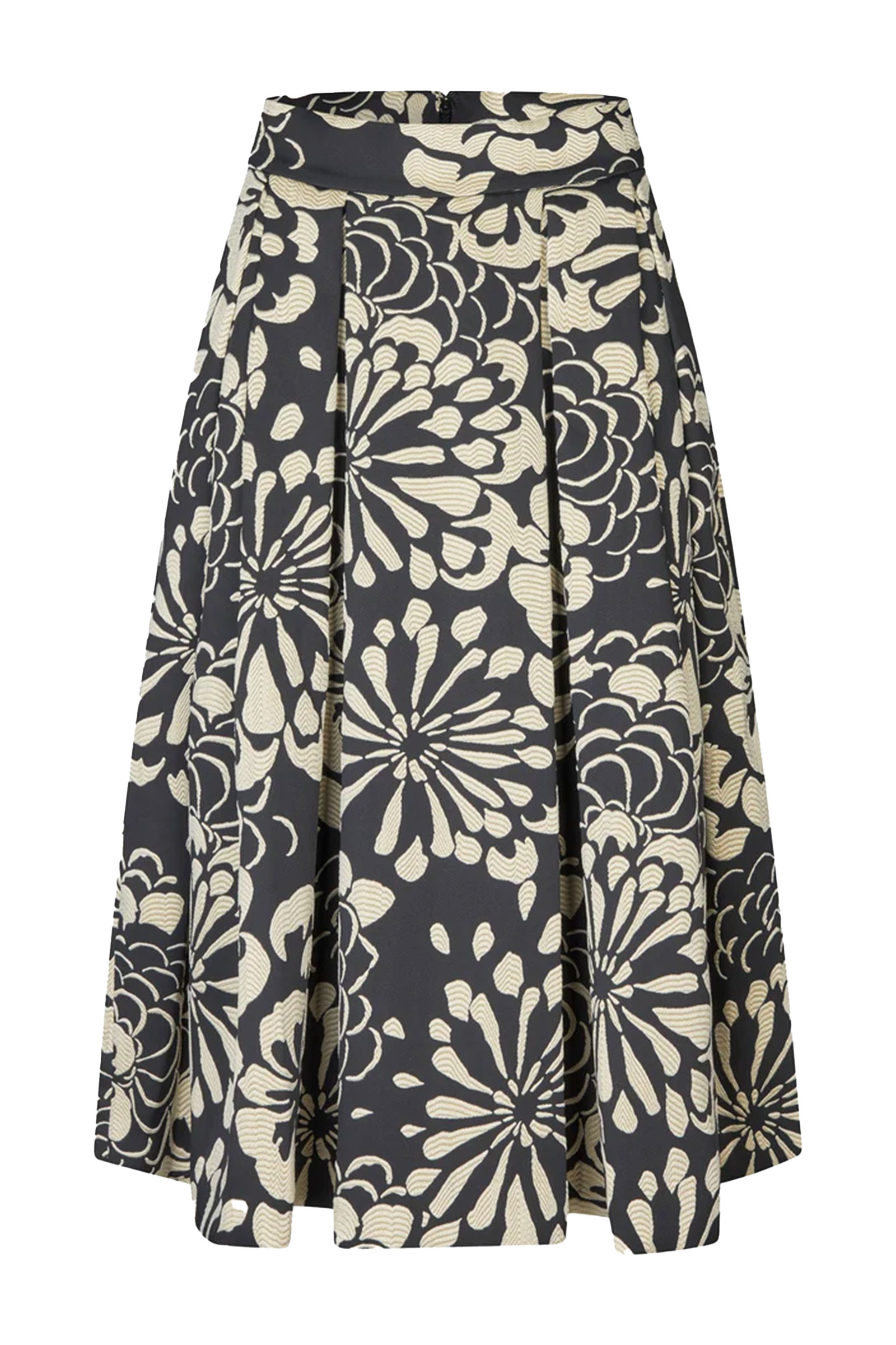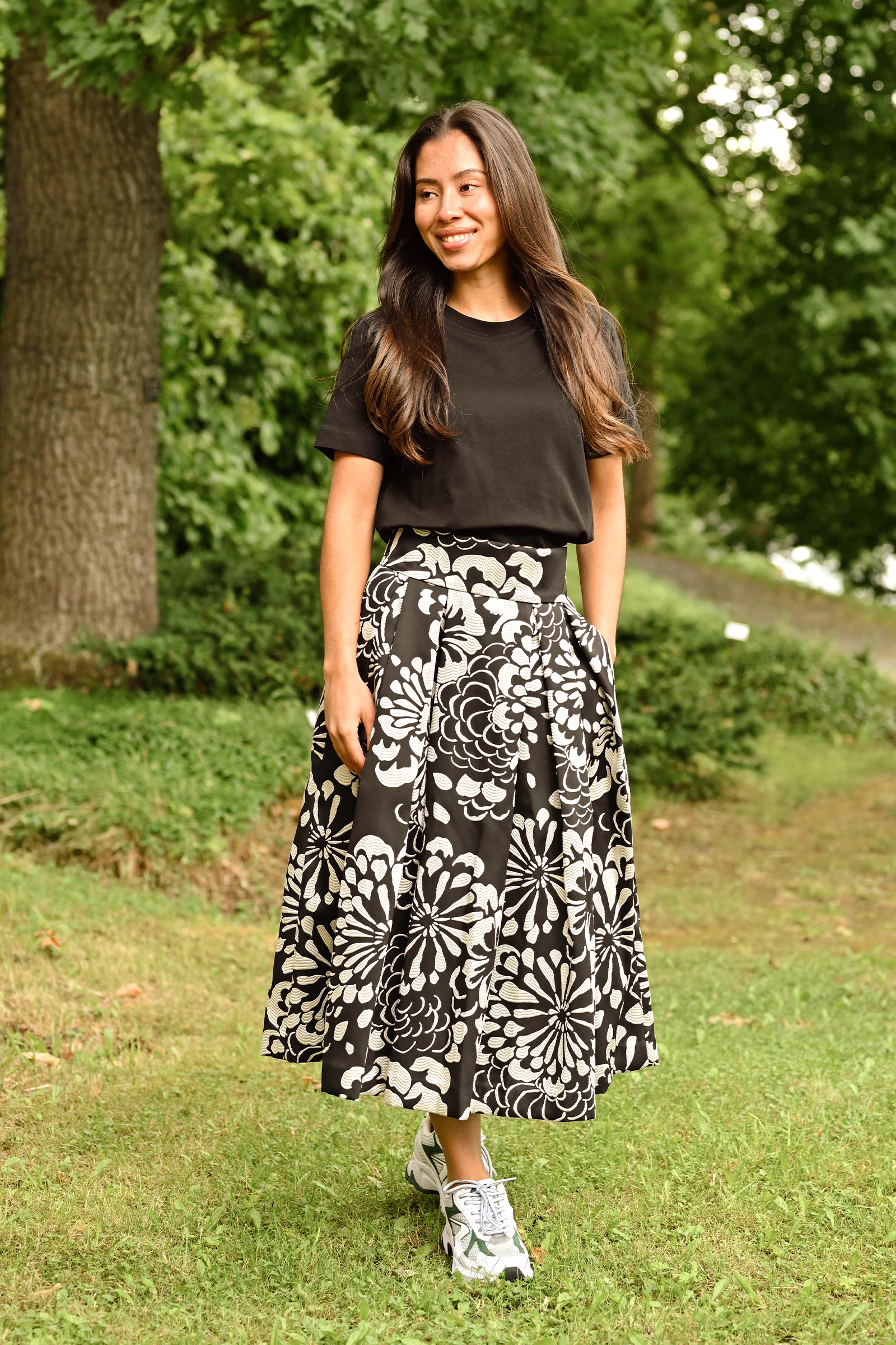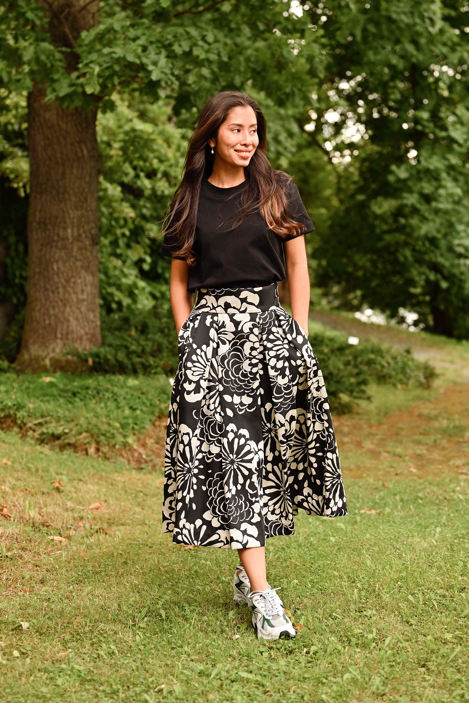 Nyhet – Jacquardskjørt med blomster! Dette sofistikerte skjørtet i en dramatisk, oversized blomster-jacquard i ecru og svart gjør et stilsikkert inntrykk. Albis har en høy linning og dype legg som gir en flatterende, voluminøs fasong med lengde til midt på leggen. Sidelommer gir en praktisk detalj, og en skjult glidelås bak sørger for god passform. Skjørtet er helfôret for ekstra komfort og struktur. Superfint til formelle anledninger og kan enkelt styles opp med en bluse og et par hæler for en komplett look!