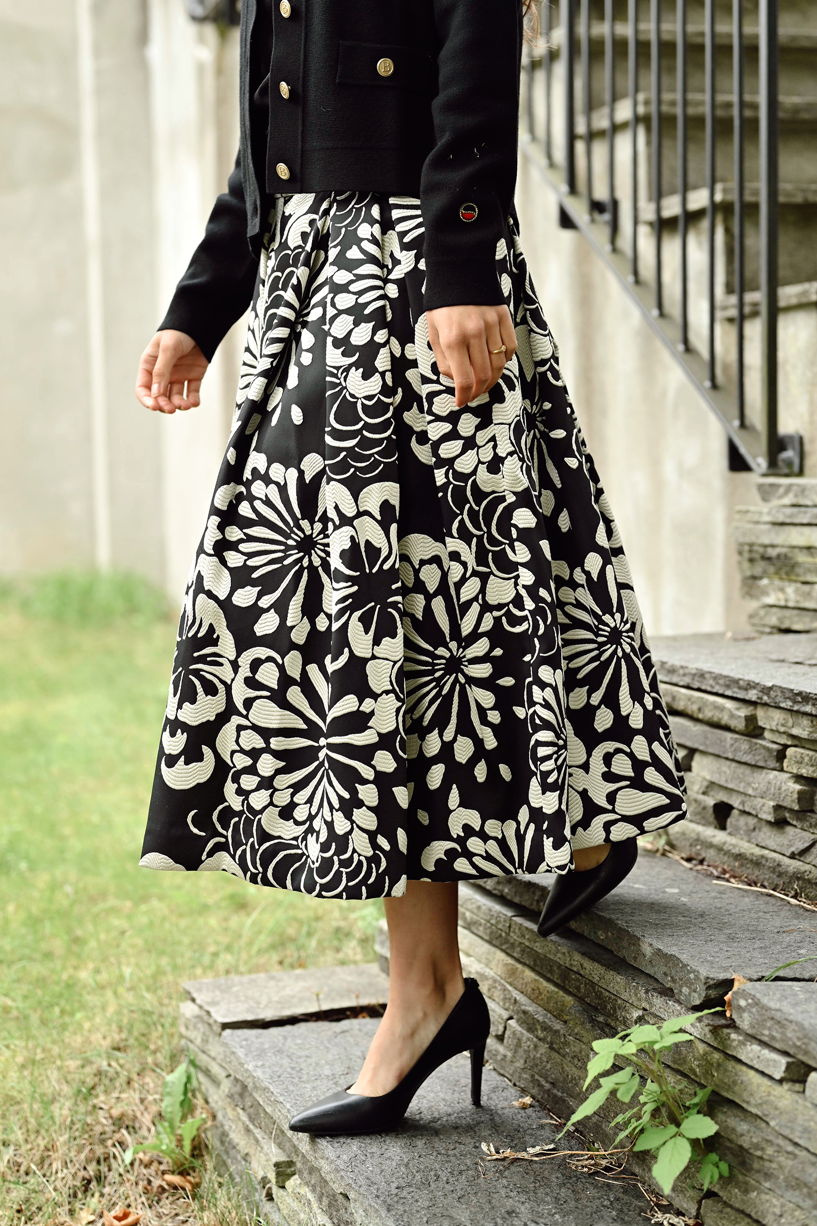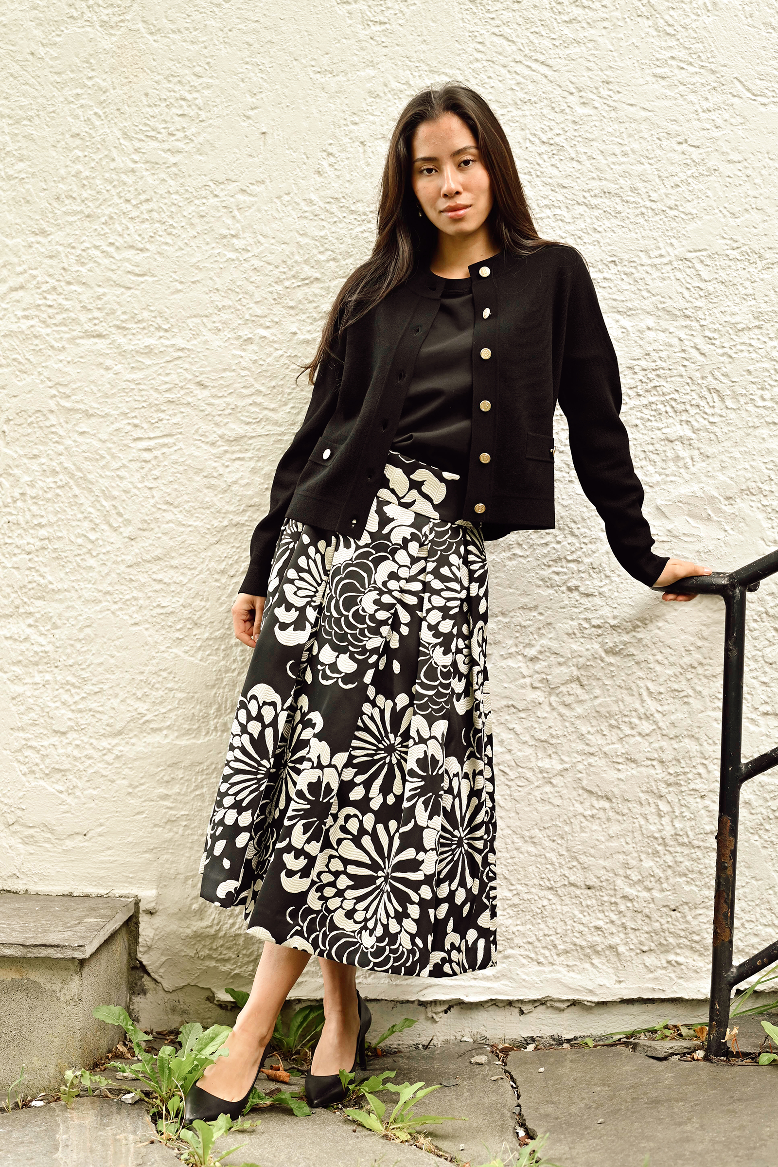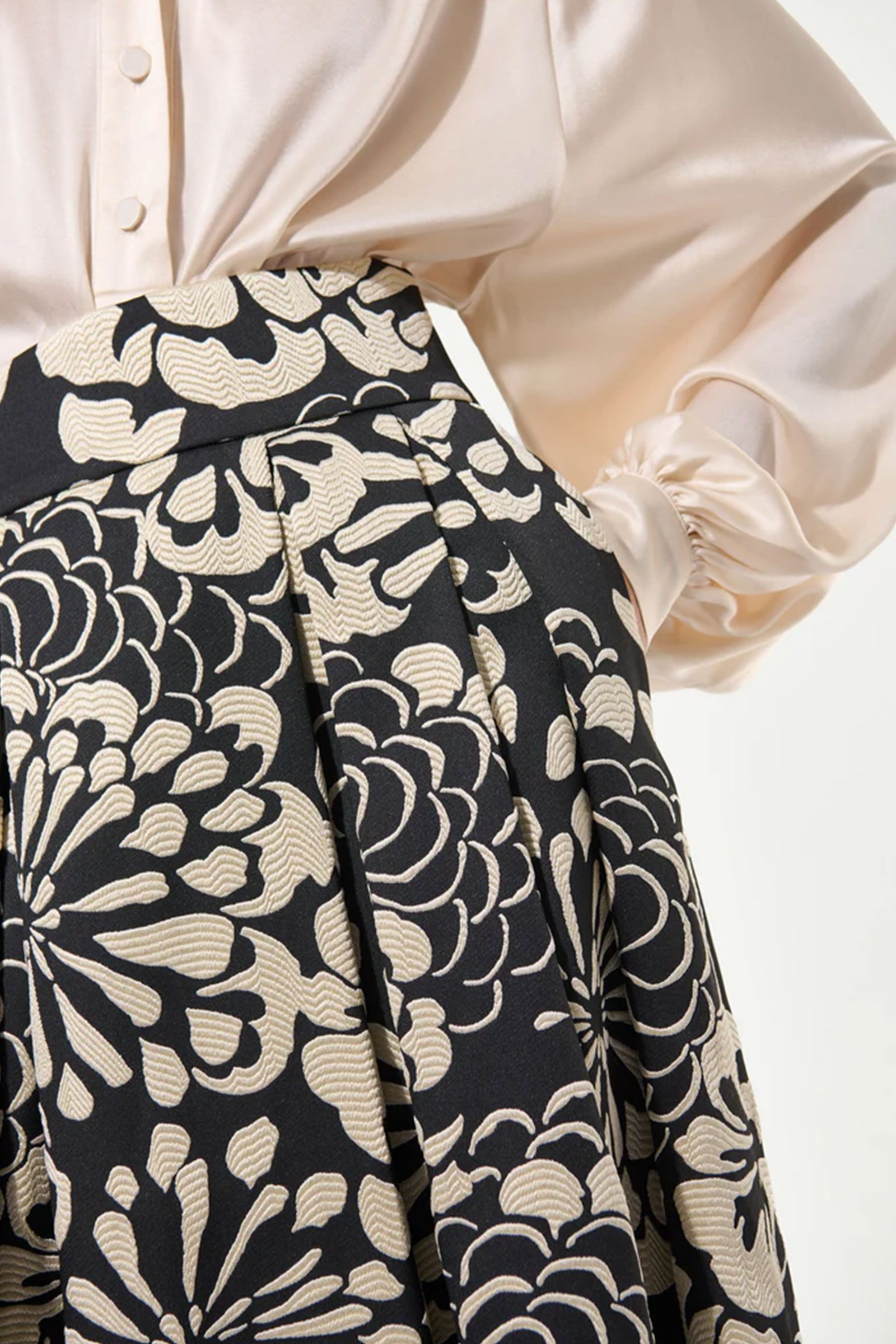 Nyhet – Jacquardskjørt med blomster! Dette sofistikerte skjørtet i en dramatisk, oversized blomster-jacquard i ecru og svart gjør et stilsikkert inntrykk. Albis har en høy linning og dype legg som gir en flatterende, voluminøs fasong med lengde til midt på leggen. Sidelommer gir en praktisk detalj, og en skjult glidelås bak sørger for god passform. Skjørtet er helfôret for ekstra komfort og struktur. Superfint til formelle anledninger og kan enkelt styles opp med en bluse og et par hæler for en komplett look!