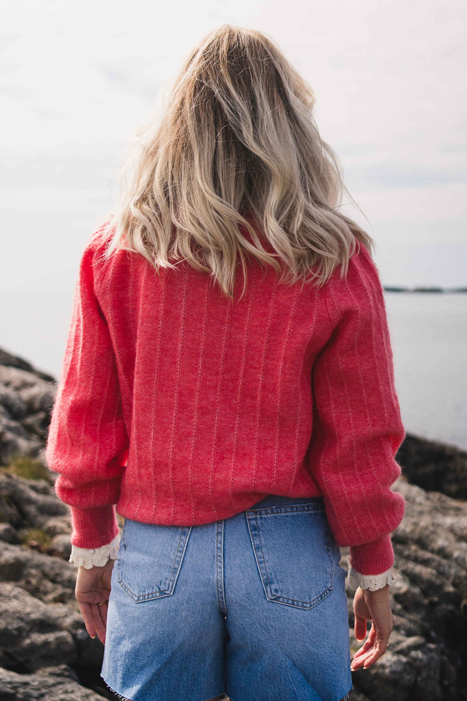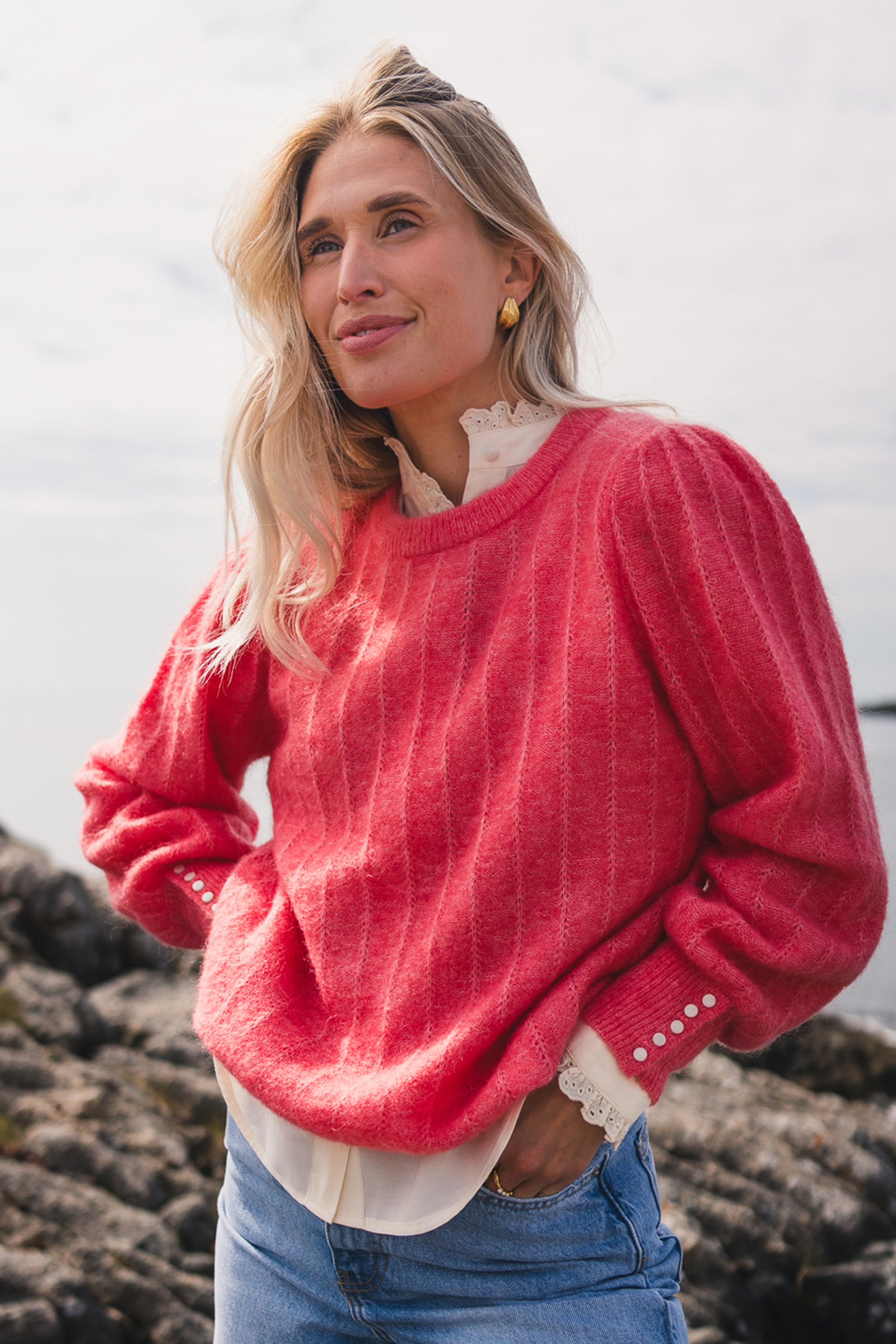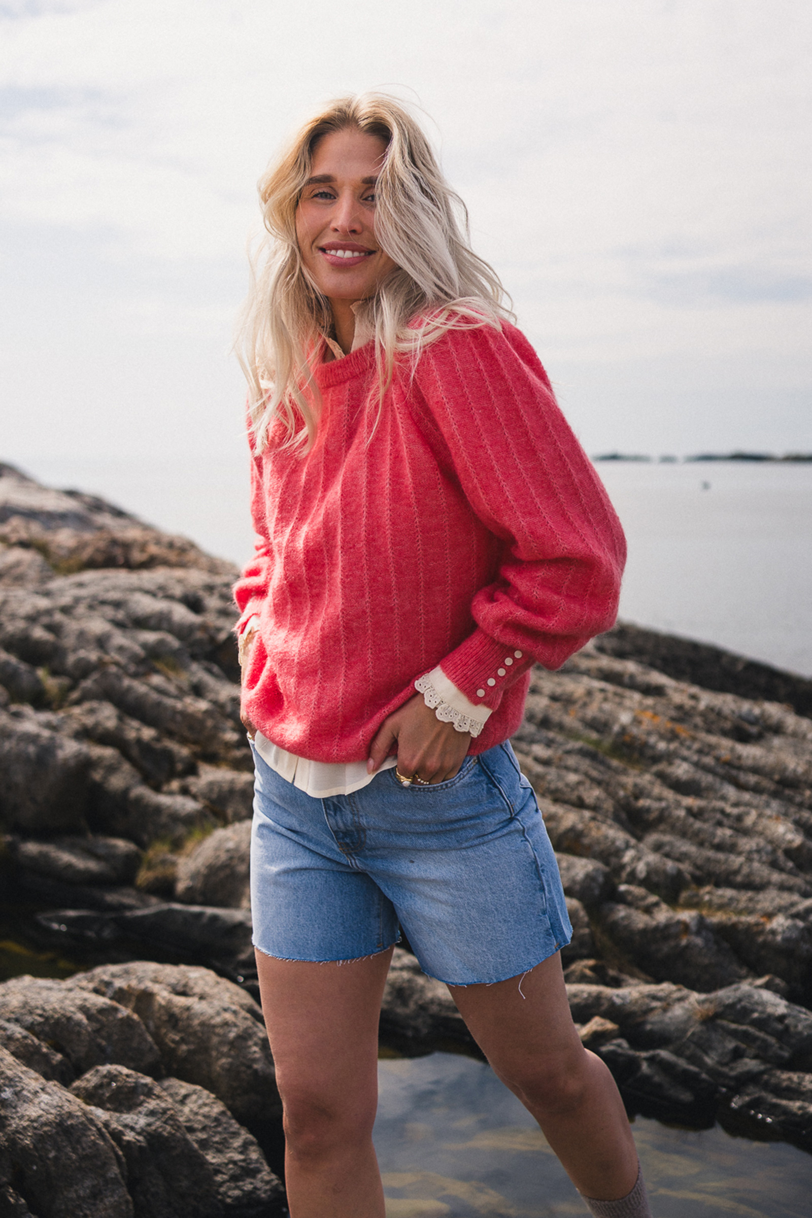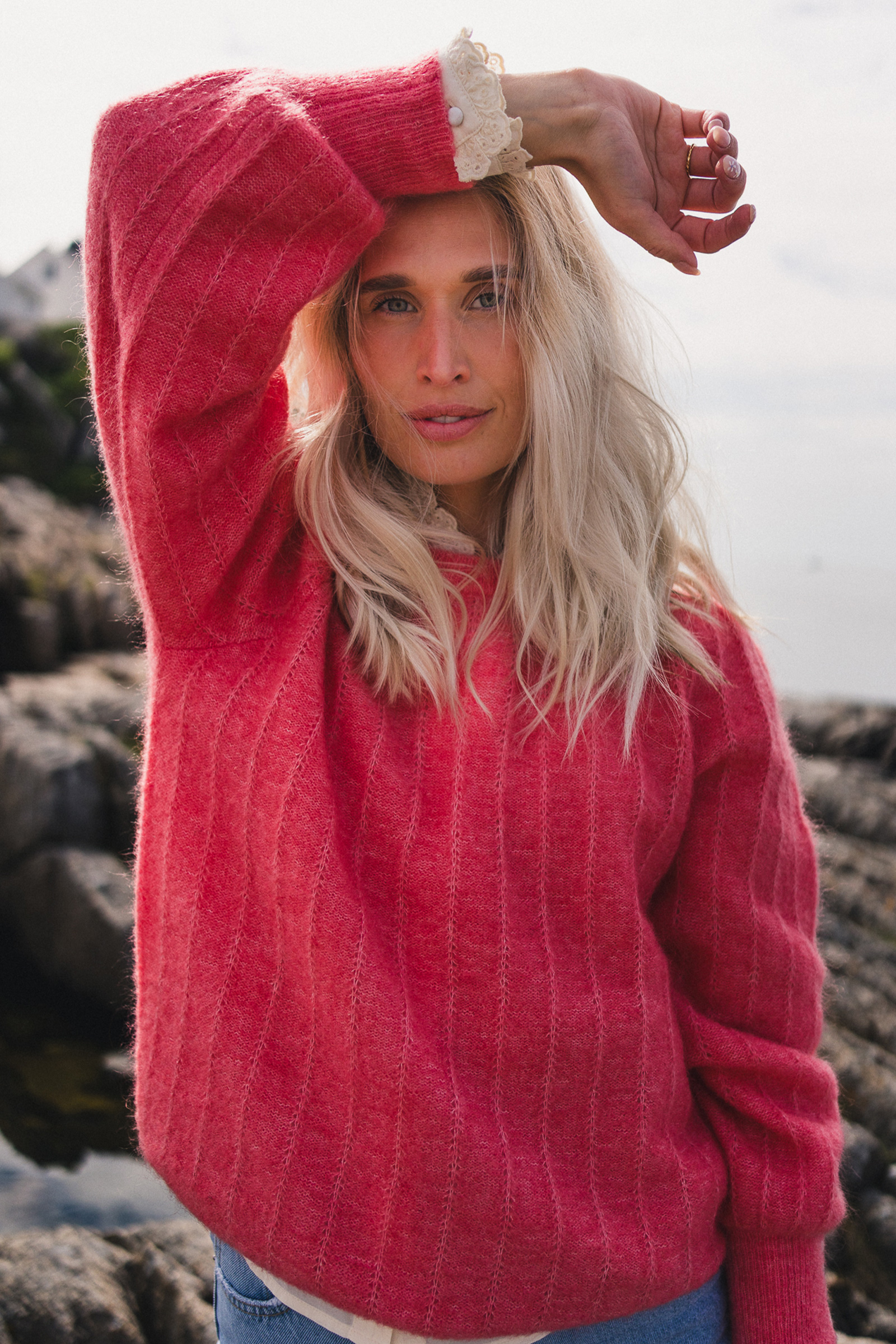 Favoritten fra Raus er tilbake i en korallfarge! Amalie Pullover er en myk og behagelig genser med feminine detaljer. Genseren har en rund, ribbestrikket hals og mansjetter med dekorative knapper, og er strikket i et delikat mønster som gir den et unikt uttrykk. Kombiner med en sommerlig kjole under på varme dager, eller et par blå jeans for et avslappet uttrykk!