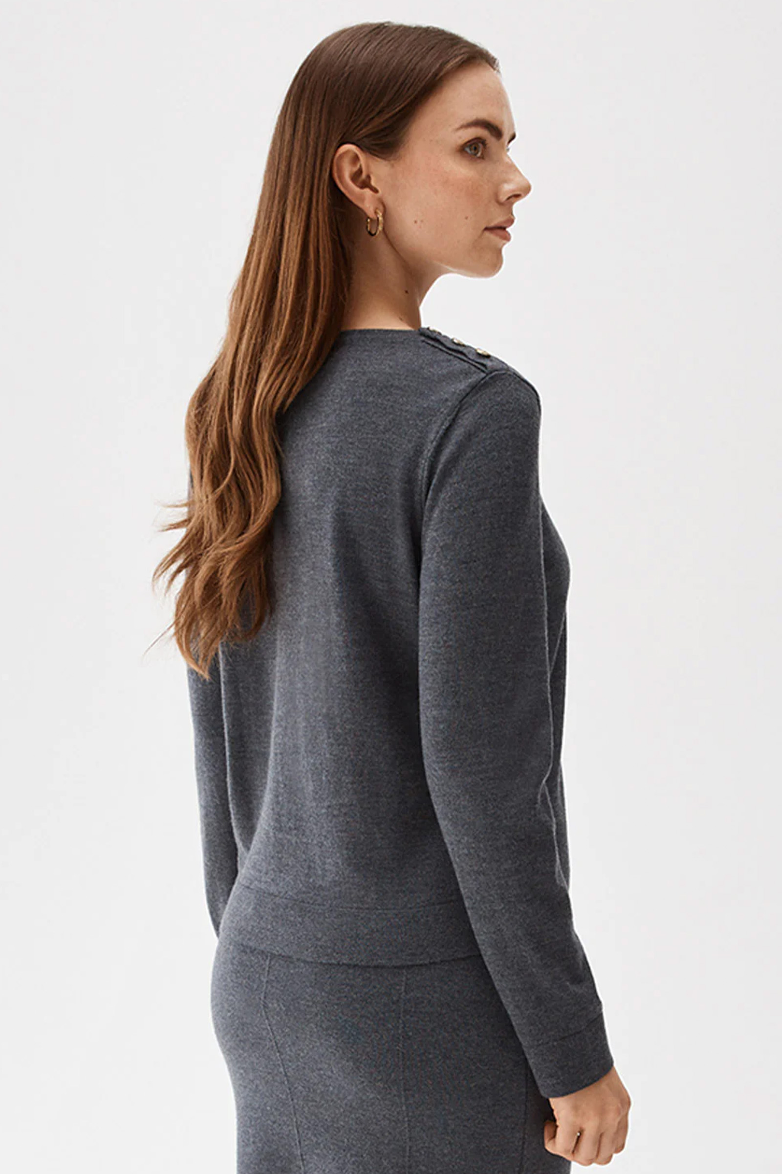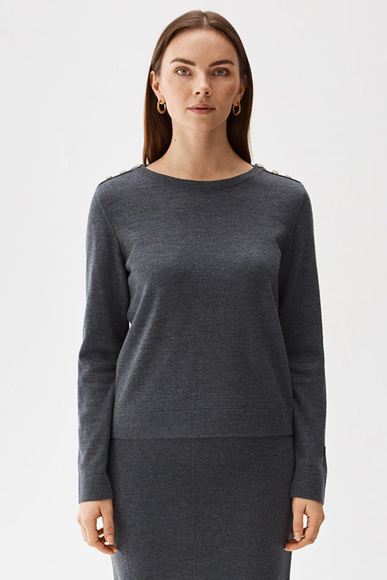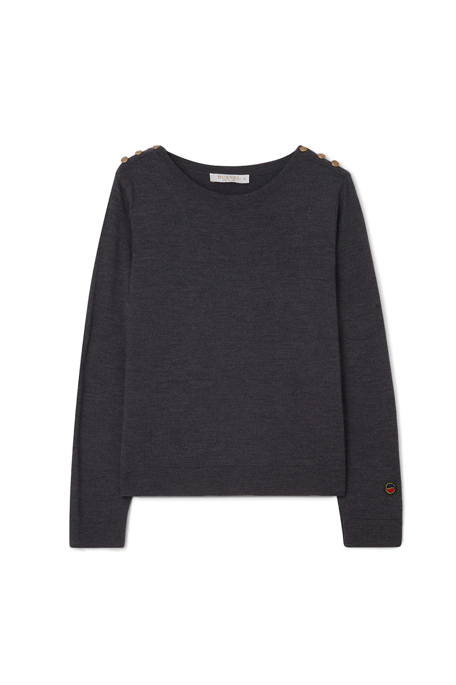 En vakker genser i myk merino fra kvalitetsmerket Busnel. Annika er en klassisk long-sleeve med de ikoniske gyldne knappene som en fin skulderdetalj. Genseren har en klassisk rund hals, en subtil logo på venstre erme og en avslappet passform. Et tilskudd til basegarderoben som vil gå like fint til en dressbukse som til en enkel jeans.