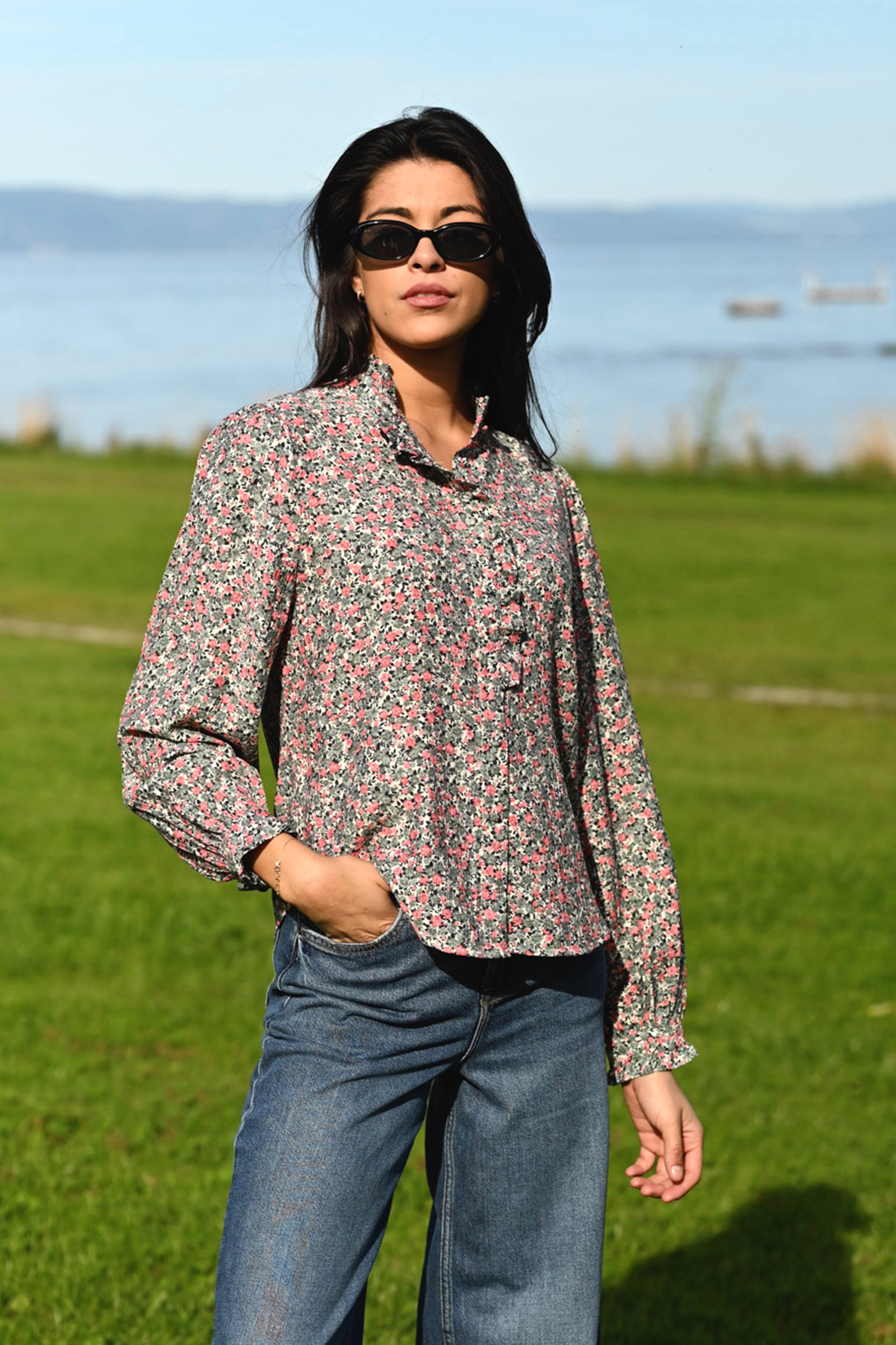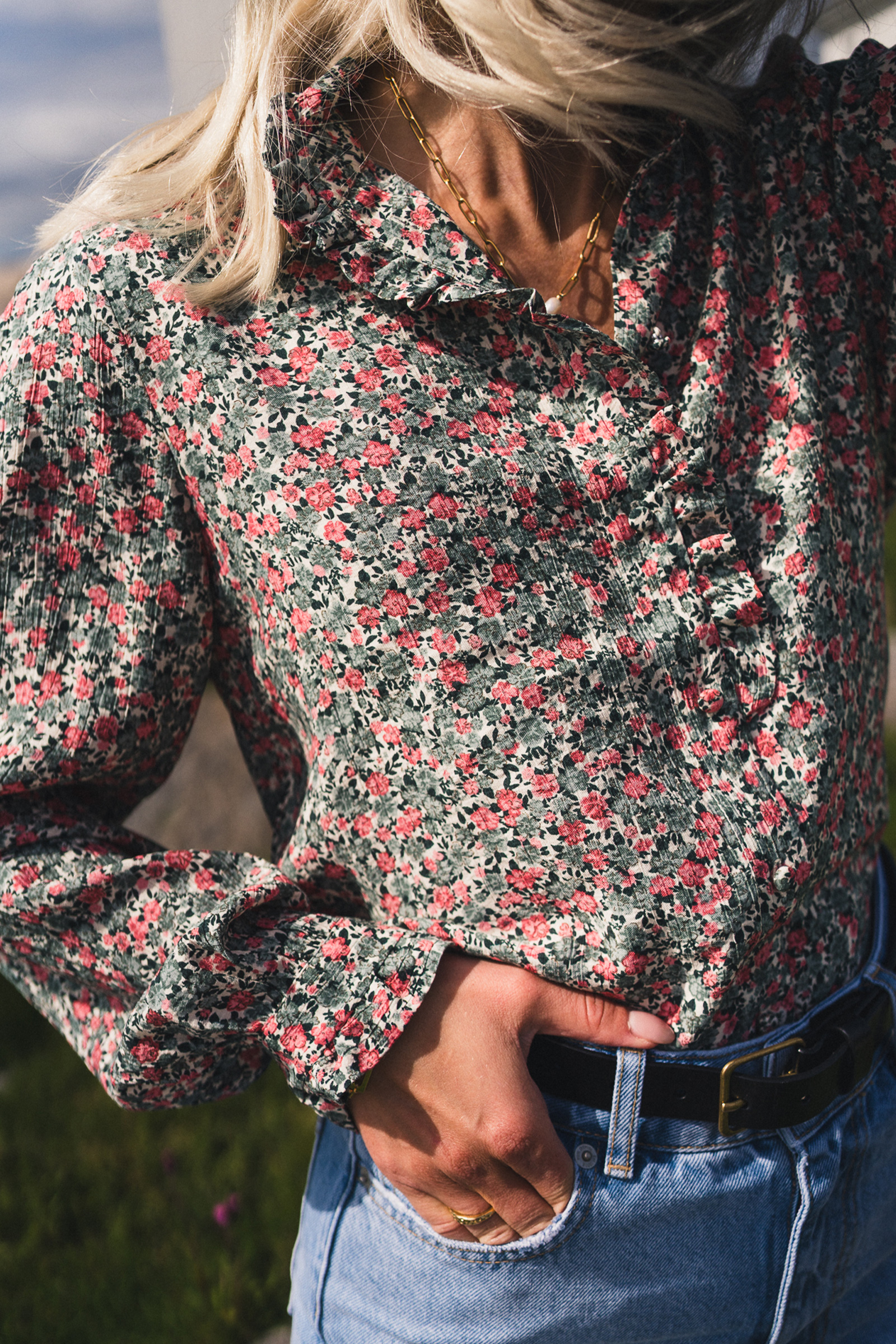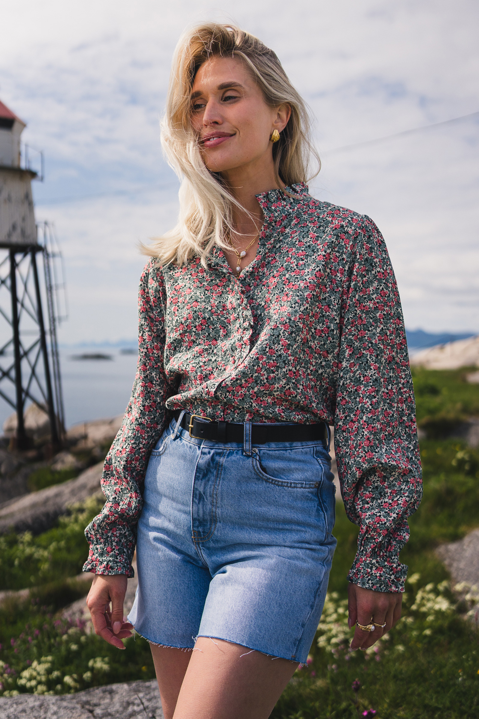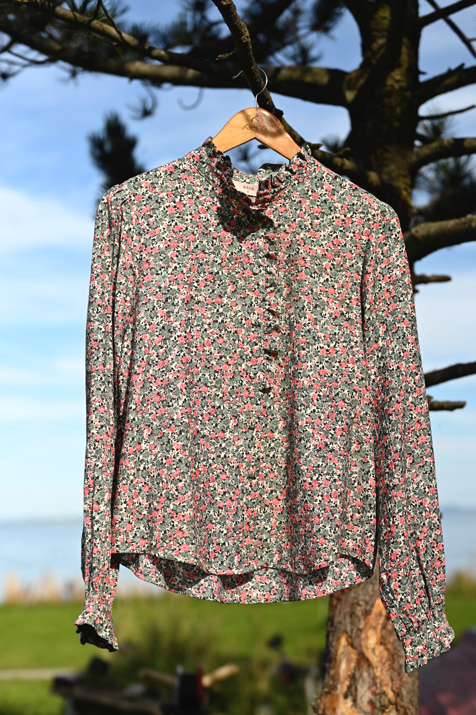 Astrid Shirt fra Raus er en nydelig bluse et herlig print av grønne toner. Blusen har en delikat utforming med rett passform, lange ermer, knappestolpe i grønt samt volanger i halsen, brystet og mansjettene. Astrid har en prestekrage med volanger, samt et blomstermønster i grønne toner som gir et feminint uttrykk. Kombiner blusen med en jeans og sneakers for en avslappet look, eller høye hæler og en lysere dressbukse for en pyntet look.