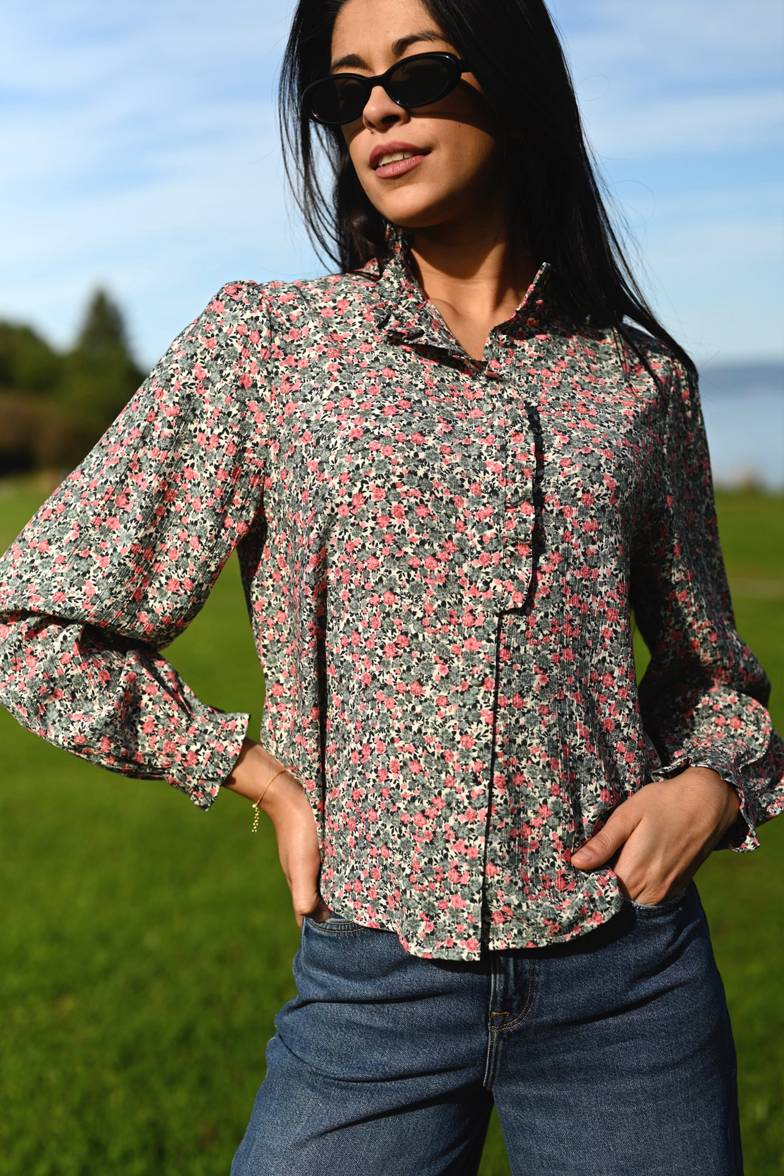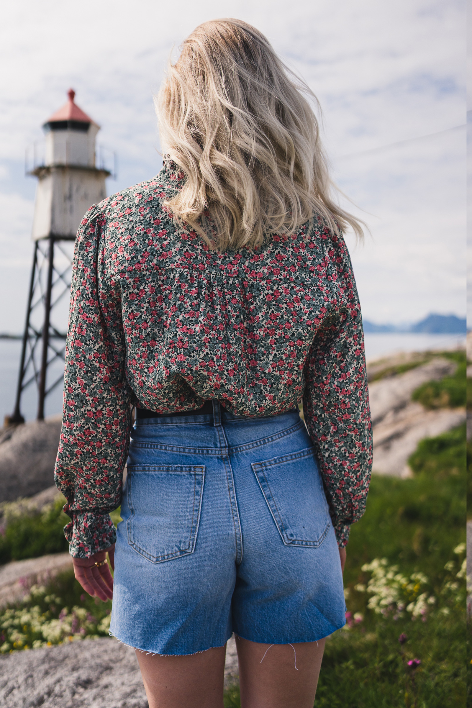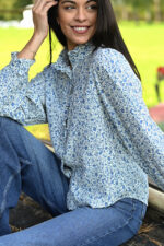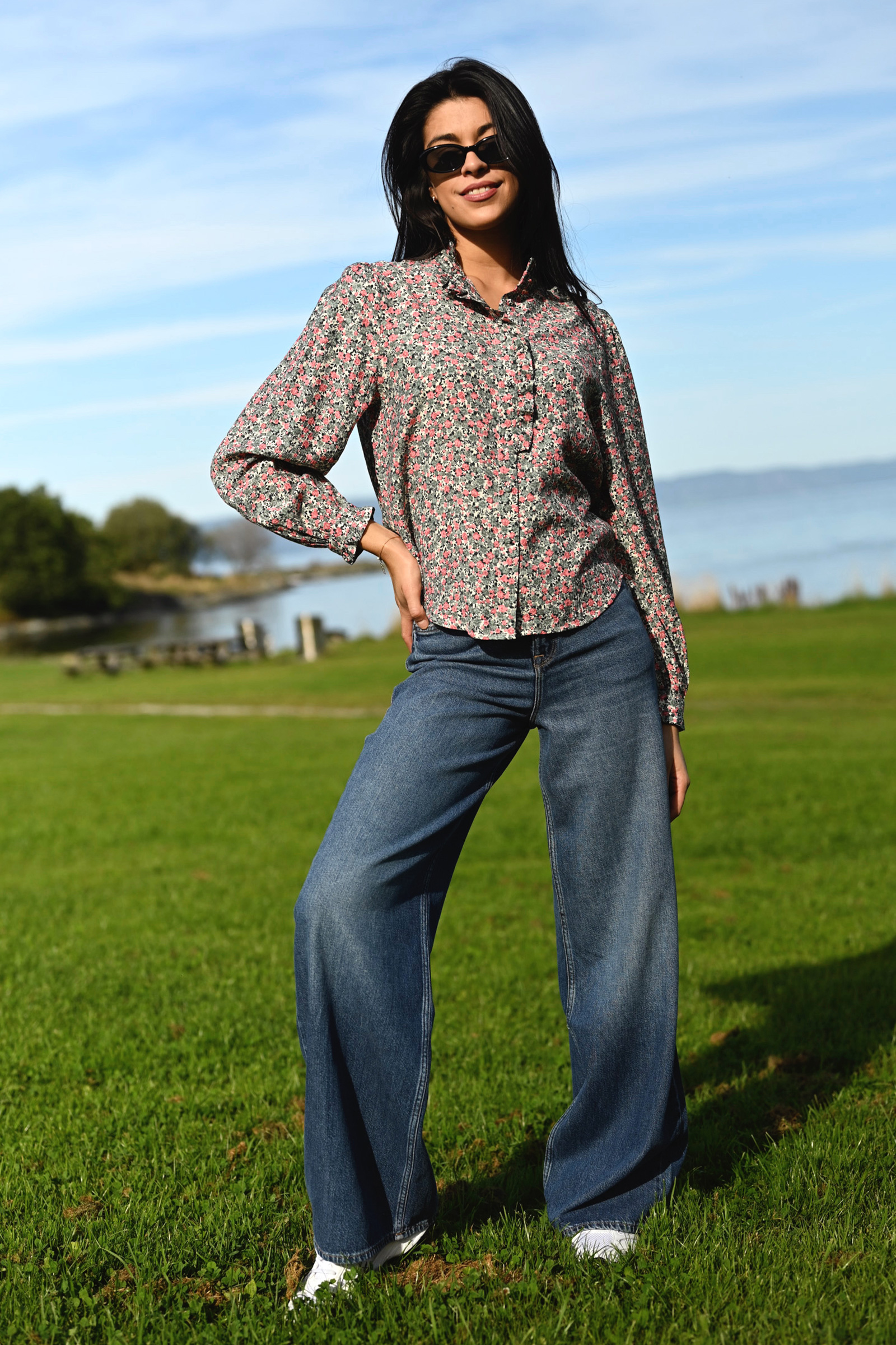 Astrid Shirt fra Raus er en nydelig bluse et herlig print av grønne toner. Blusen har en delikat utforming med rett passform, lange ermer, knappestolpe i grønt samt volanger i halsen, brystet og mansjettene. Astrid har en prestekrage med volanger, samt et blomstermønster i grønne toner som gir et feminint uttrykk. Kombiner blusen med en jeans og sneakers for en avslappet look, eller høye hæler og en lysere dressbukse for en pyntet look.