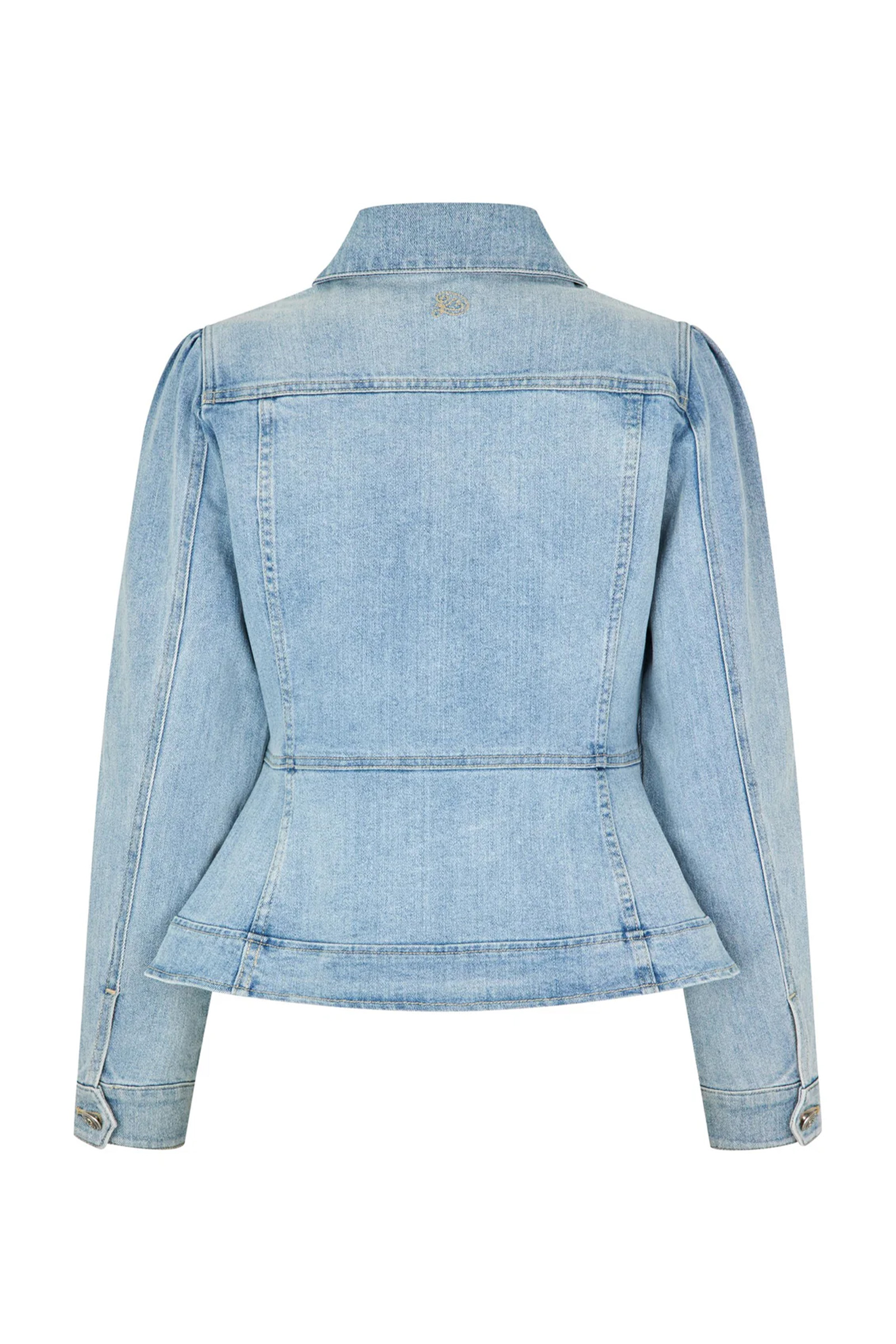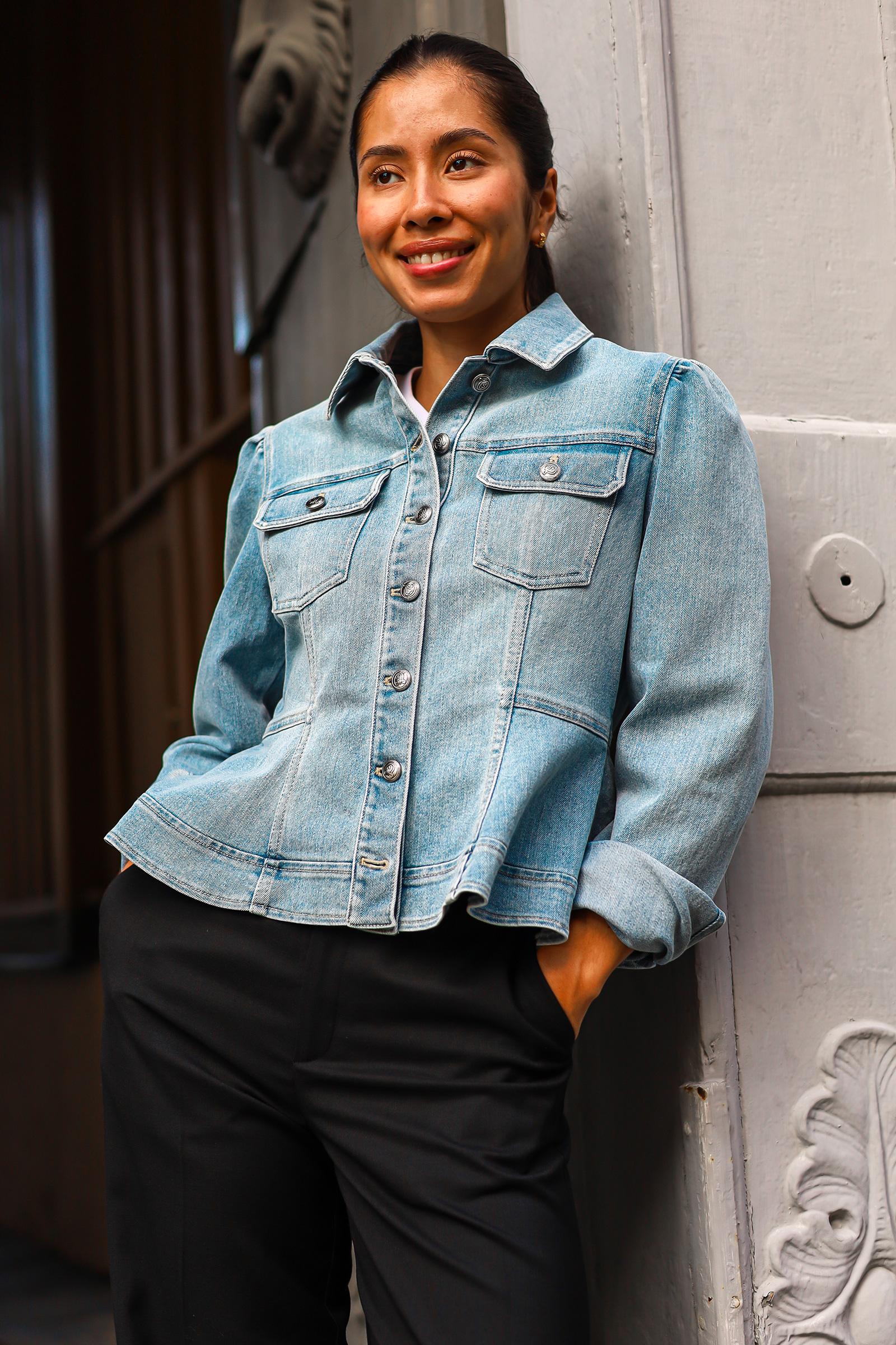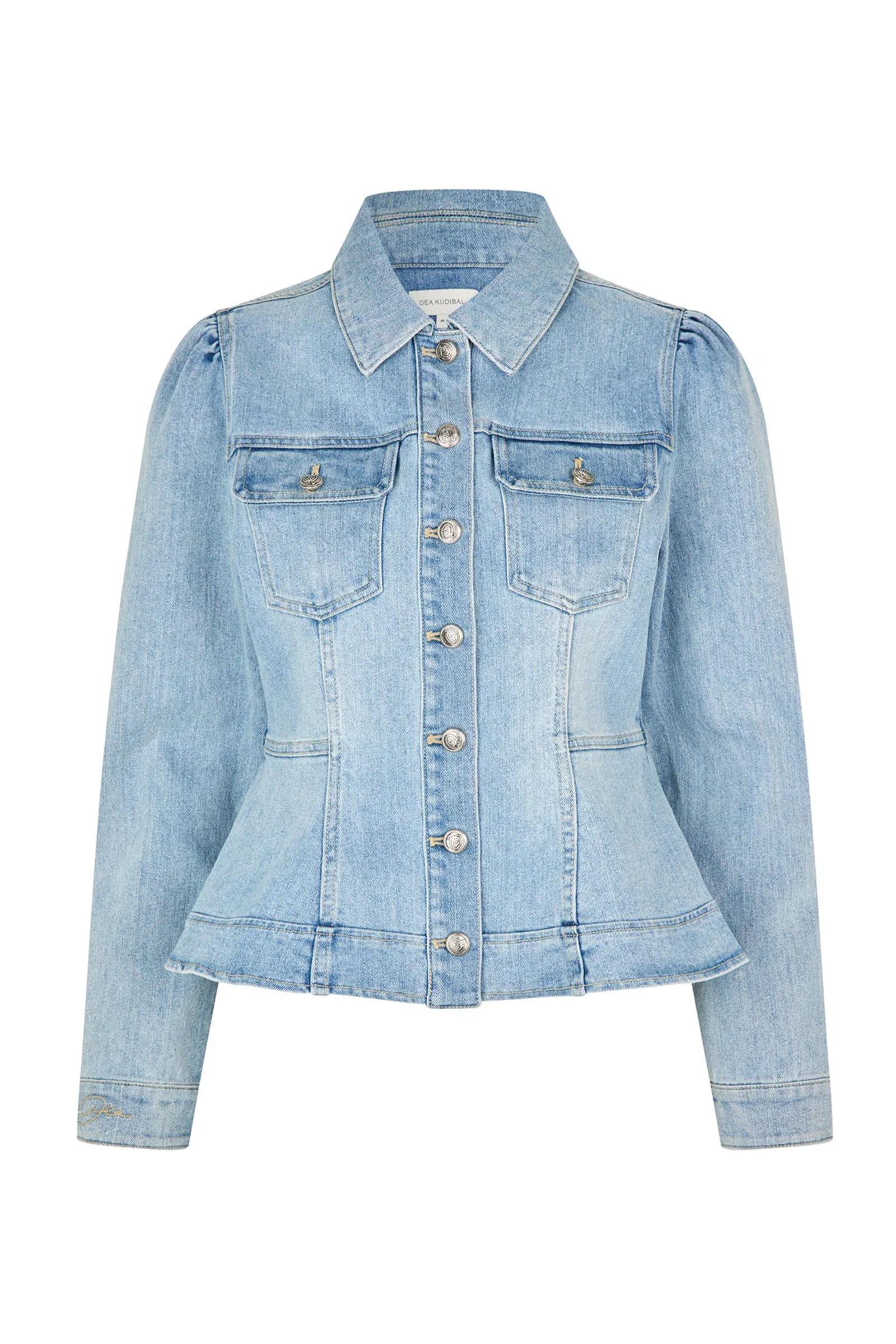 Tidløs denimjakke i blå i et peplumdesign. Bianca kommer i en myk kvalitet med noe stretch, klassisk krage og knappestolpe, lange ermer med noe puff samt to lommer på brystet som røffer den opp litt. Flere delikate detaljer som brodert logo på ermene og øverst i ryggen samt på knappene. En lekker denimjakke som er perfekt til sesongen vi går i møte.
