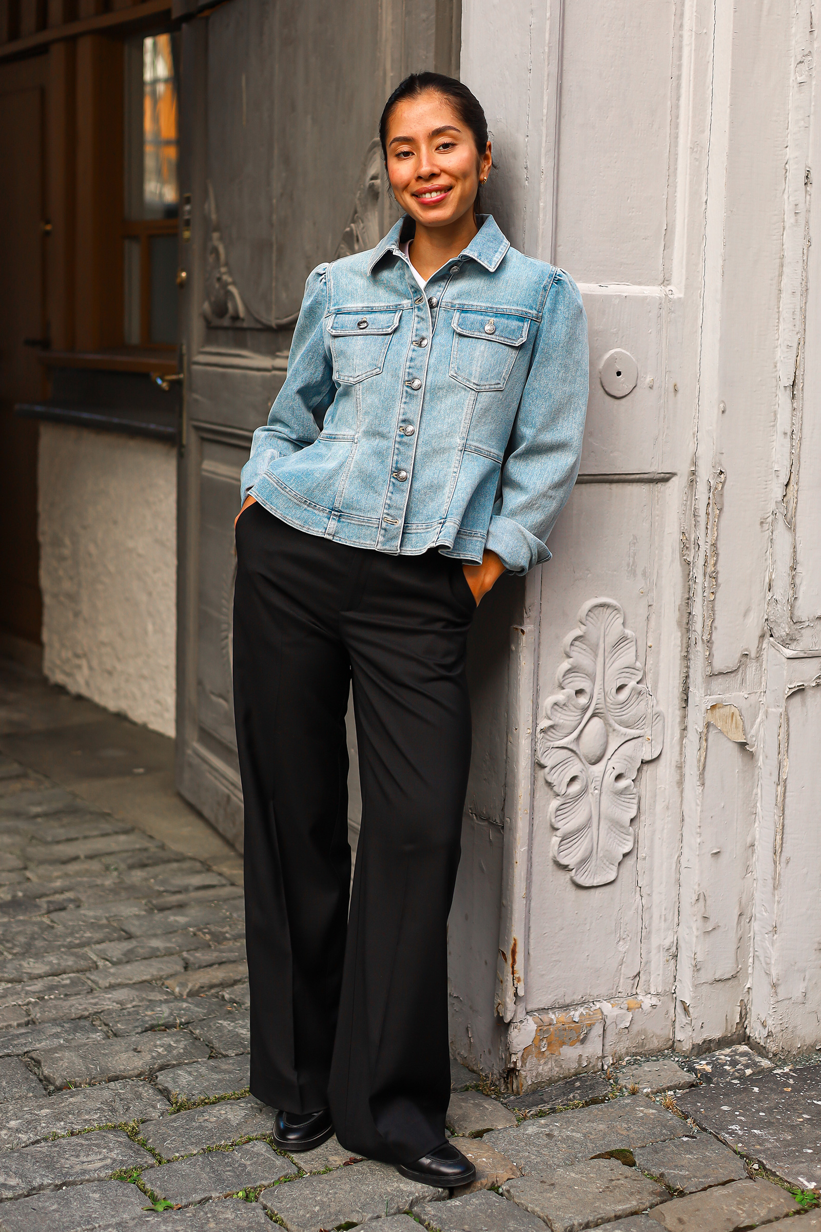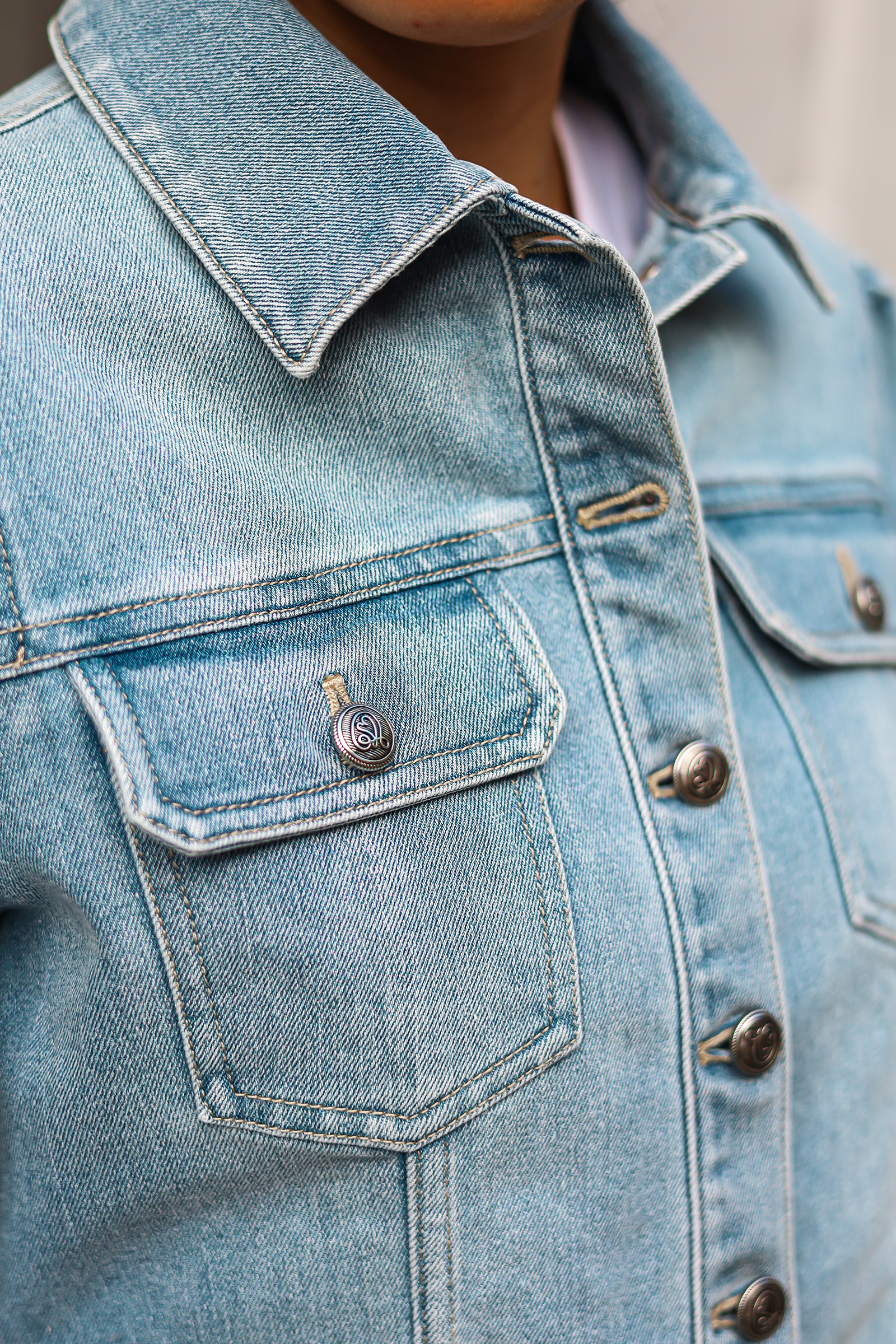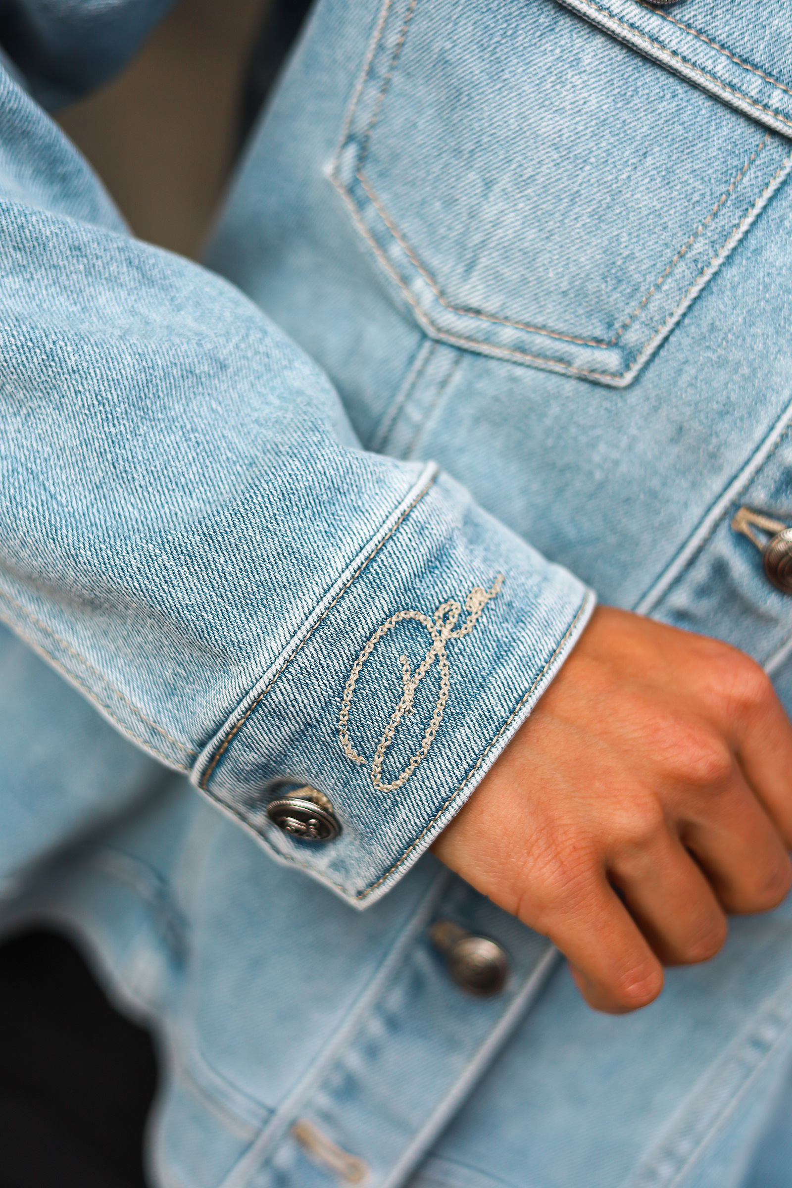 Tidløs denimjakke i blå i et peplumdesign. Bianca kommer i en myk kvalitet med noe stretch, klassisk krage og knappestolpe, lange ermer med noe puff samt to lommer på brystet som røffer den opp litt. Flere delikate detaljer som brodert logo på ermene og øverst i ryggen samt på knappene. En lekker denimjakke som er perfekt til sesongen vi går i møte.