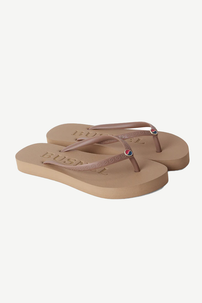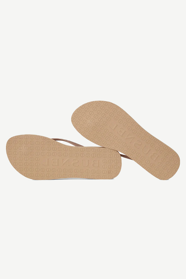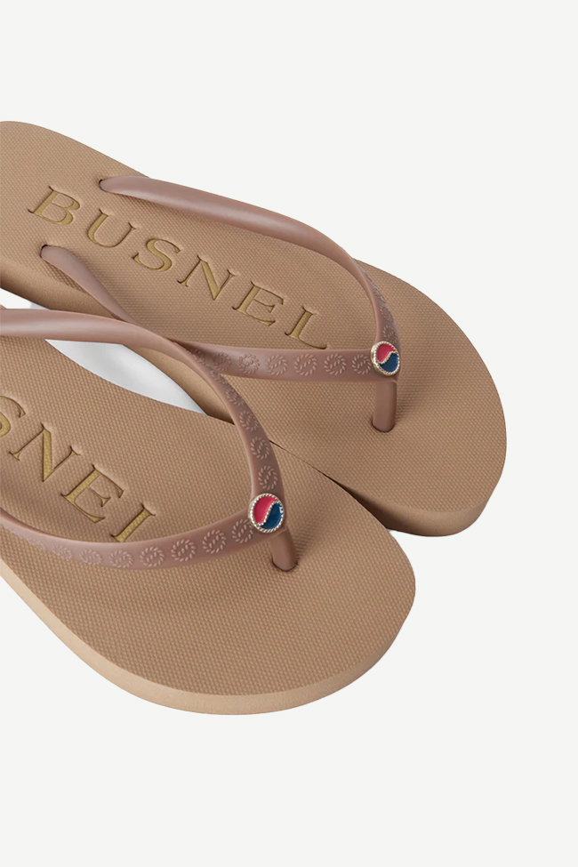 Klassiske flip flop sko i 100% gummi fra kvalitetsmerket Busnel. Vivi Flip Flop har den ikoniske Busnel-logoen fremme på skoen som en delikat detalj, samt tekst i gull på sålen. Perfekt til en dag på stranden!