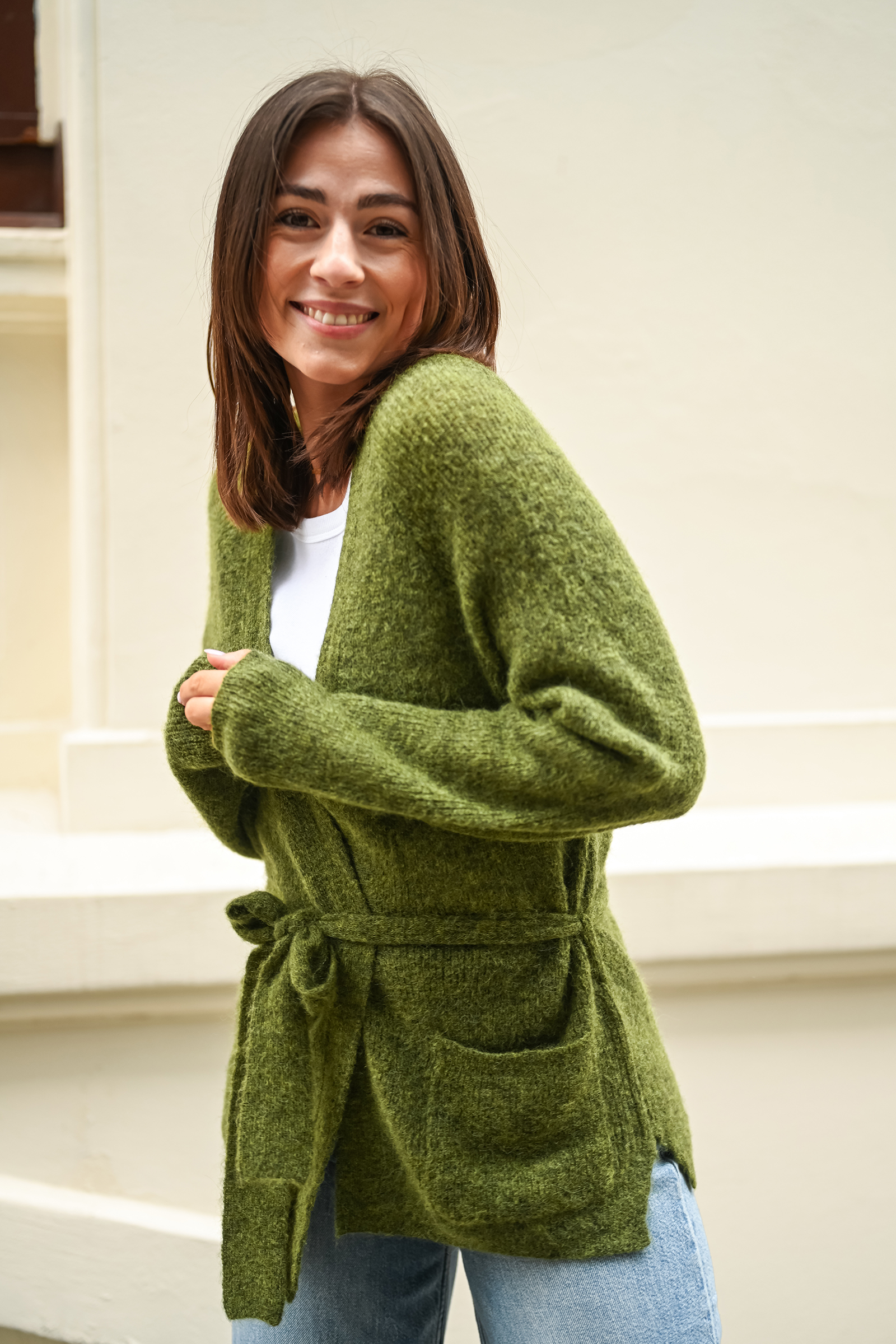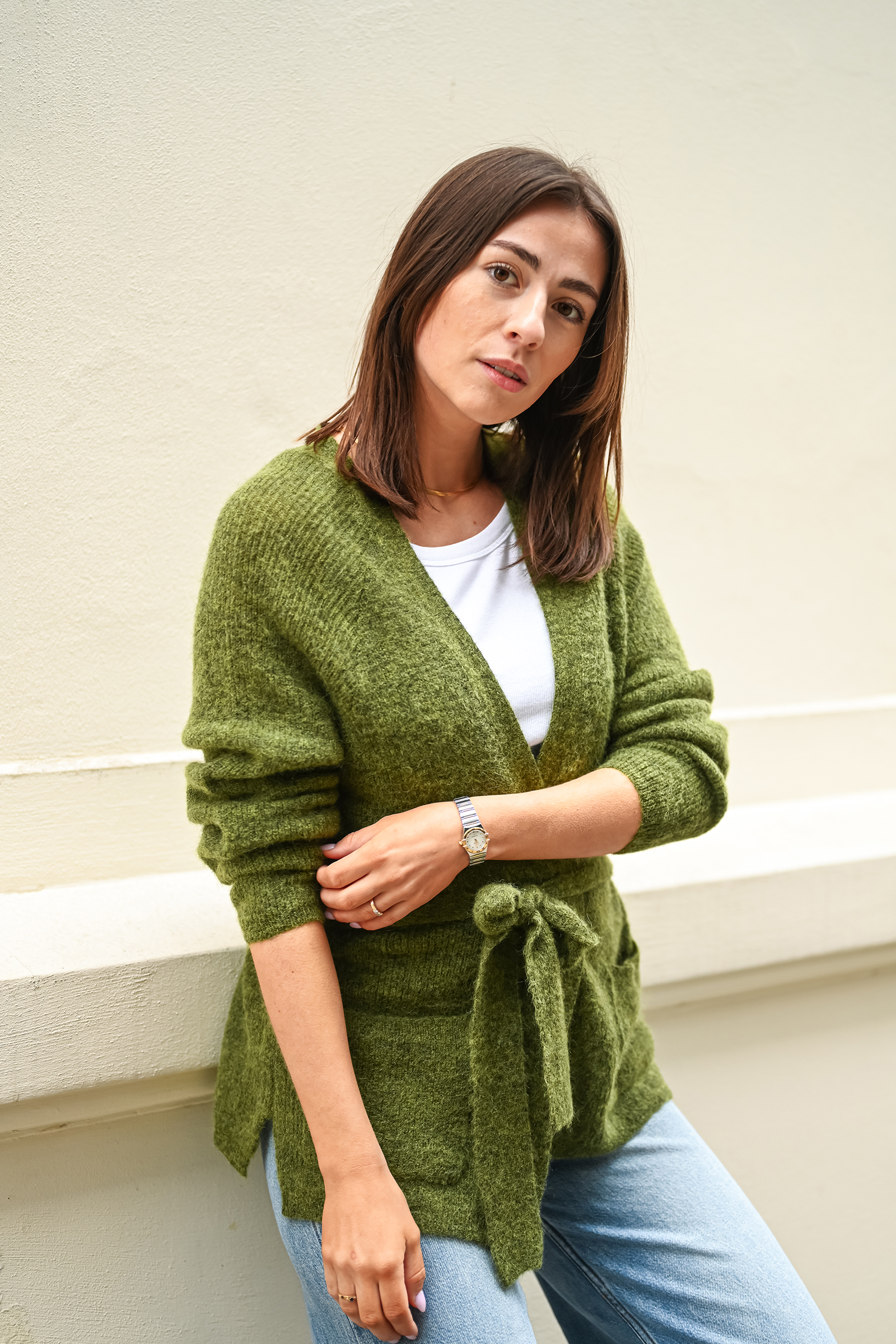 Myk og deilig cardigan fra norske JOHNNYLOVE i en nydelig grønntone! Camille er åpen i front med et belte i midjen som skaper form og fasong til den rette passformen. Lange ermer, ribbestrikkede kanter og to lommer i front. Med sin deilige ullkvalitet av alpakkaull og mohair er dette en varm og behagelig hverdagsgenser som er perfekt til dager hvor du ønsker komfort. Kombiner med et par jeans og sneakers for en tidløs look!