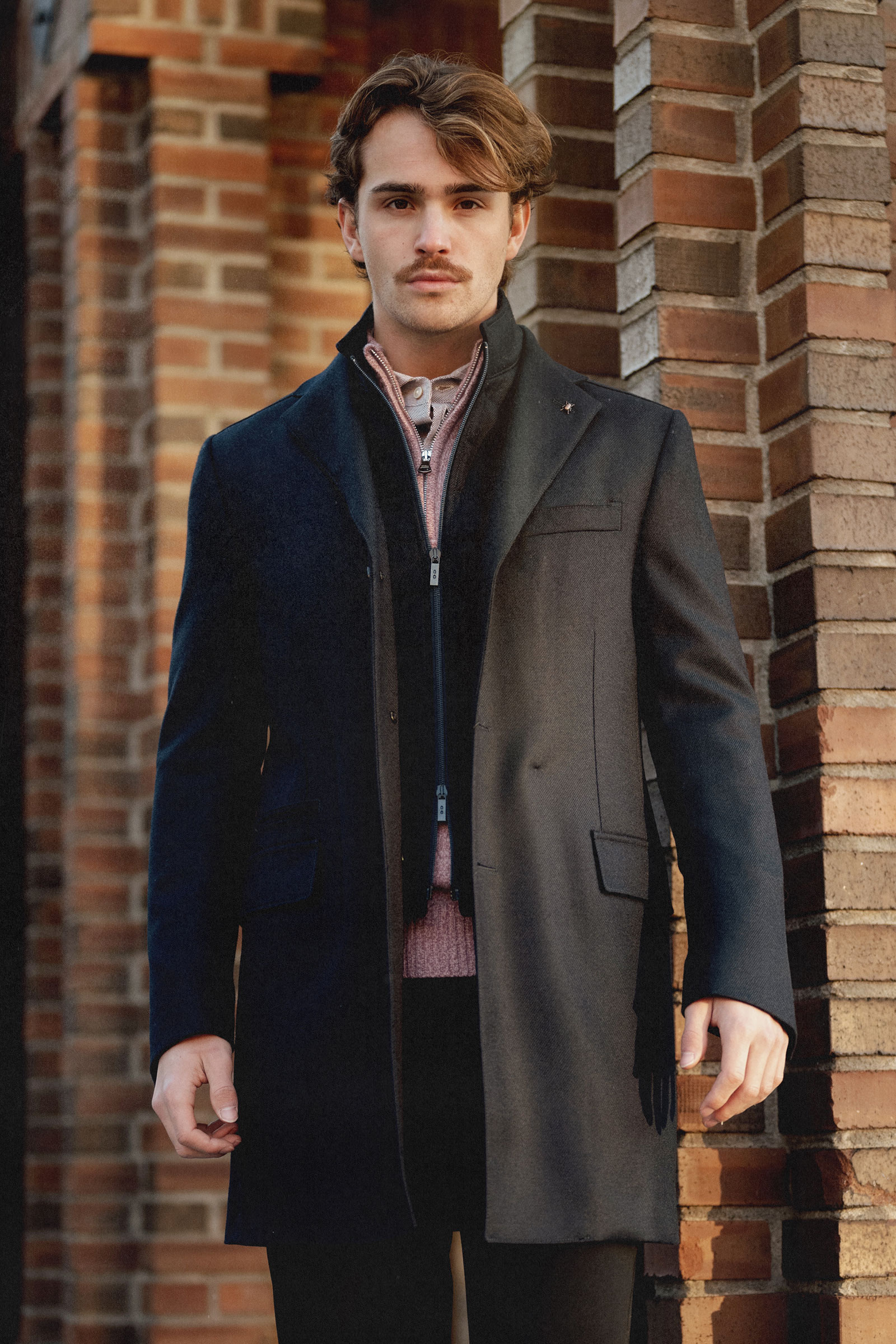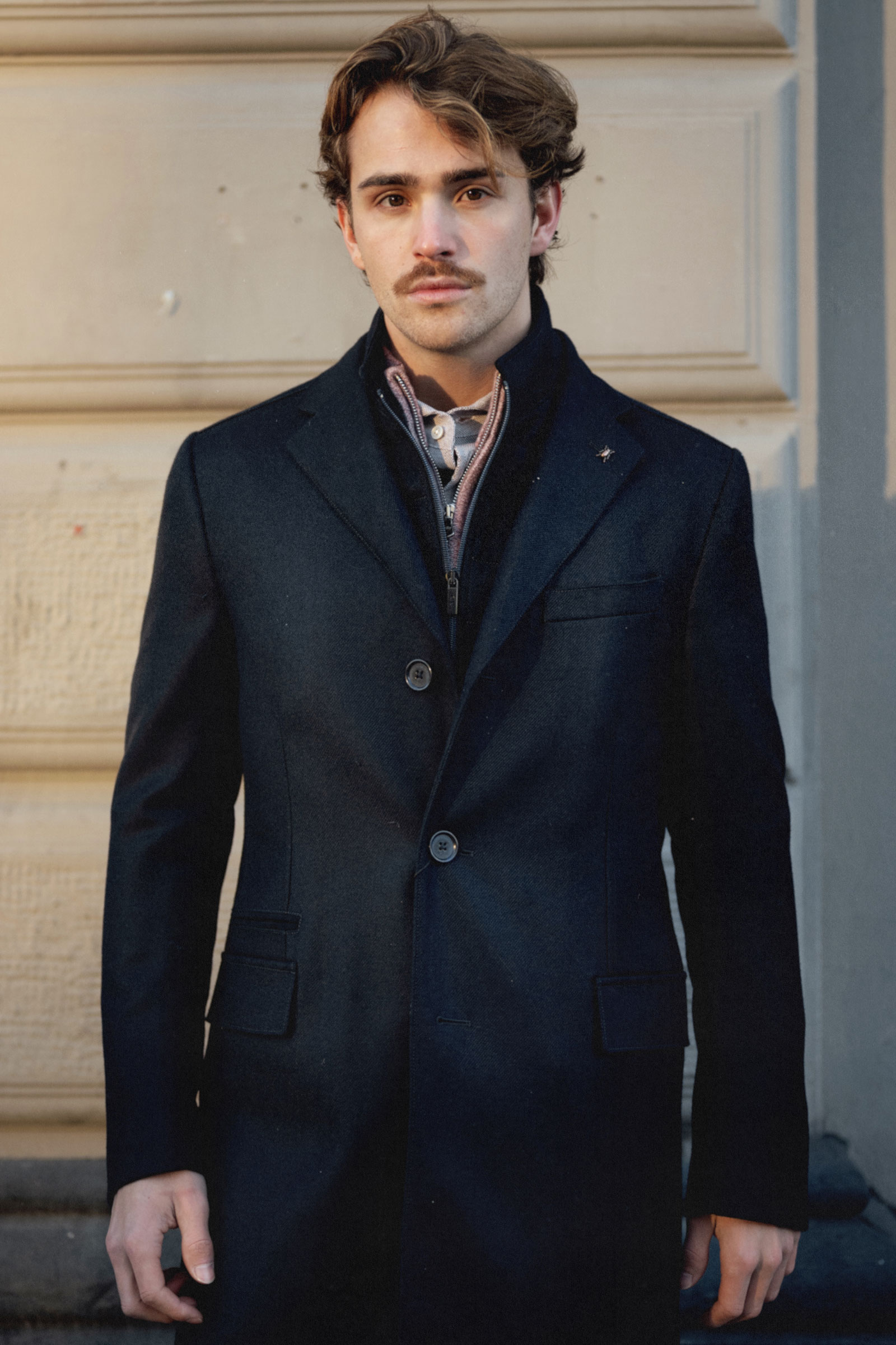 Nydelig og tidløs frakk fra CC Collection Corneliani i mørk blå. Capotto har et klassisk design med en en slim passform, rette linjer, klassisk krage med slag, lange ermer med mansjetter samt to lommer i front og en brystlomme. Jakken kommer med en stilig vri med vest under som har høy krage og polstring hvilket sørger for god varme på kjølige høst- og vinterdager. Lukkes enkelt med to knapper i front og glidelås på vesten under.
