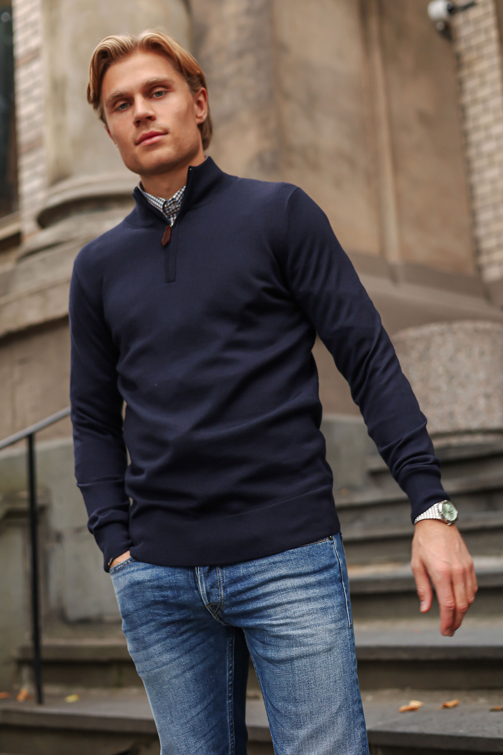Stilren og klassisk half-zip fra vårt egne merke I´m Branded i mørk blå! Genseren kommer i en rett passform, half-zip i front og ribbestrikk ved linning, erme og hals. En nydelig genser å bruke alene – eller over skjorter, for mer formelle looks. Den deilige merinokvaliteten gjør den både behagelig, varm og slitesterk.