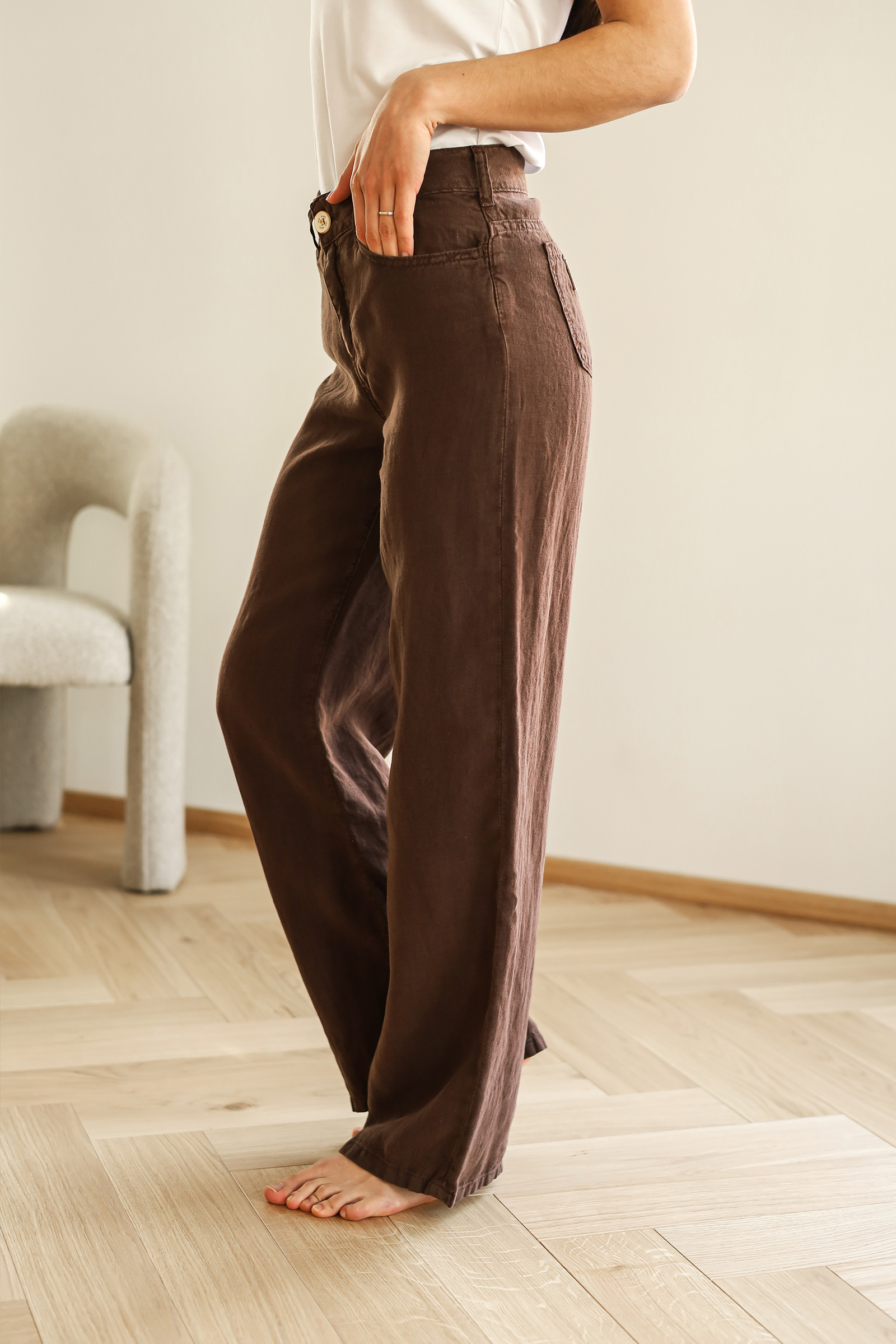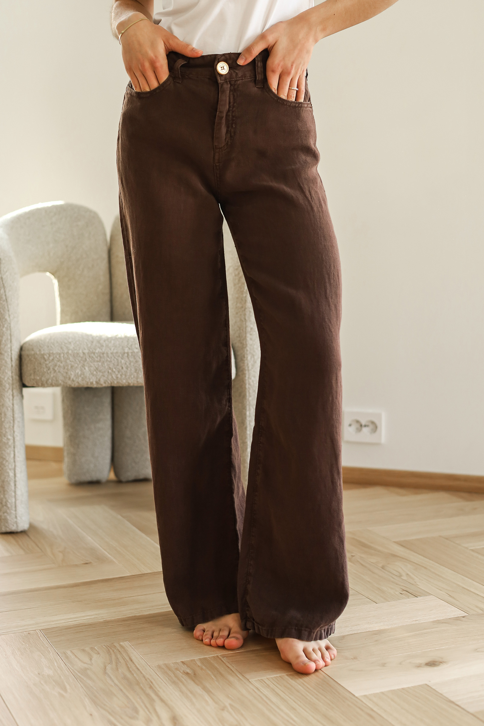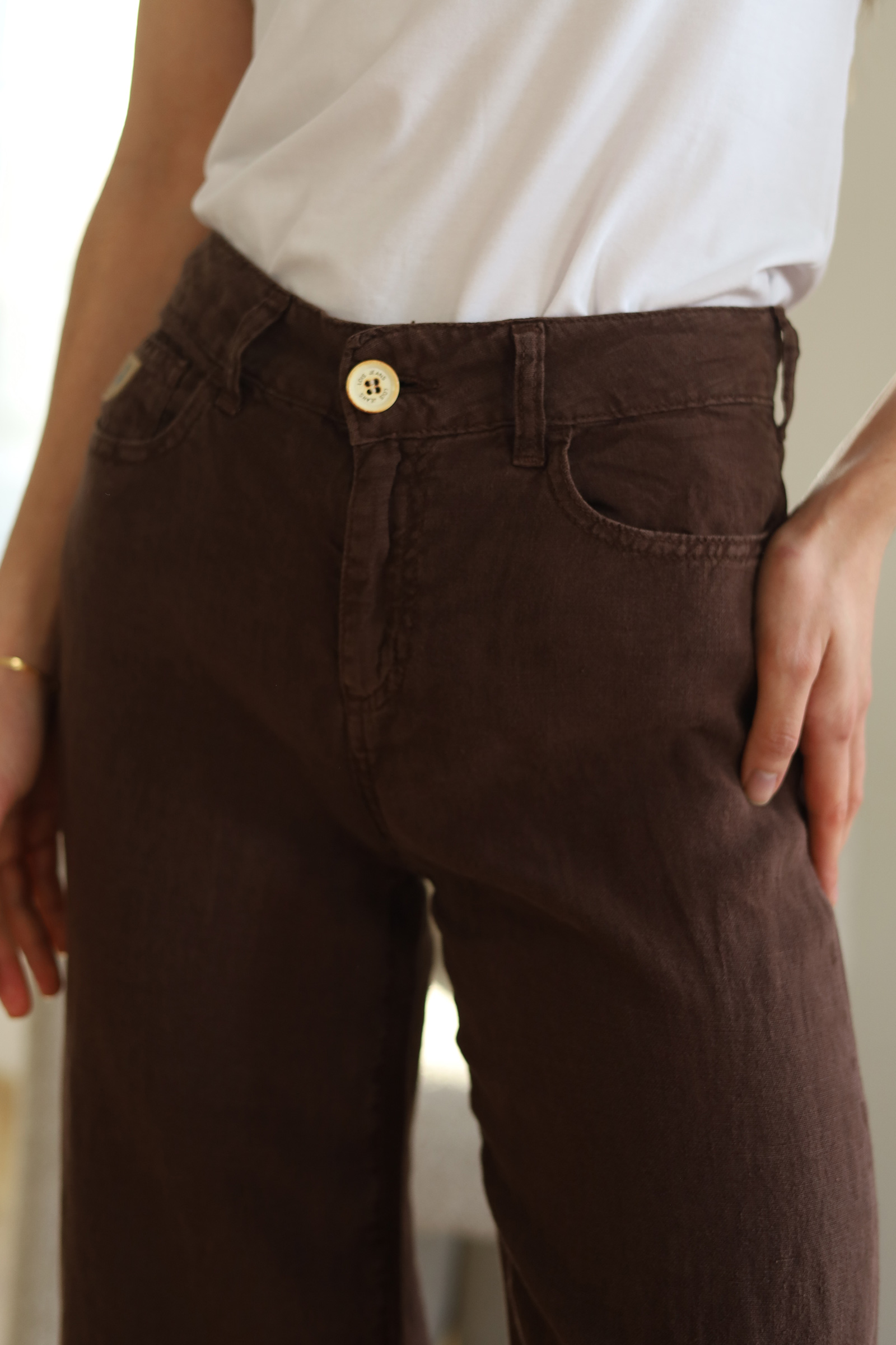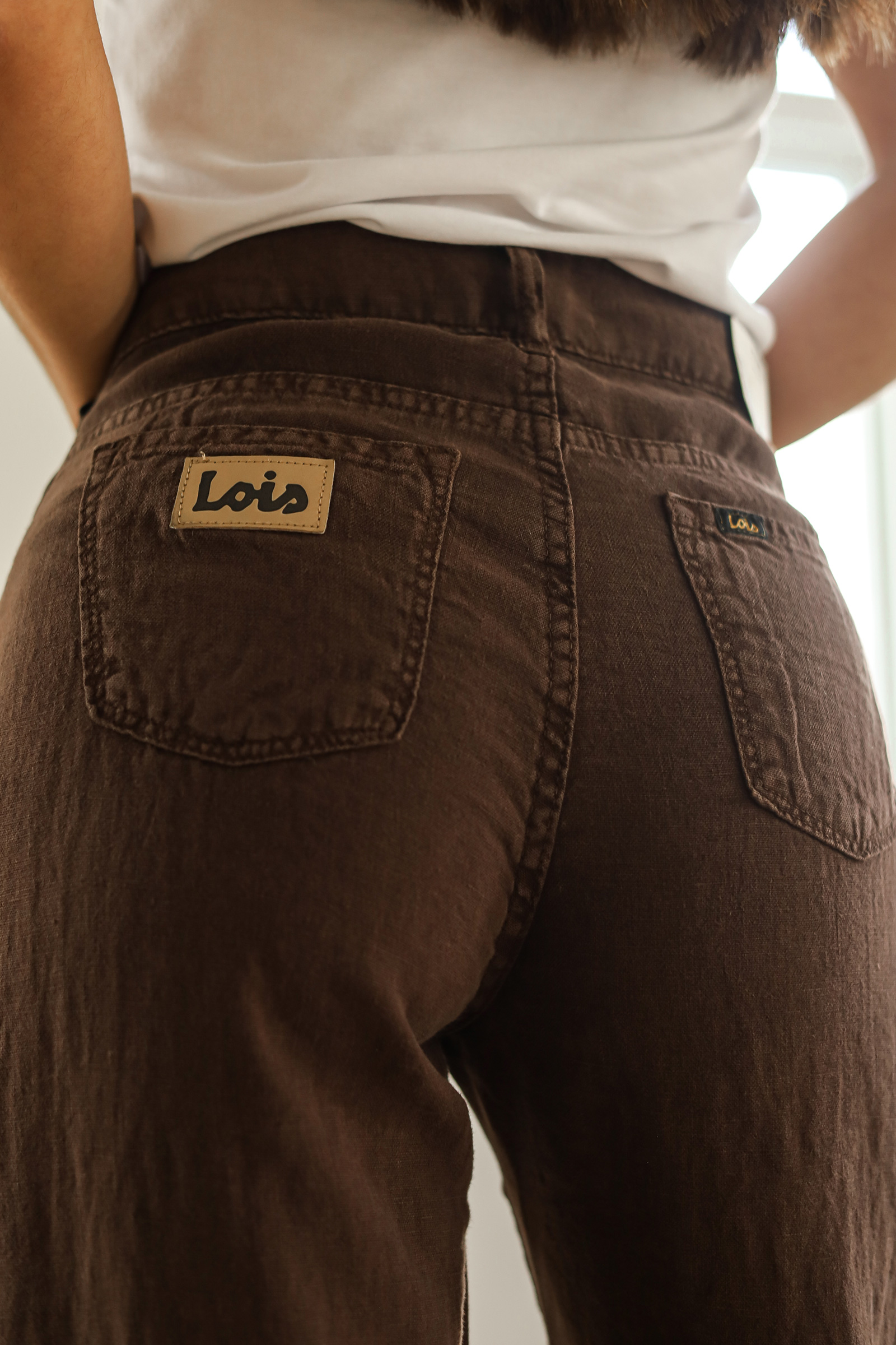 Perfekte sommerbukser fra eksperten Lois Jeans i en av årets trenfarger: mørk brun! Denne culotte-buksen er laget av 100% lin, har 5 lommer, beltehemper og knappe-og glidelåslukking. Buksen har en noe avslappet passform og rette ben. Kombiner med en linskjorte for et luftig og behagelig antrekk på varme dager, eller med en bluse og hæler for et pyntet antrekk.