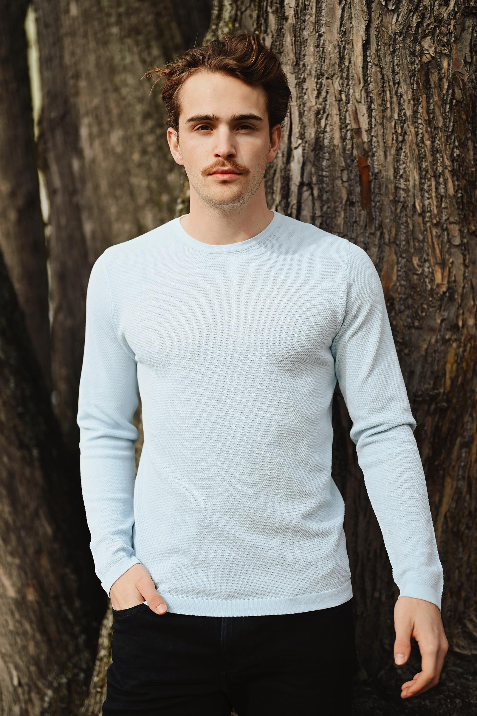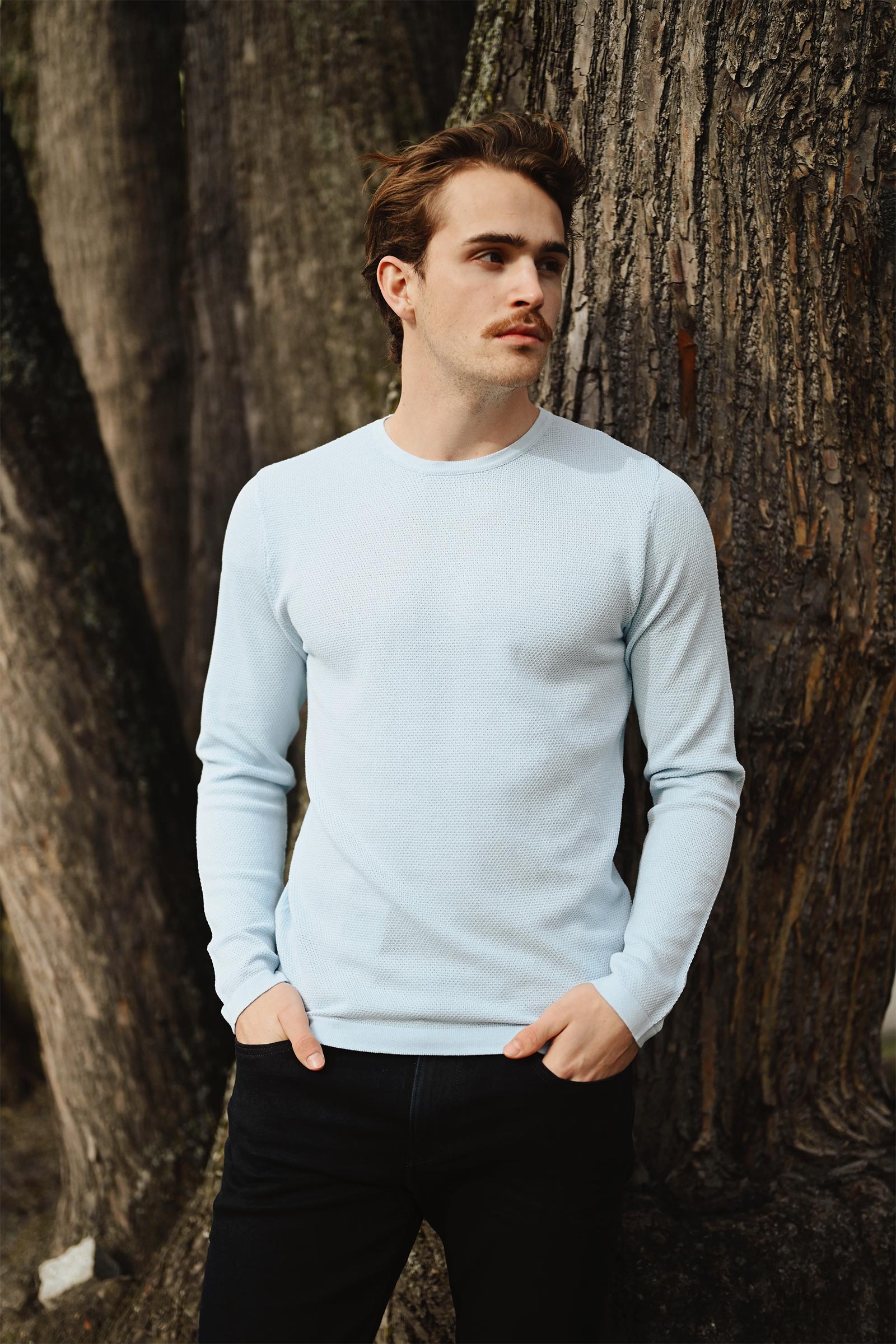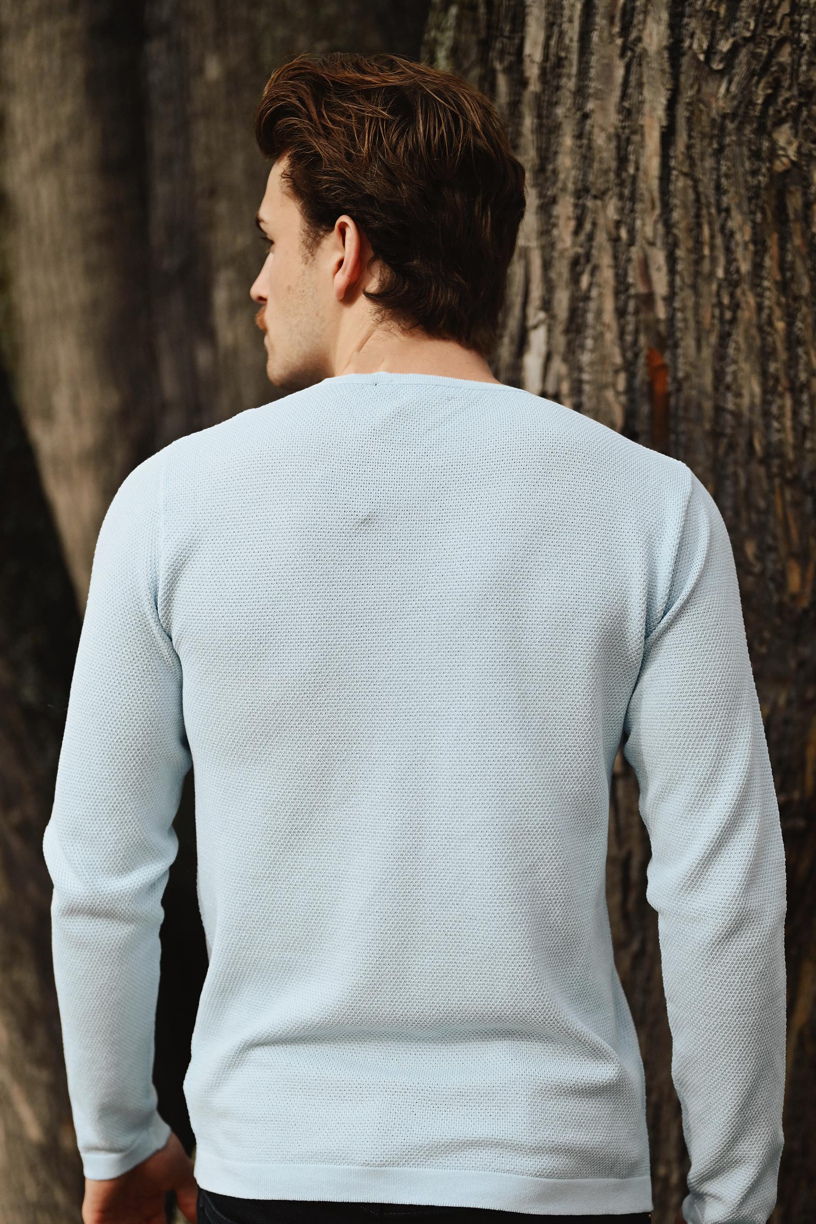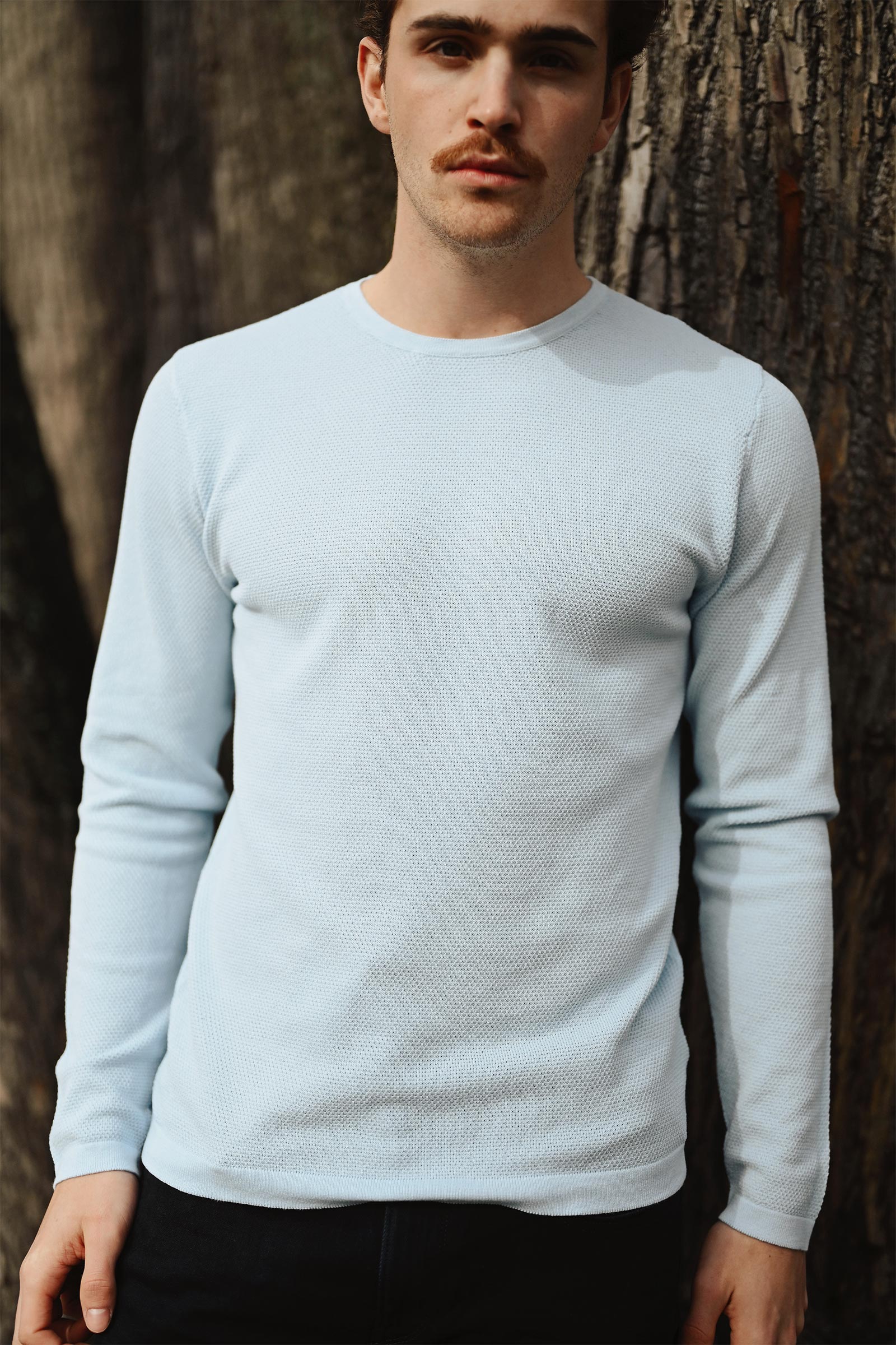 Klassisk langermet strikkegenser i en frisk lys blå farge fra Daniele Fiesoli. Paricollo har lange ermer, rett passform, rund hals og ribbestrikket hals. Genseren er strikket i 100% børstet bomull som gjør den myk og behagelig på, og egner seg godt til varmere dager.