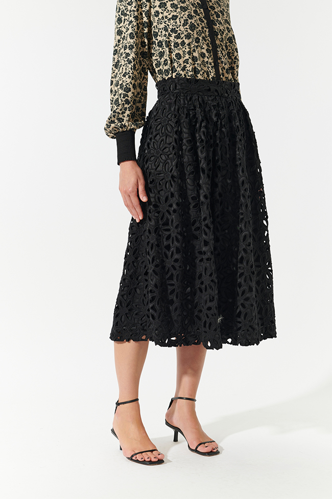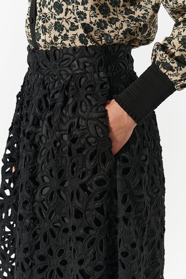 AnonaDea er et elegant skjørt fra Dea Kudibal som egner seg like fint til formelle anledninger som til en dag på kontoret. Skjørtet har vakre engelske blonder som gir et romantisk uttrykk, er A-linje formet, har sidelommer og lengde til leggen. Kombiner skjørtet med en skjorte og blazer eller en tubetopp til fest!