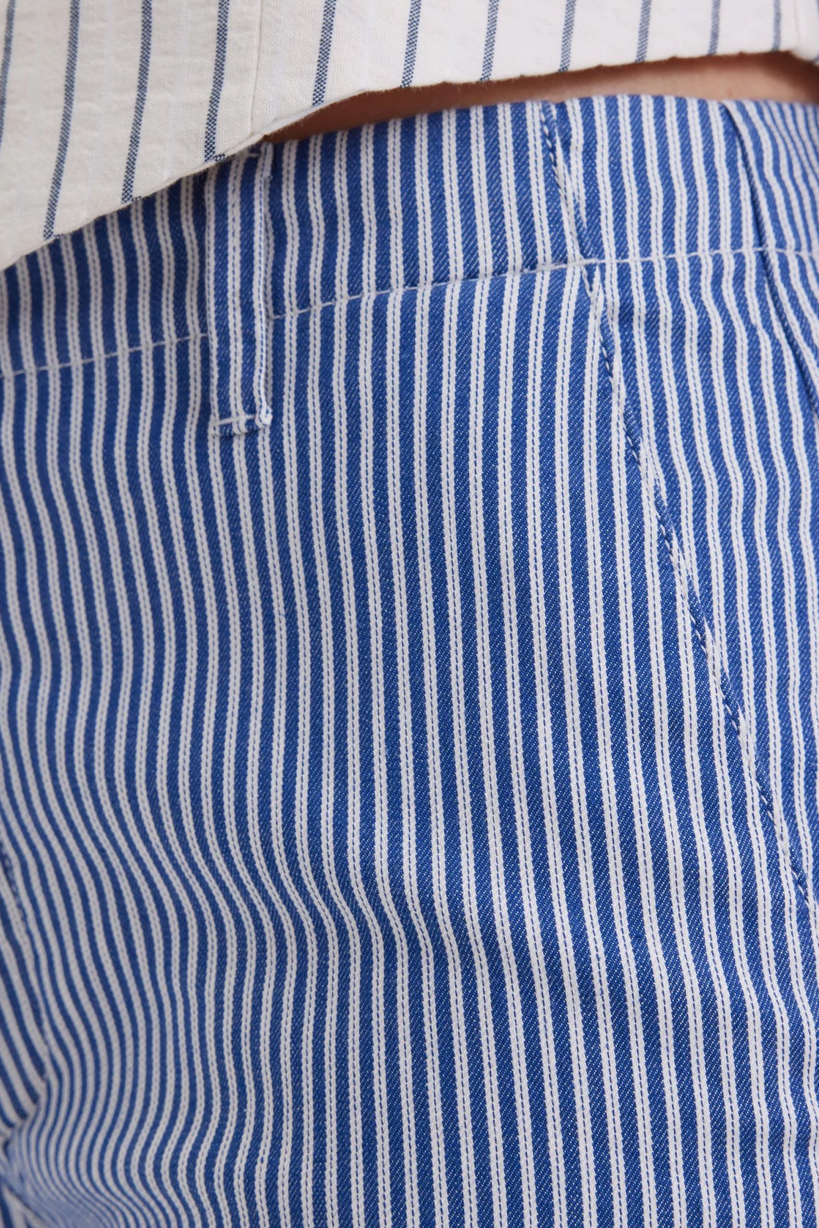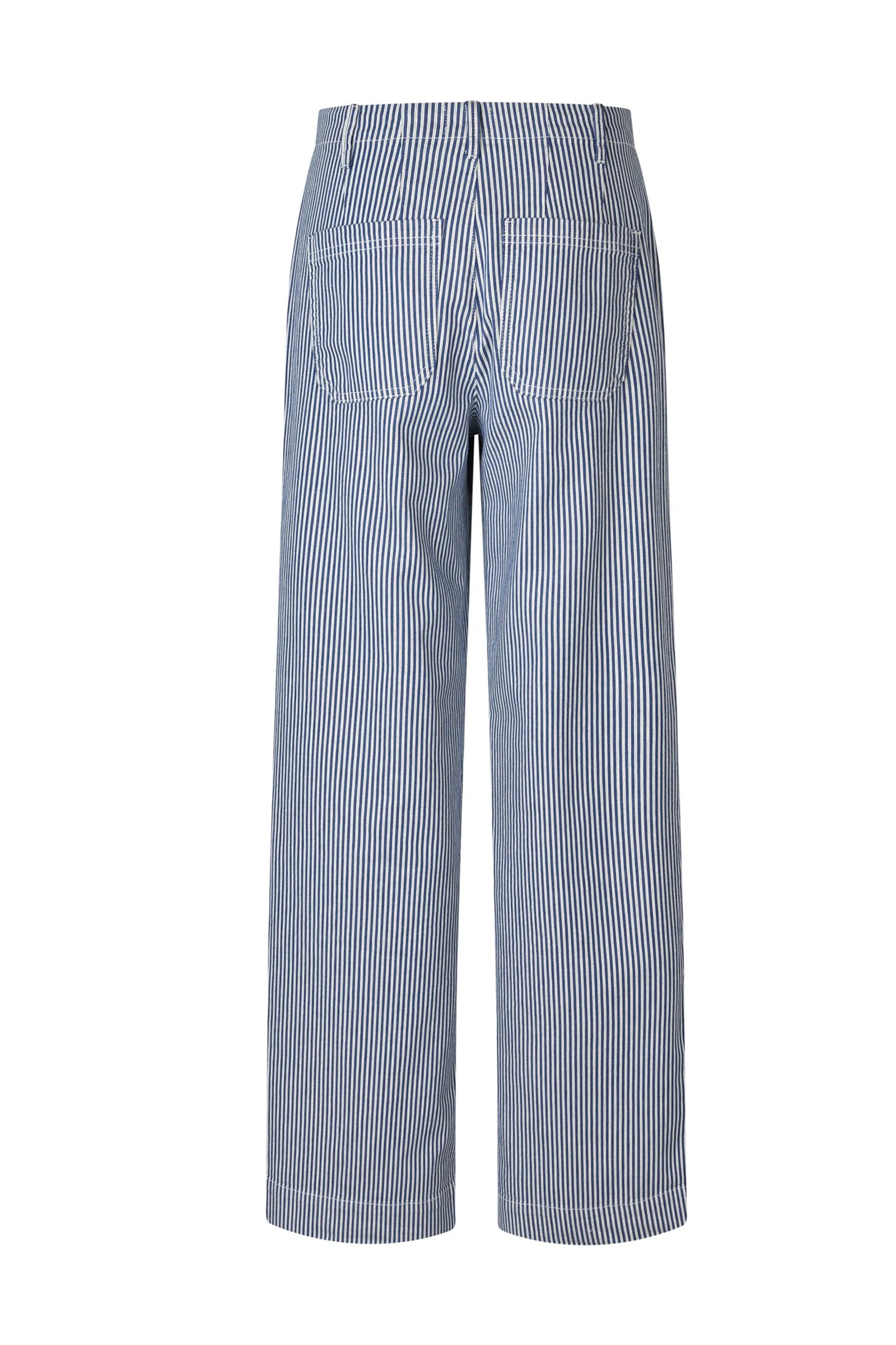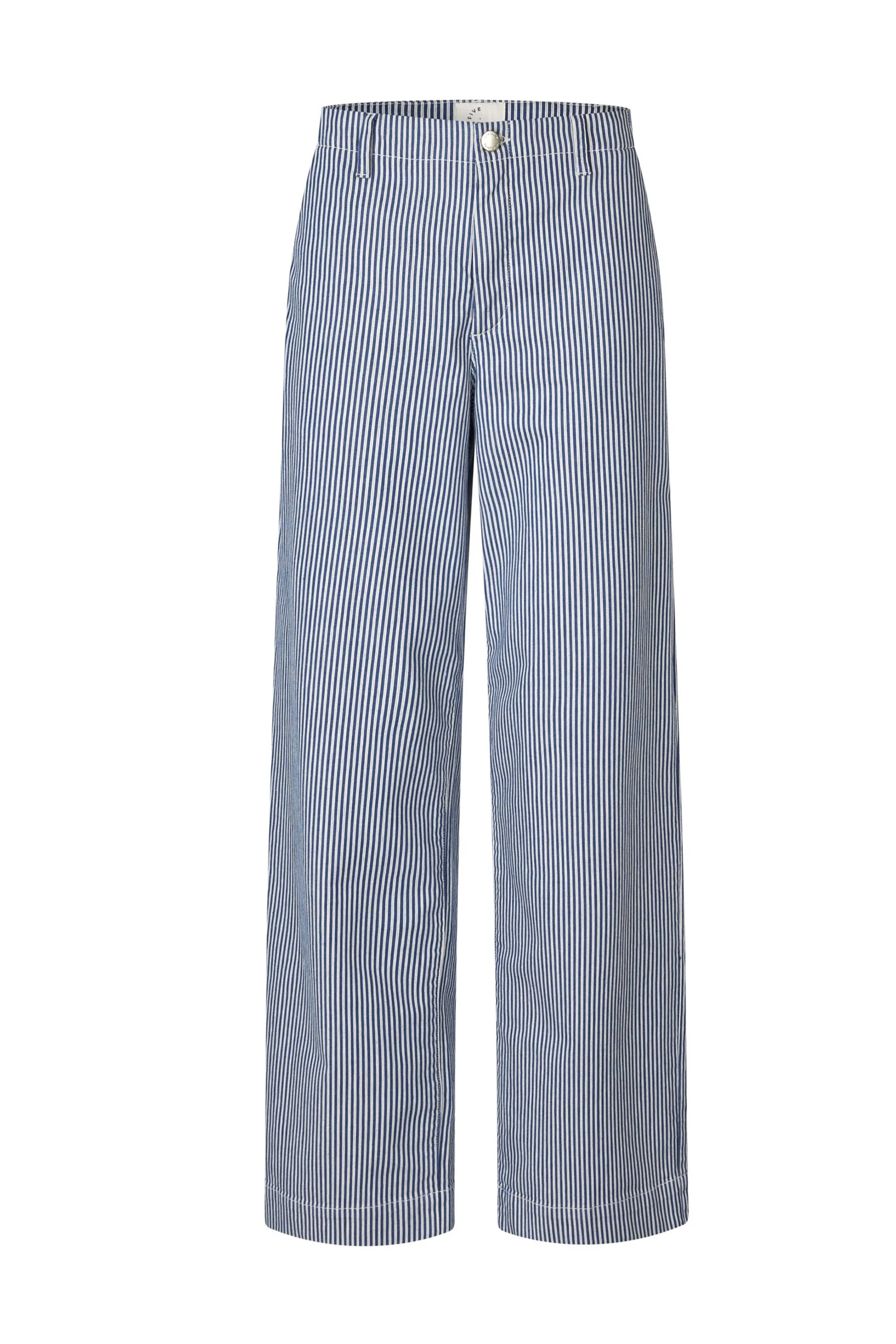 Trendy og kul bukse fra vårt nye merke Five Units med blå striper. Erica kommer i et mykt materiale med god stretch og en flatterende pasform med vide ben og en bred kant nederst. Buksen er ment for å sitte lavt på livet, men kan fint sizes ned en størrelse for å få den høyere på livet. Sitter middels høyt i livet, beltehemper i linningen og lukkes med knapp og glidelås. Med sine delikate striper er dette en bukse som er perfekt til sesongen vi går i møte!