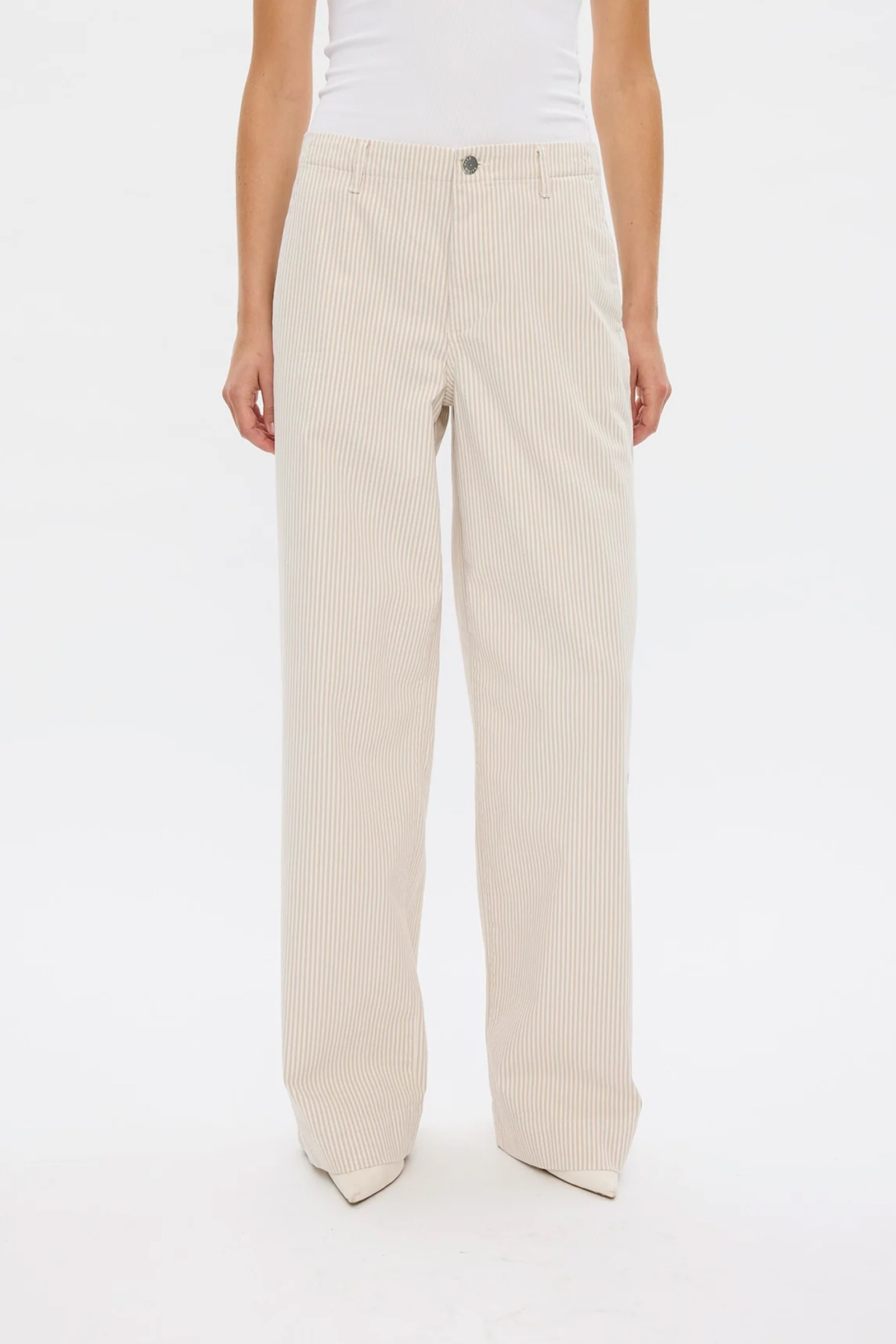 Kulere bukse fra vårt nye merke Five Units med lyse striper. Erica kommer i et mykt materiale med god stretch og en flatterende pasform med vide ben og en bred kant nederst. Buksen er ment for å sitte lavt på livet, men kan fint sizes opp for å få den høyere på livet. Sitter middels høyt i livet, beltehemper i linningen og lukkes med knapp og glidelås. Med sine delikate striper er dette en bukse som er perfekt til sesongen vi går i møte!