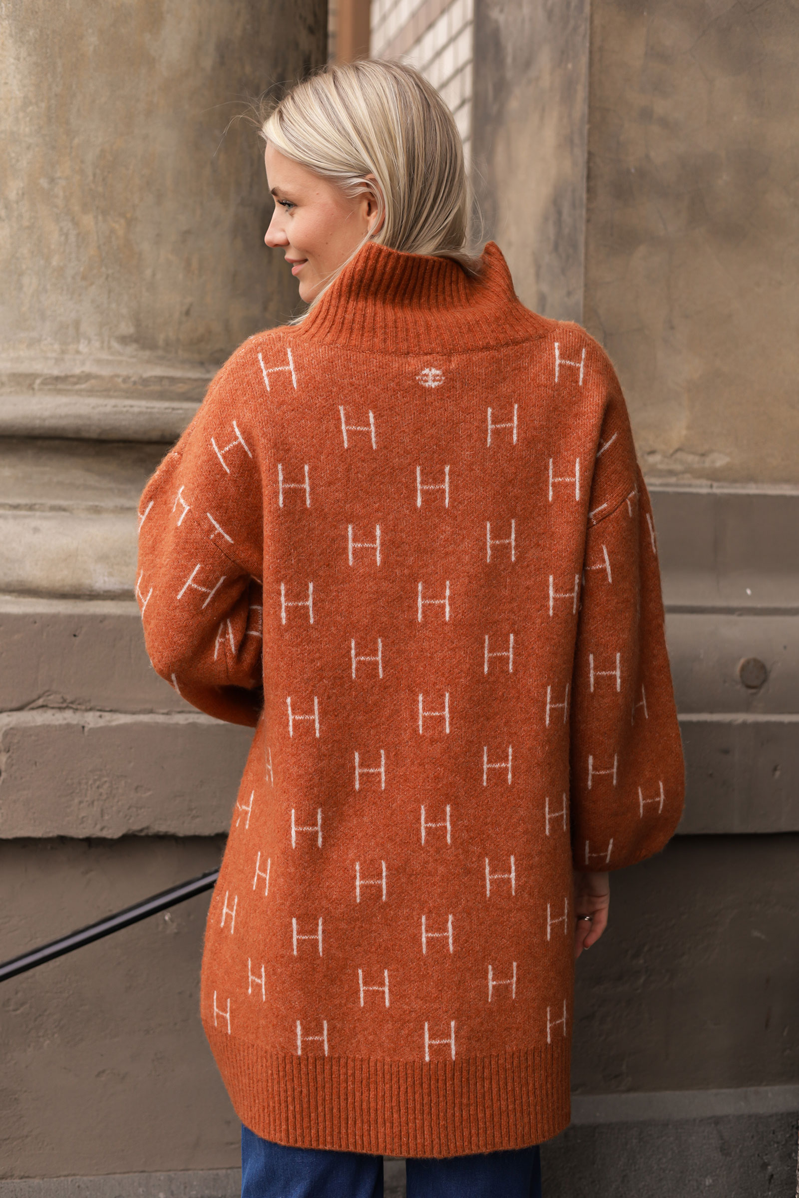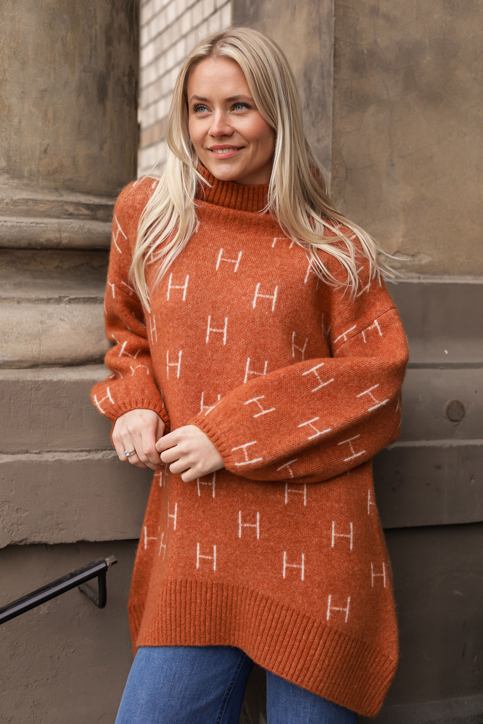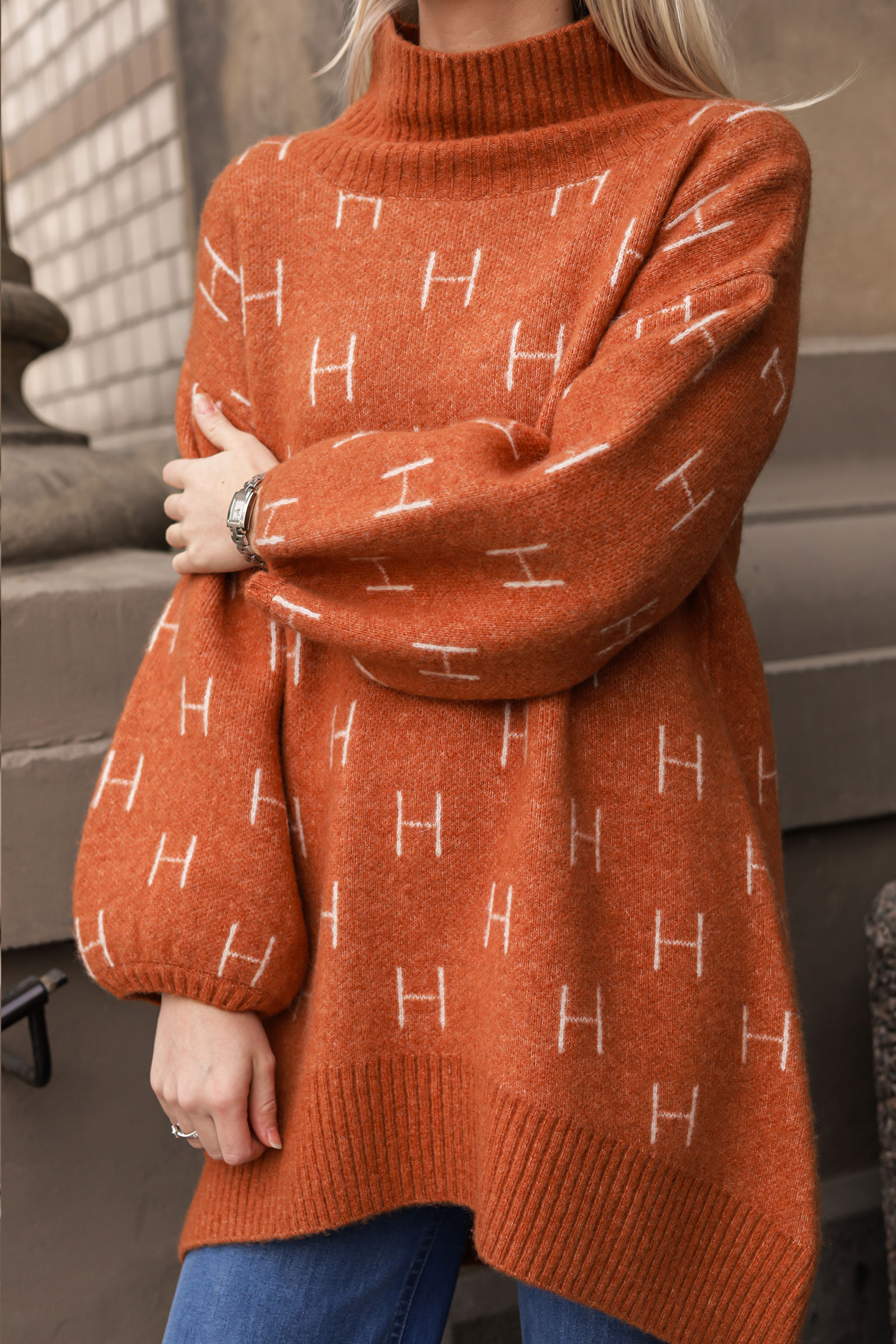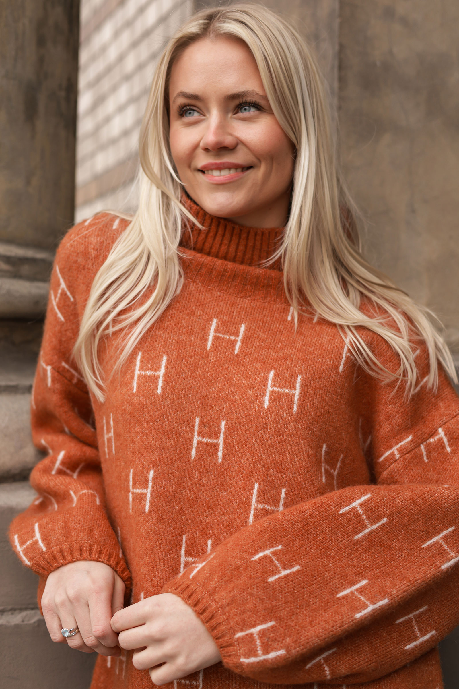 Fam genseren fra Hést har nå kommet i en ny farge som er perfekt til høsten! Genseren kommer i en herlig kvalitetsblanding av blant annet mohair og merinoull som gjør den varm og behagelig, samt nylon som gjør den slitesterk. Dekorert med signatur H-en over hele genseren, samt droppede skuldre og brede vrangborder i hals, falde og ermer. Genseren har en oversized passform med høy hals, samt voluminøse ermer og en lengre falde bak. En deilig og myk genser til sesongen vi går i møte!