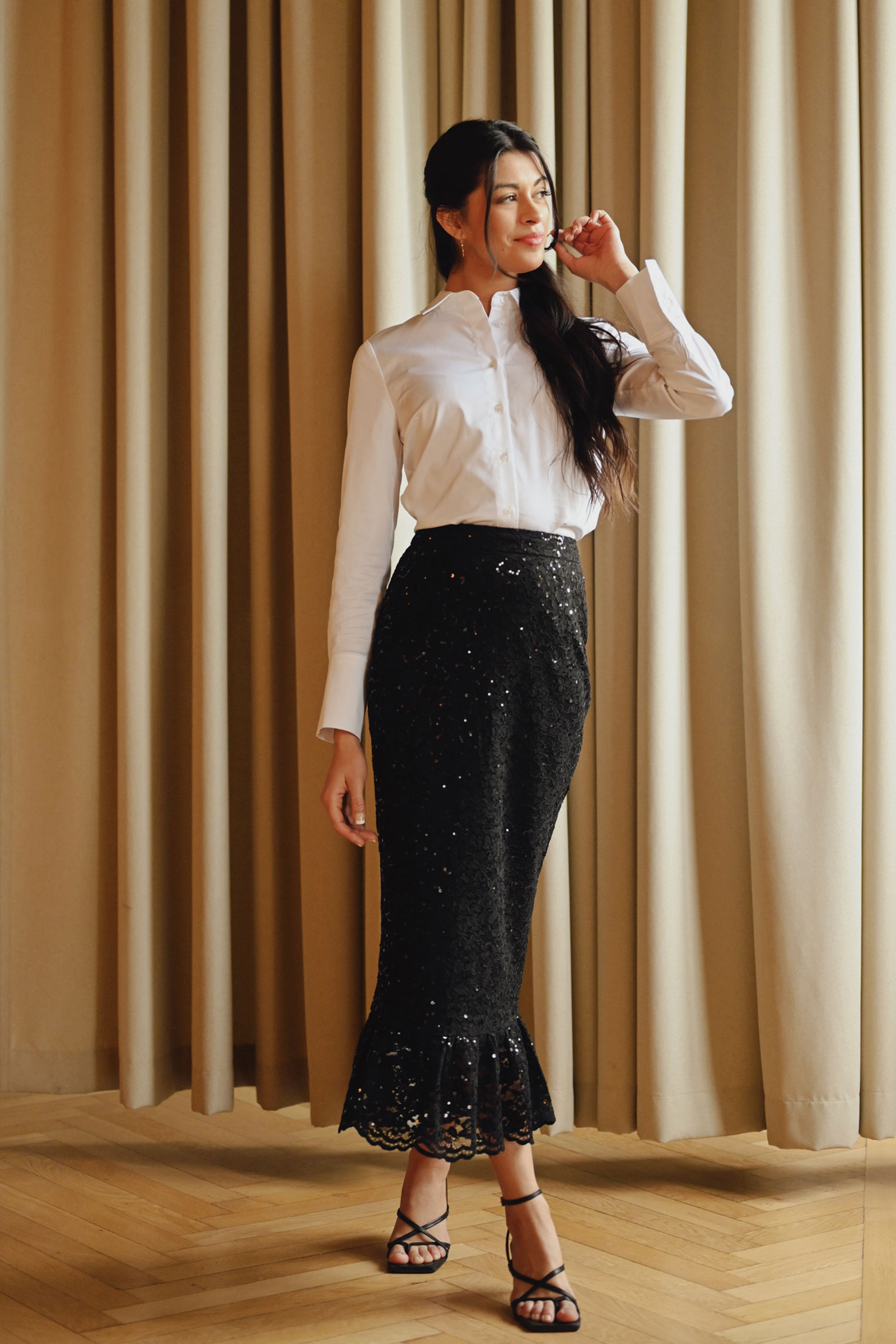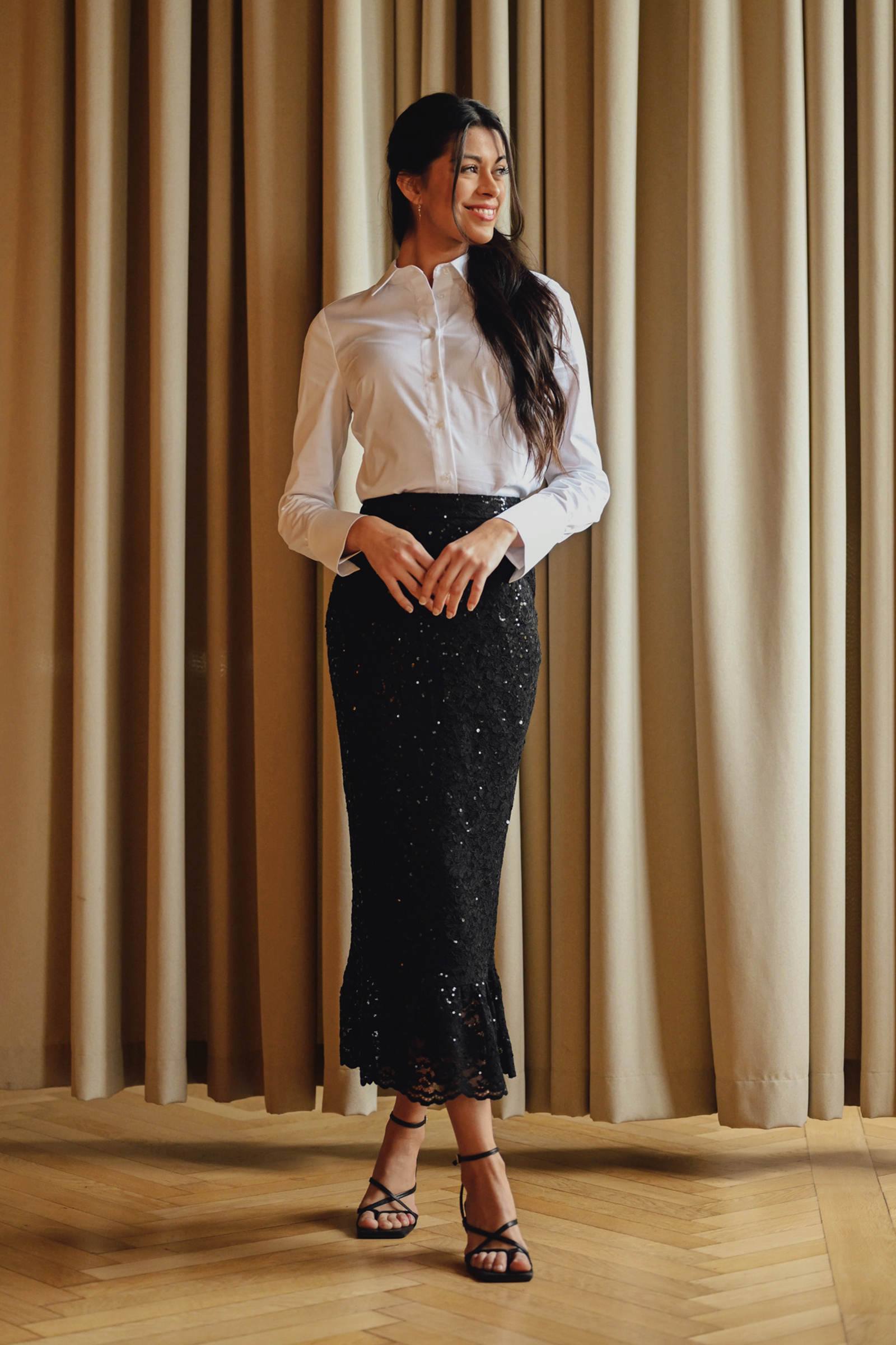 Er du klar for festsesongen? Da bør du ta en titt på dette nydelige skjørtet fra Love Lolina! Freya Maxi Skirt er et tettsittende, flatterende blondeskjørt med skimrende paljetter – perfekt for julebord og festlige anledninger. Skjørtet har en elegant havfruefasong som smyger seg inntil kroppen og folder seg vakkert ut nederst i nydelige blonder. Style det med en pyntet topp og et par hæler for en komplett og glitrende festlook!