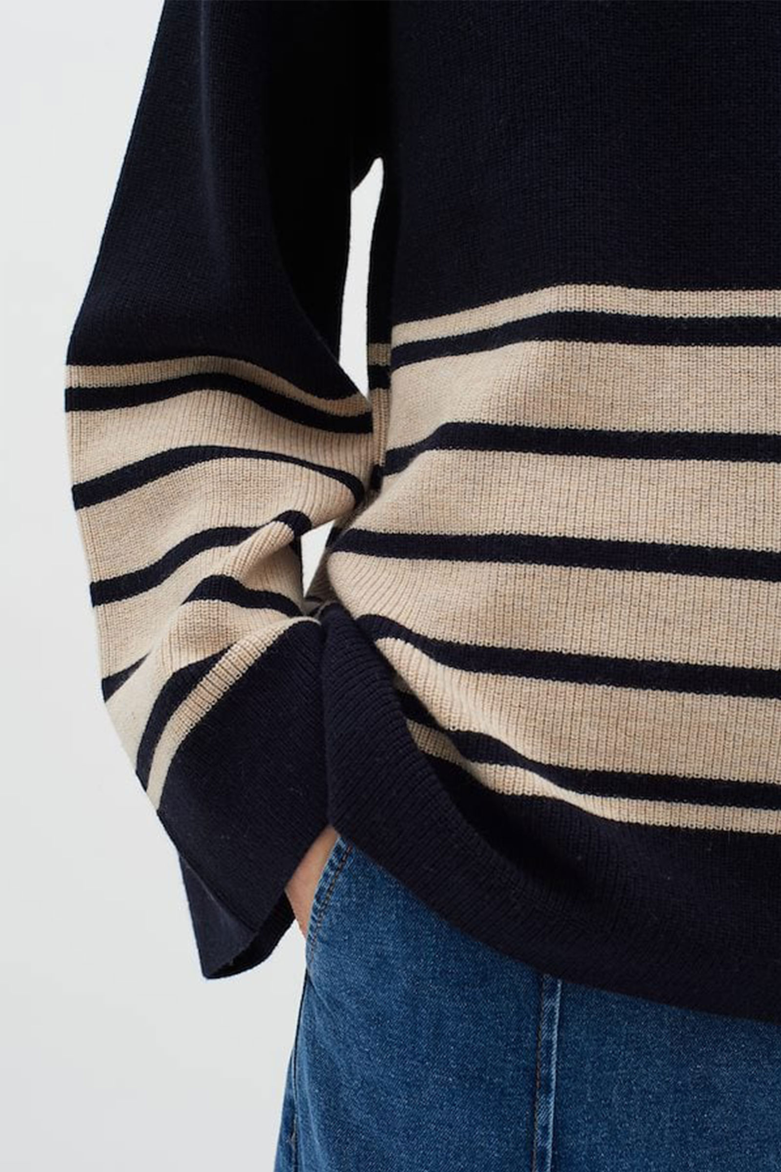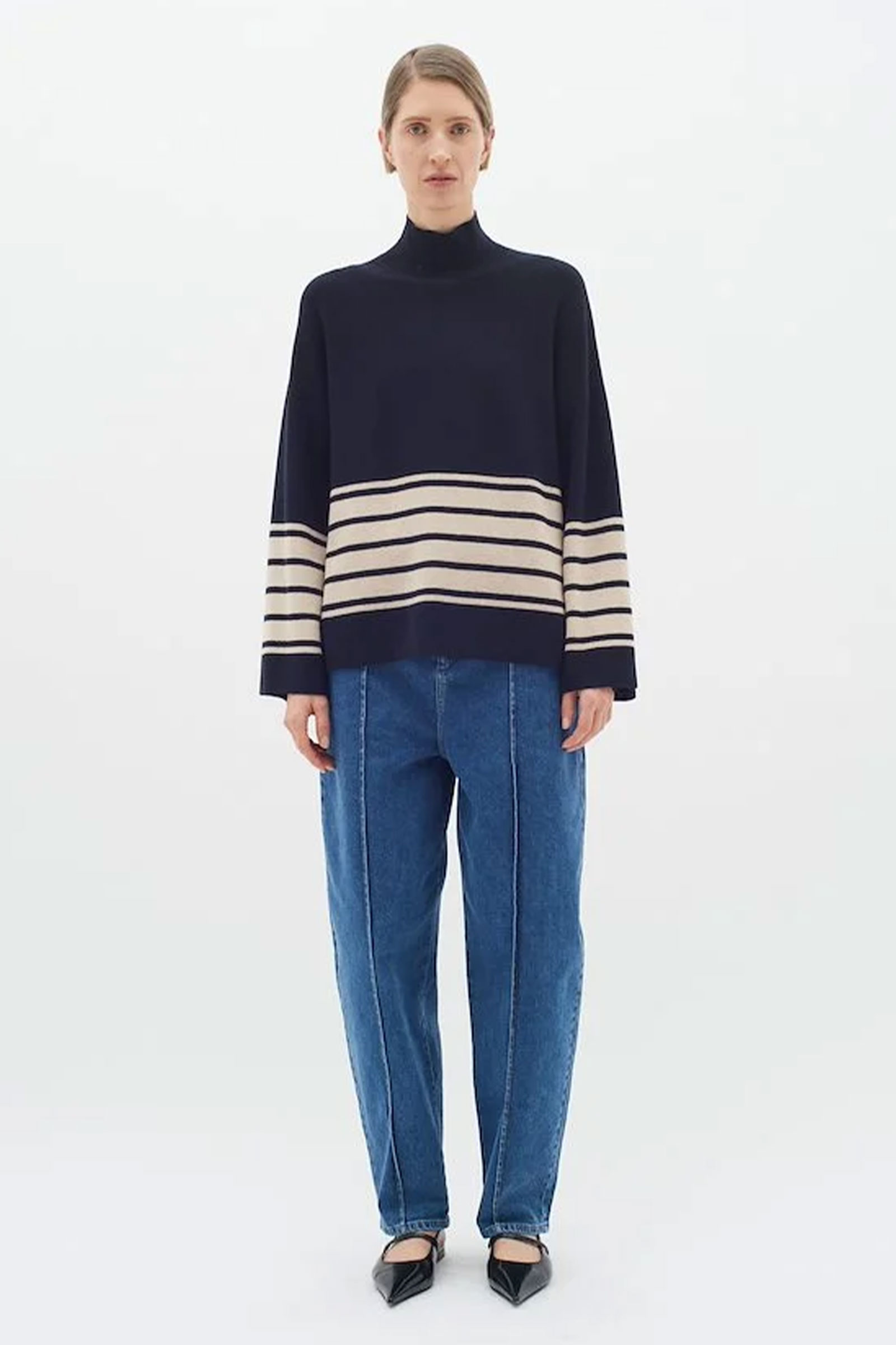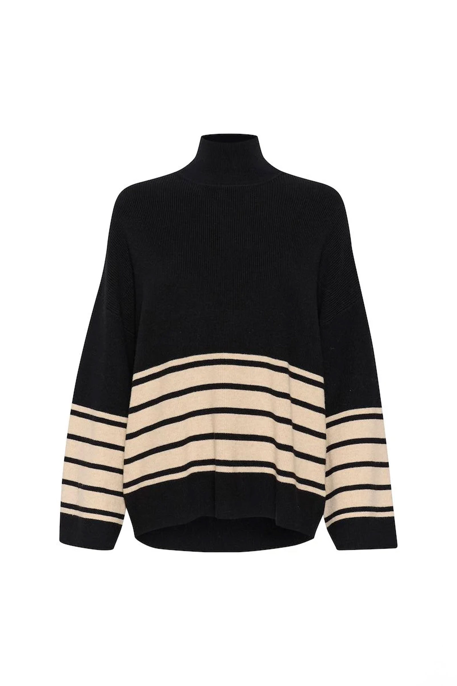 En nydelig genser fra InWear med moderne og trendy striper. Gittel Pullover har en høy hals, lange og rette ermer samt en avslappet passform hvilket gjør genseren både elegant og komfortabel på samme tid. De delikate stripene i beige understreker den tidløse looken som gjør at den er like fin til jeans som til dressbukser.