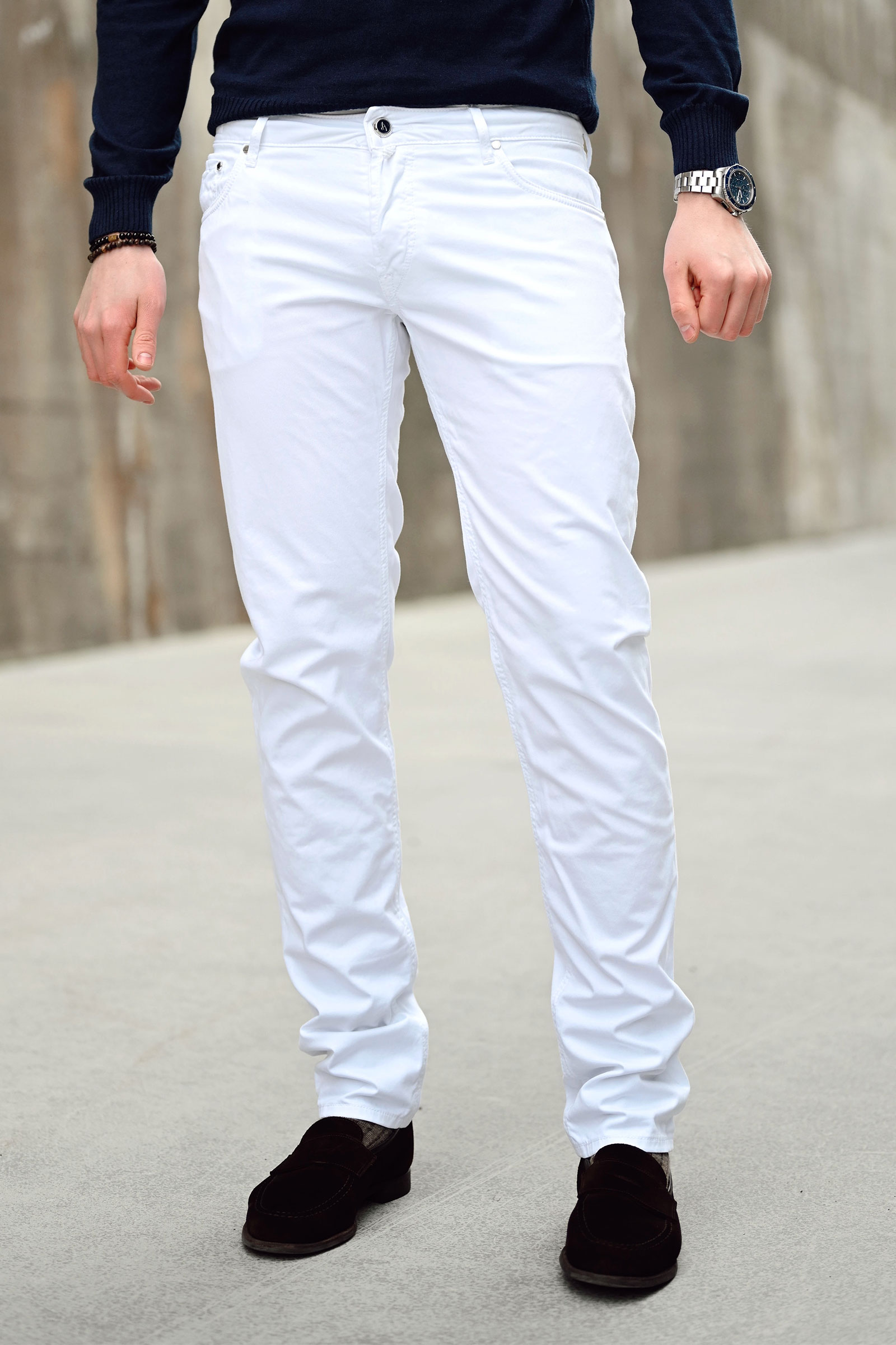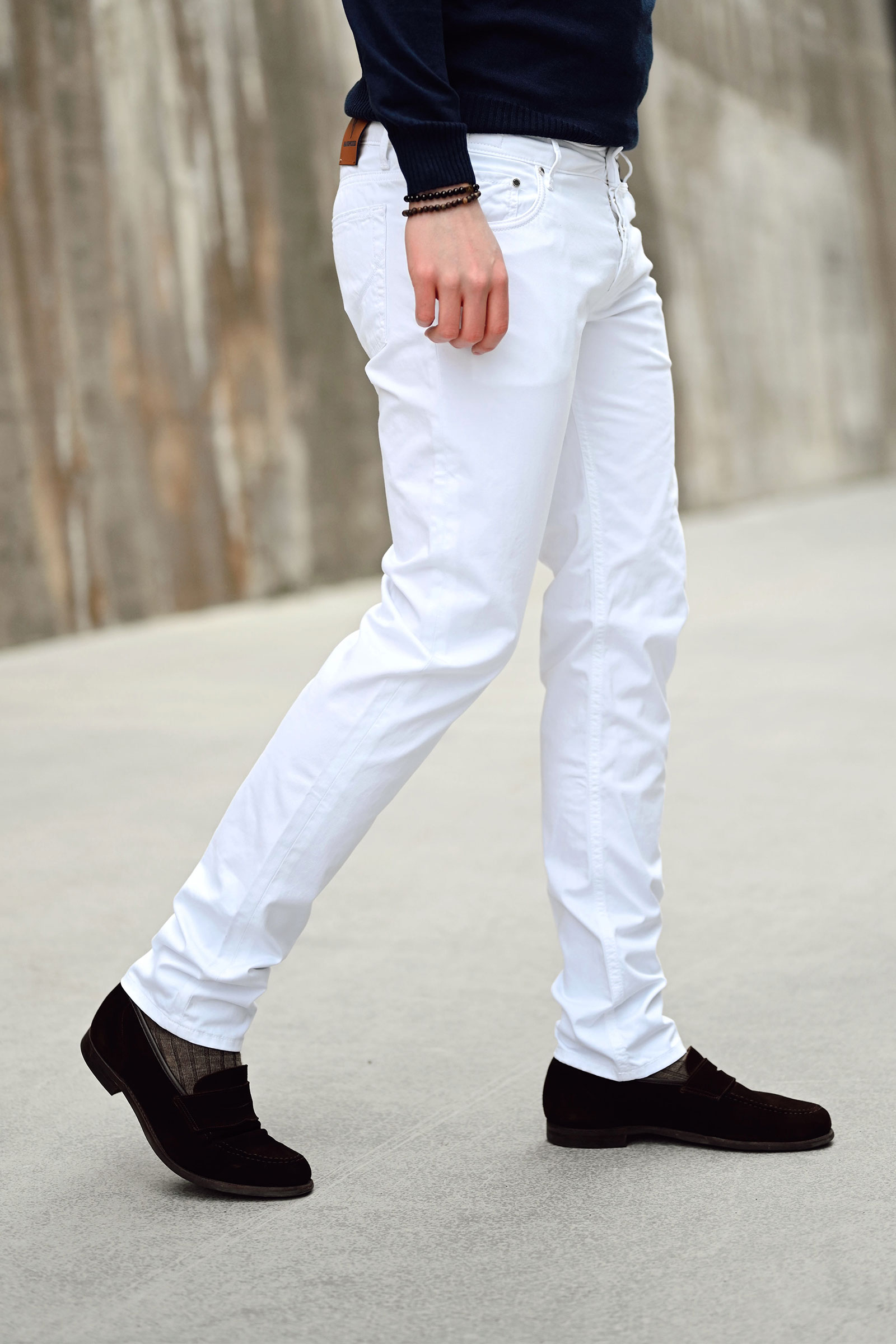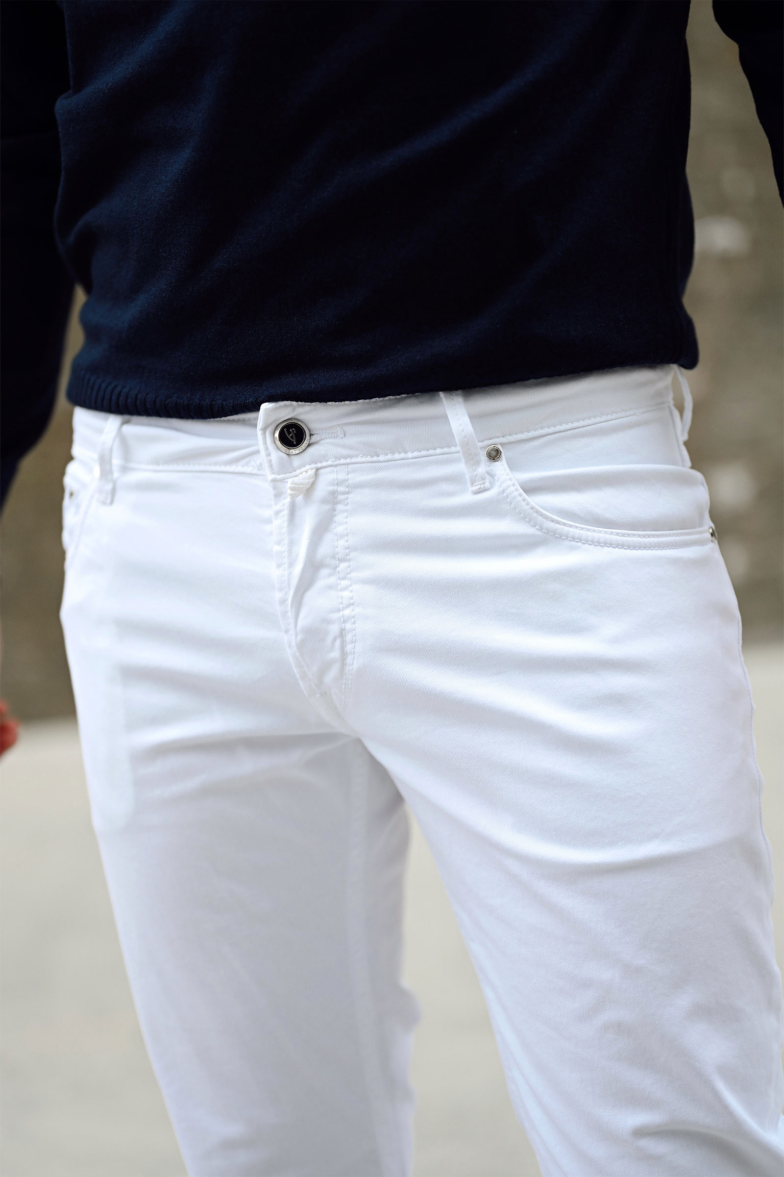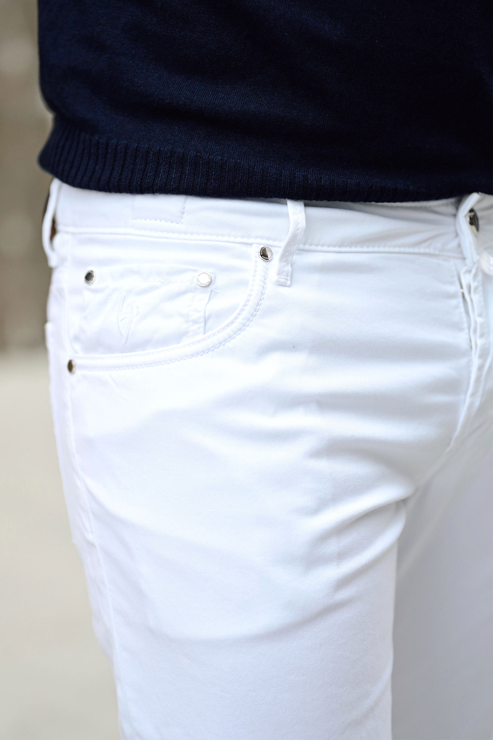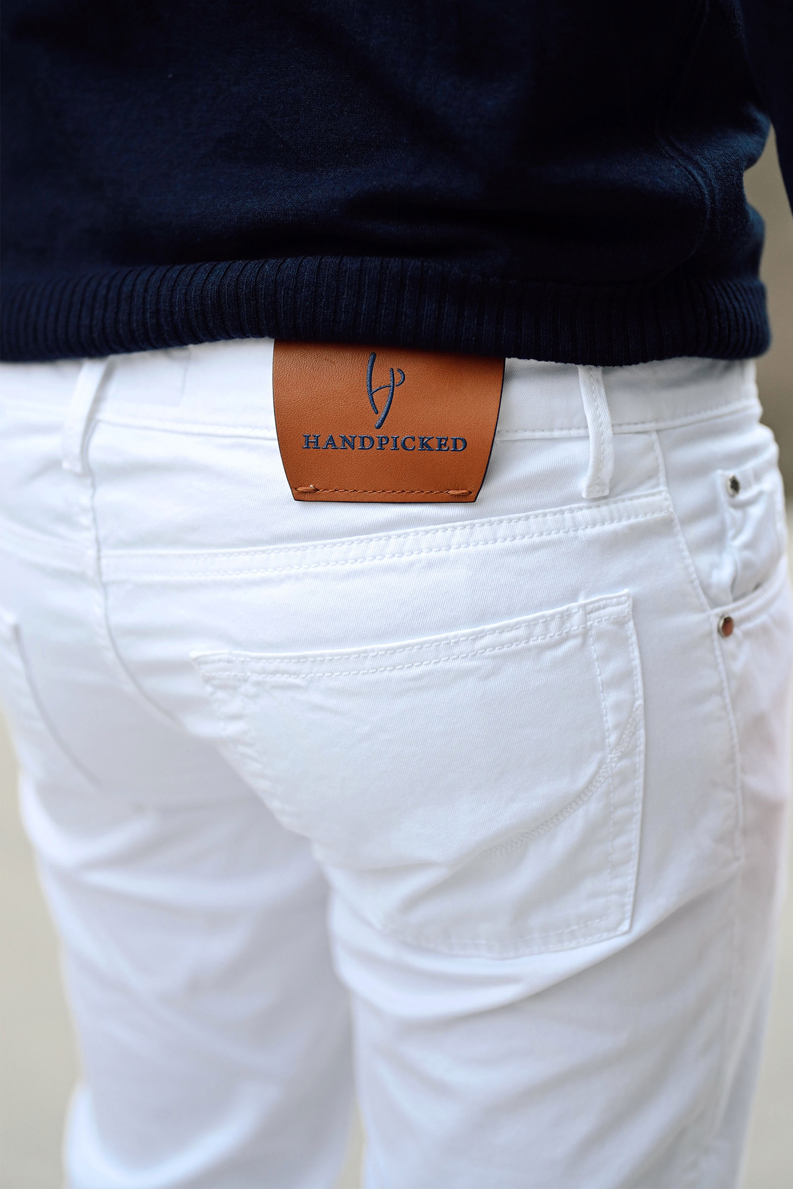 Nyhet fra italienske Handpicked! Orvieto er en slim fit jeans i bomull med noe stretch i en klassisk hvit farge. Jeansen har lommer med minimalistiske detaljer på baksiden, en delikat logo på «coil pocket» fremme, og en stilig logo på baksiden i semsket skinn som skiller seg ut fra mengden. Dette er en klassisk jeans med kvalitet som kan brukes både til hverdags med sneakers og t-skjorte, eller til en fest med loafers og en skjorte.