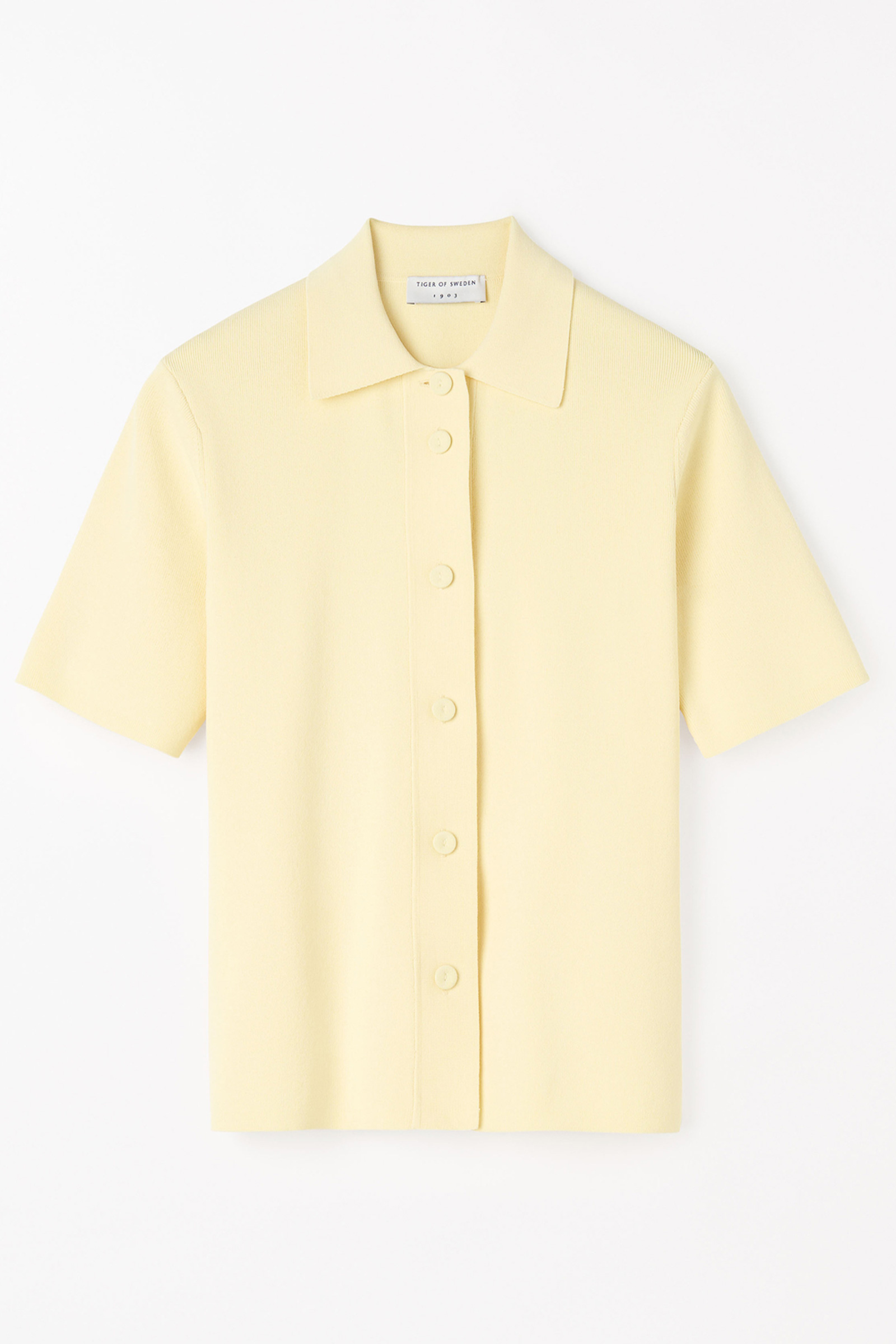 Delikat, strikket overdel fra Tiger of Sweden i trendy gul. Hazel er en kortermet cardigan i en strikket struktur som gir en myk og lett følelse. Cardiganen kommer med en klassisk krage, korte ermer og en rett passform. Kjempefin å kombinere med et par jeans til hverdags eller et par lyse dressbukser til fest.