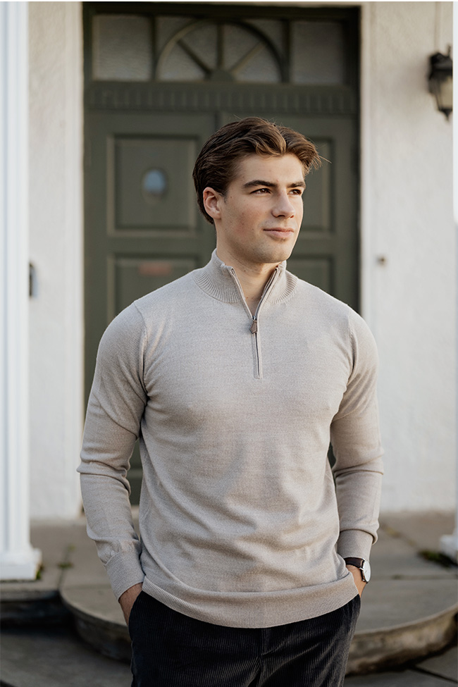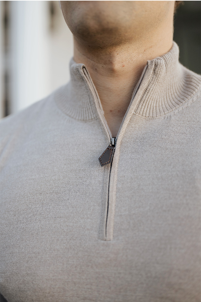 Stilren og klassisk half-zip fra vårt egne merke I´m Branded i ny fin beigefarge! Genseren kommer i en rett passform, half-zip i front og ribbestrikk ved linning, erme og hals. En nydelig genser å bruke alene – eller over skjorter for et mer formelle uttrykk. Den deilige merinokvaliteten gjør den både behagelig, varm og slitesterk.