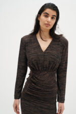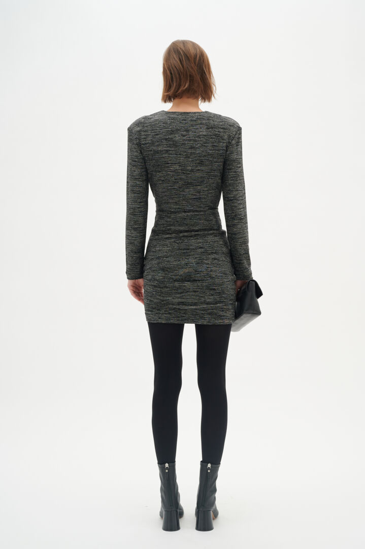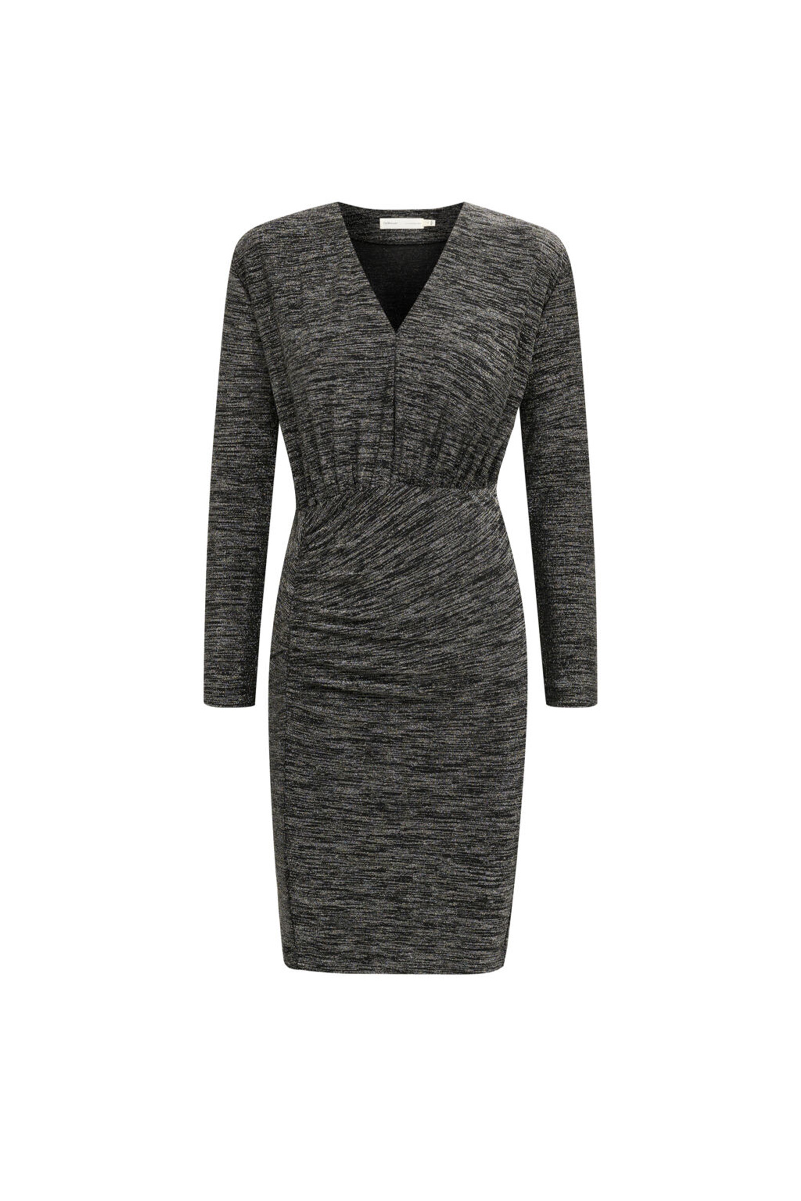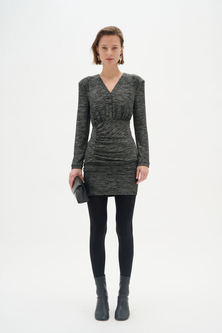 En fantastisk kjole fra InWear med flatterende passform. Jafar dress har lengde til midt på låret, skulderputer, v-hals og lange ermer. Kjolen har en kroppsnær fasong med flatterende rynkedetaljer. Stoffet har sort bunnfarge med sølvfargede glittertråder.
