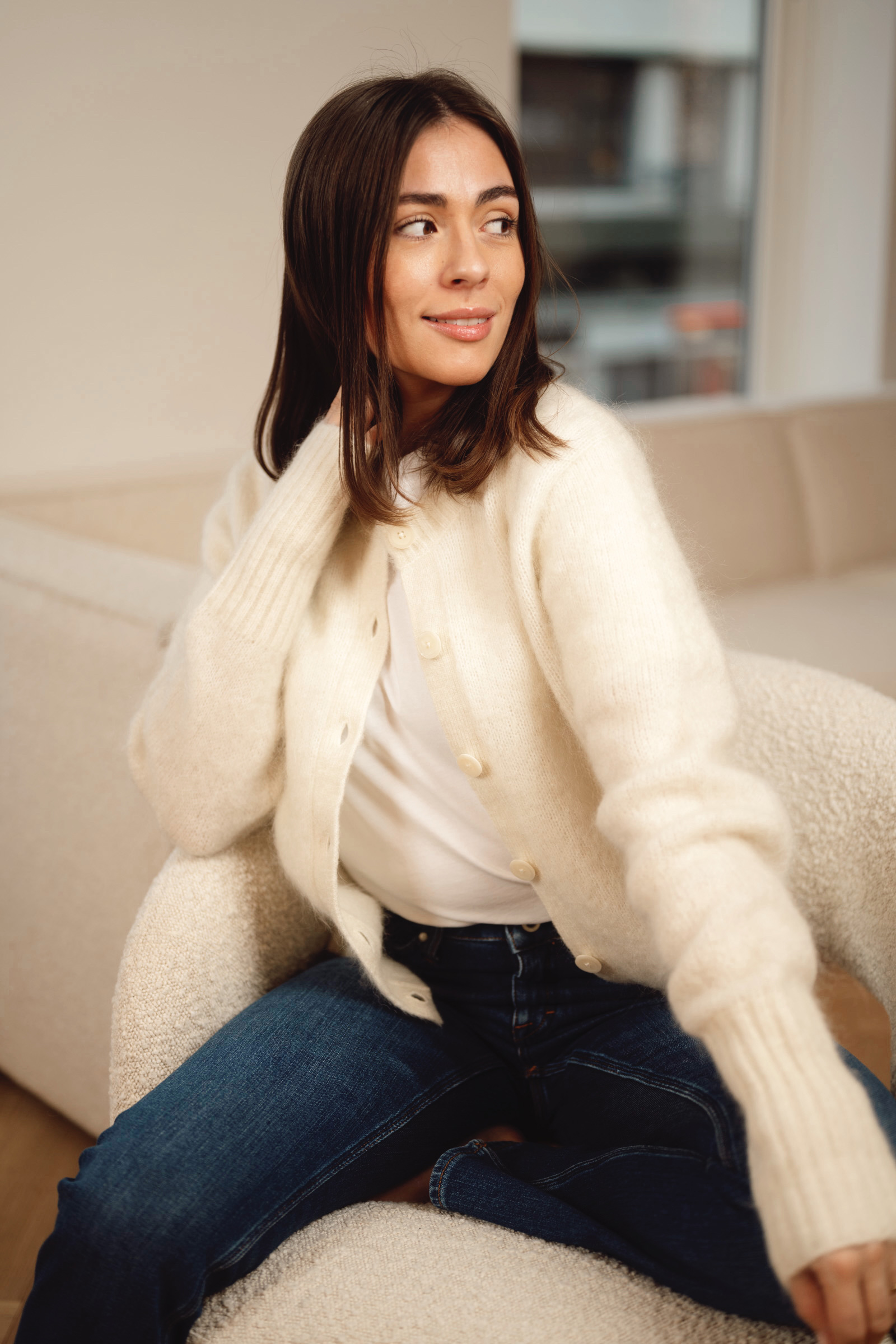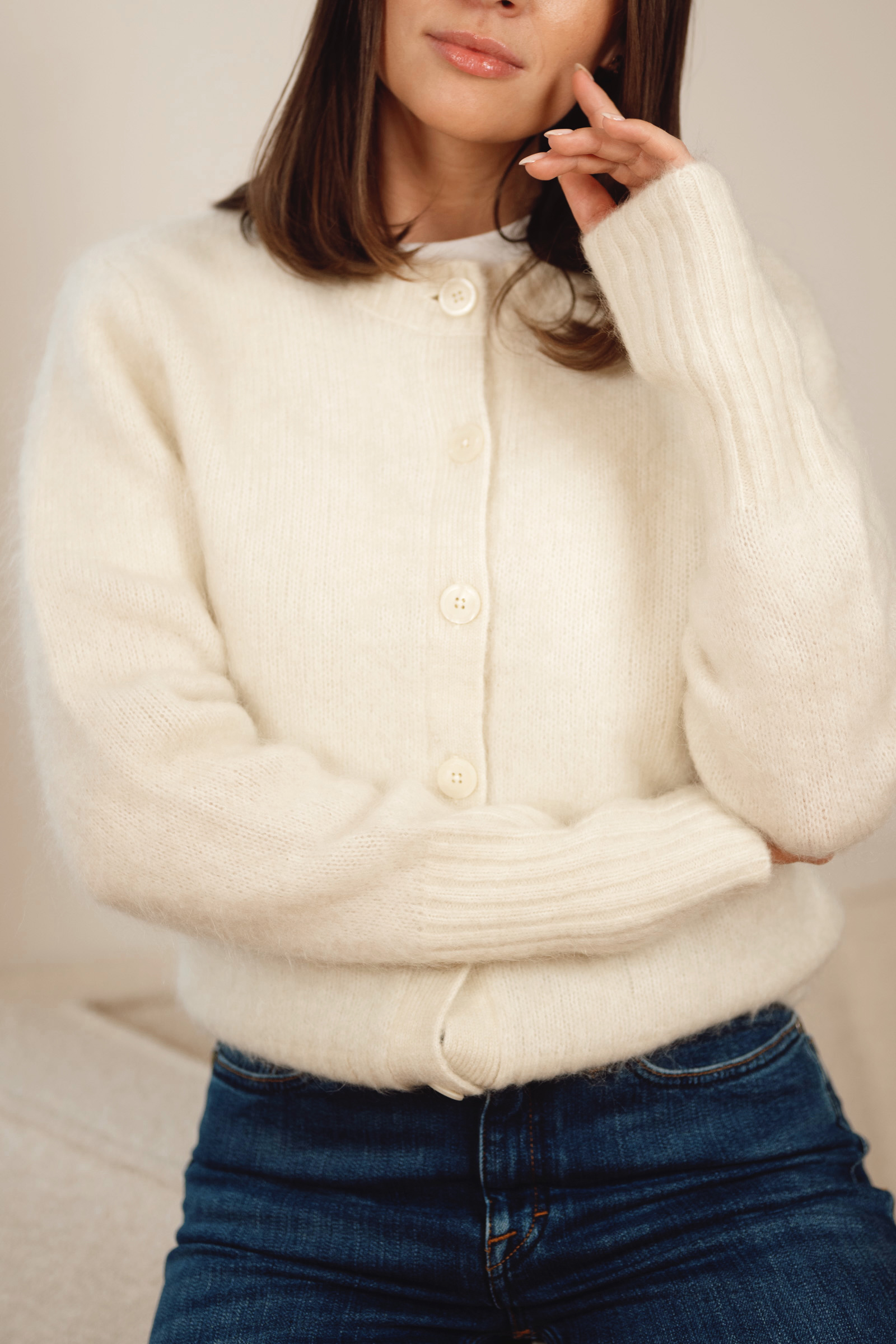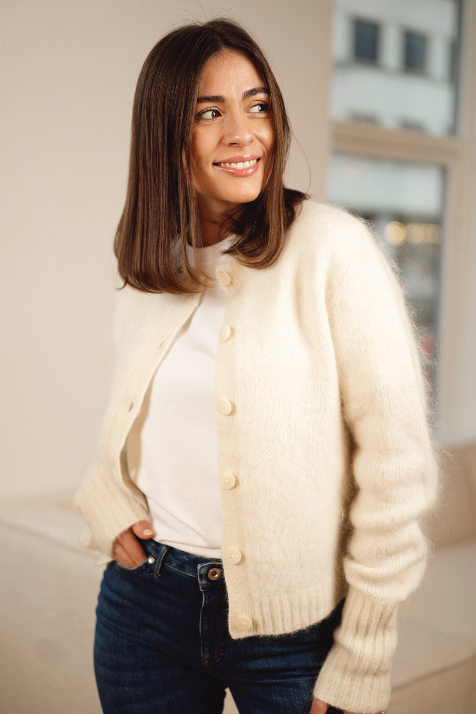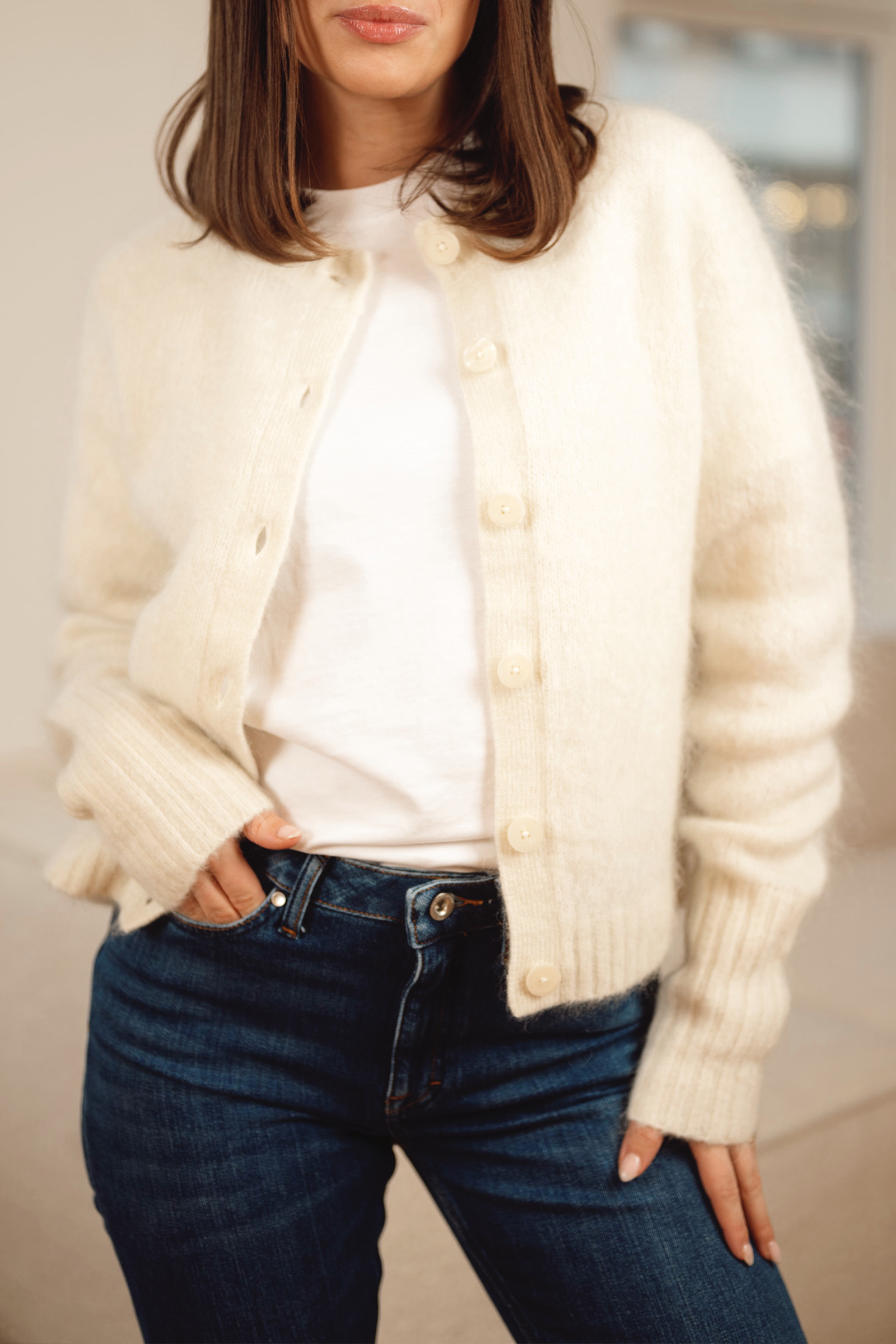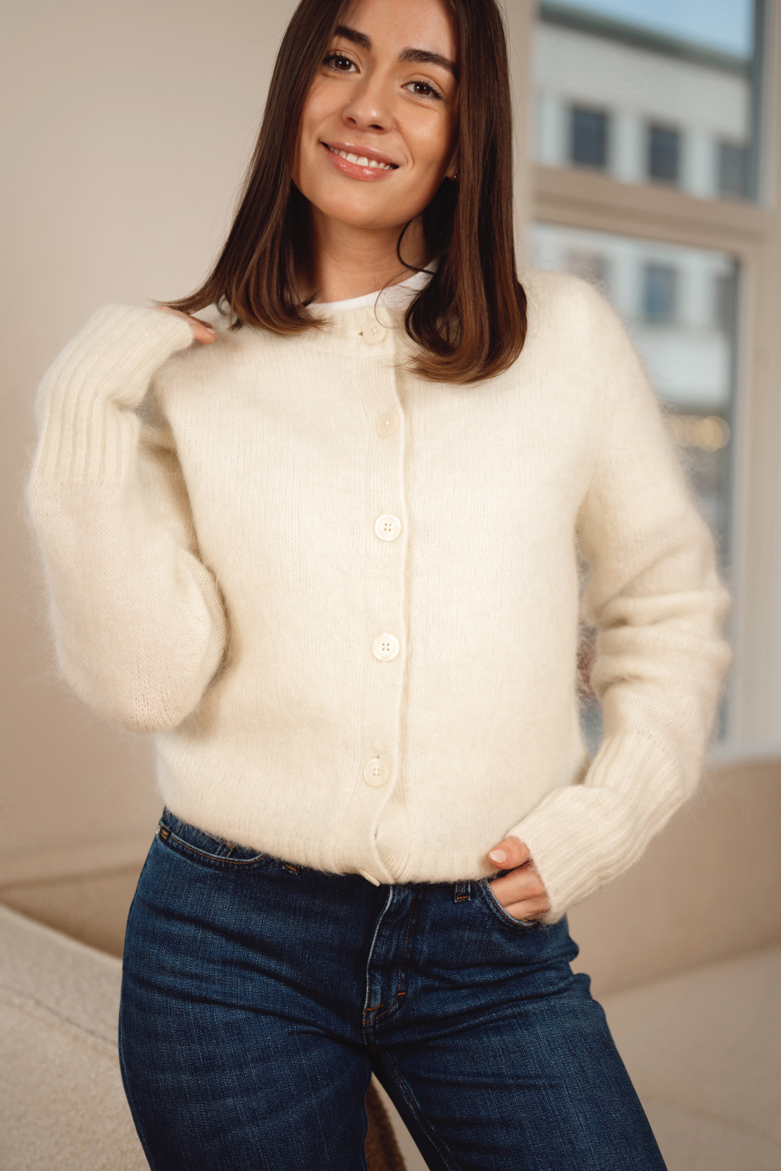 Delikat cardigan fra Tiger of Sweden i krem. Leonie kommer i et tidløst design med rund hals, lange ermer med lang ribbestrikk, lengde til hoften samt en knappestolpe som faller ton-i-ton med jakken. Med sin deilige blandingskvalitet er dette en strikk som varmer godt og er god mot huden. En perfekt favoritt til hverdagen!