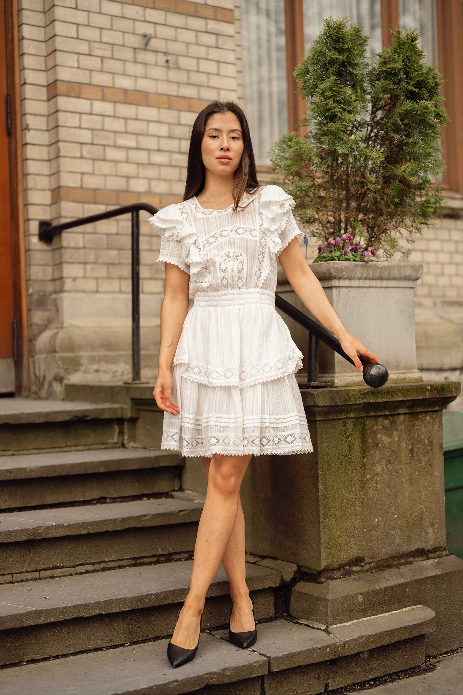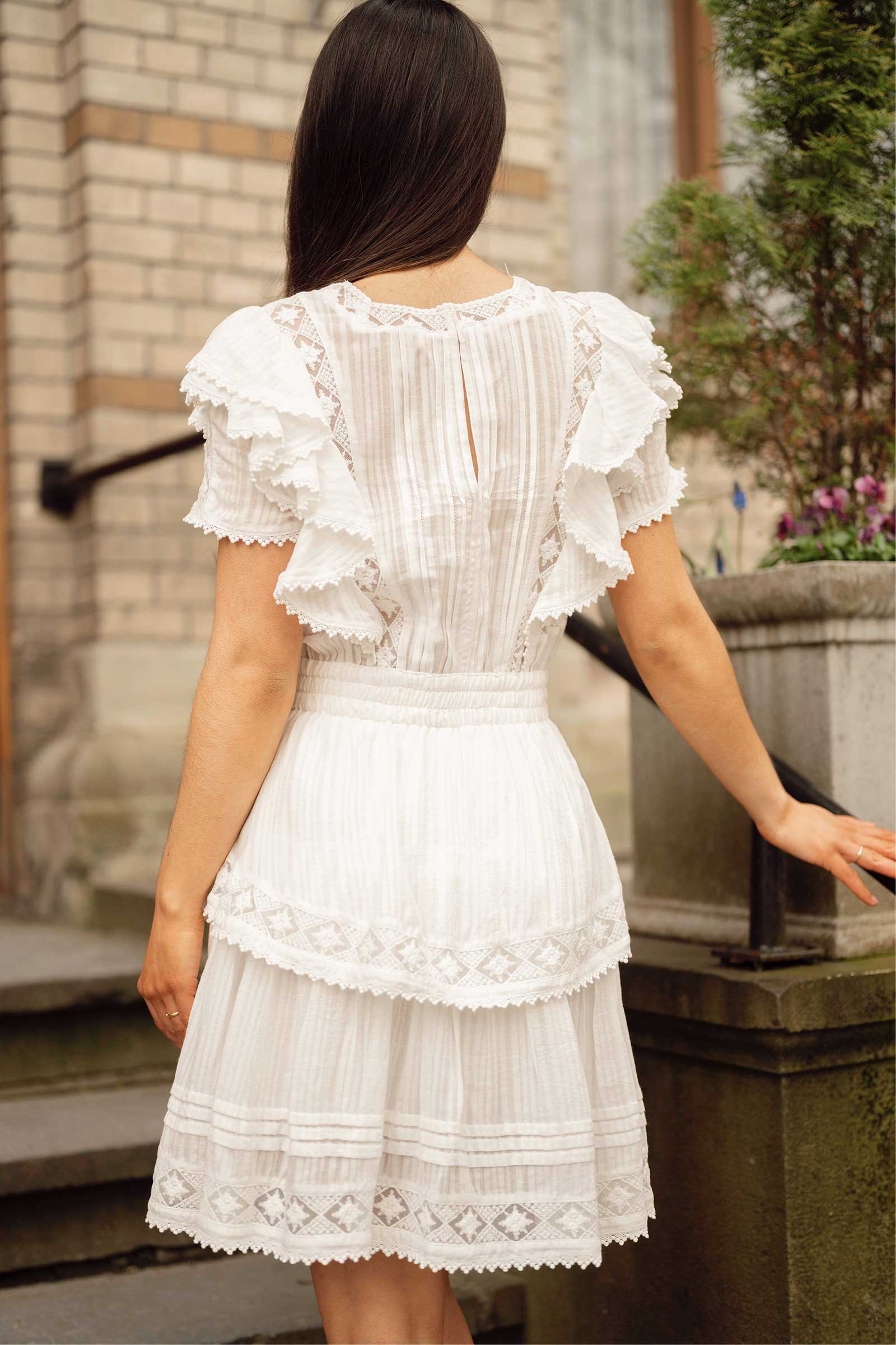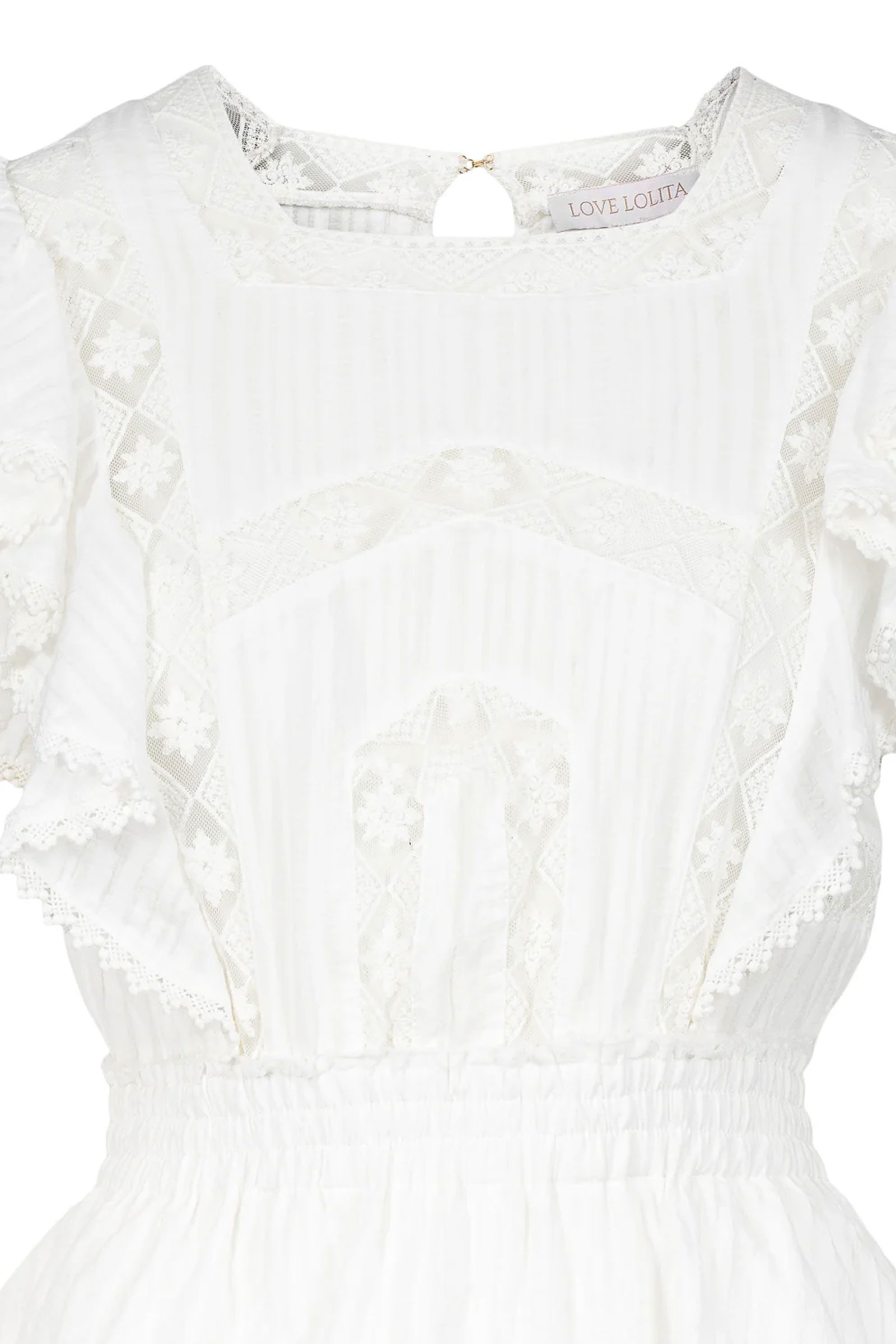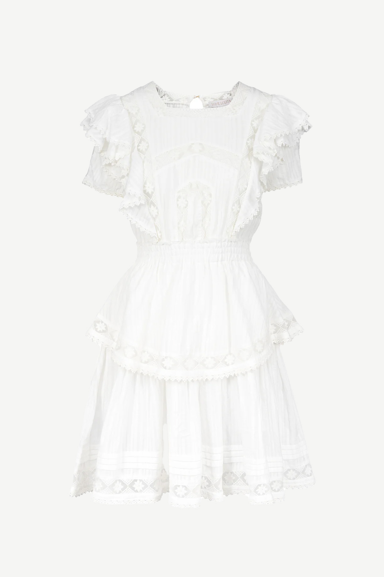 Romantisk sommerkjole fra Love Lolina! Alexa Dress har dekorative detaljer som volanger på skjørtet og ermene, feminine blondedetaljer, og elastisk midje. En kort sommerkjole som passer perfekt til varme dager – kombiner med sandaler til hverdag eller hæler til fest!
