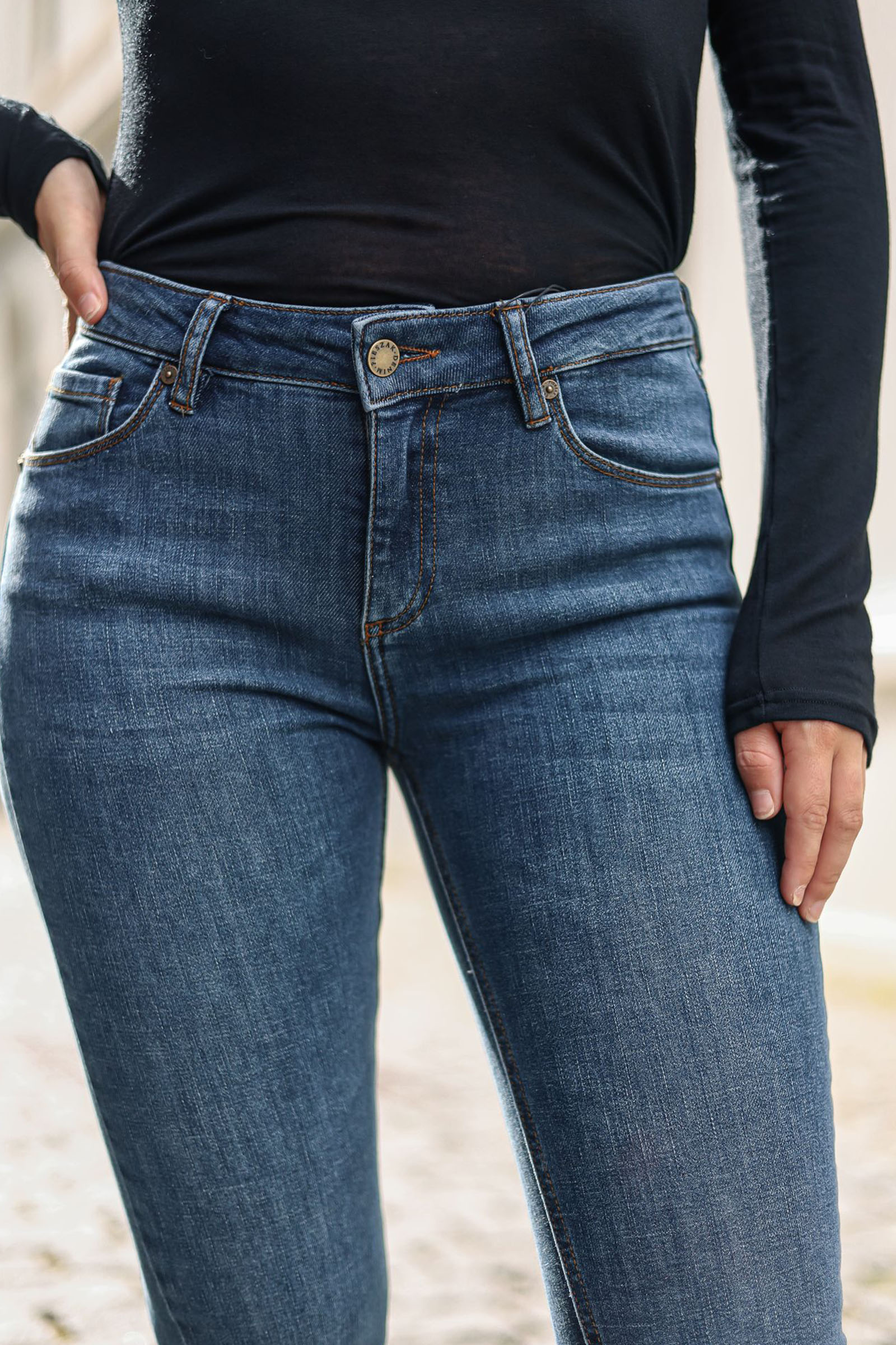 En superkul jeans fra Pieszak i en dyp blåtone, med noe vasket effekt. Marija er en mid-waist jeans, kommer med 5 lommer og stretch. Buksen har en glidelås, samt knappelukking i front. Modellen er en skinny fit modell med flared leg, som gir en superkul effekt. Perfekt jeans til hverdags! Kombiner denne med dine favoritt-overdeler.