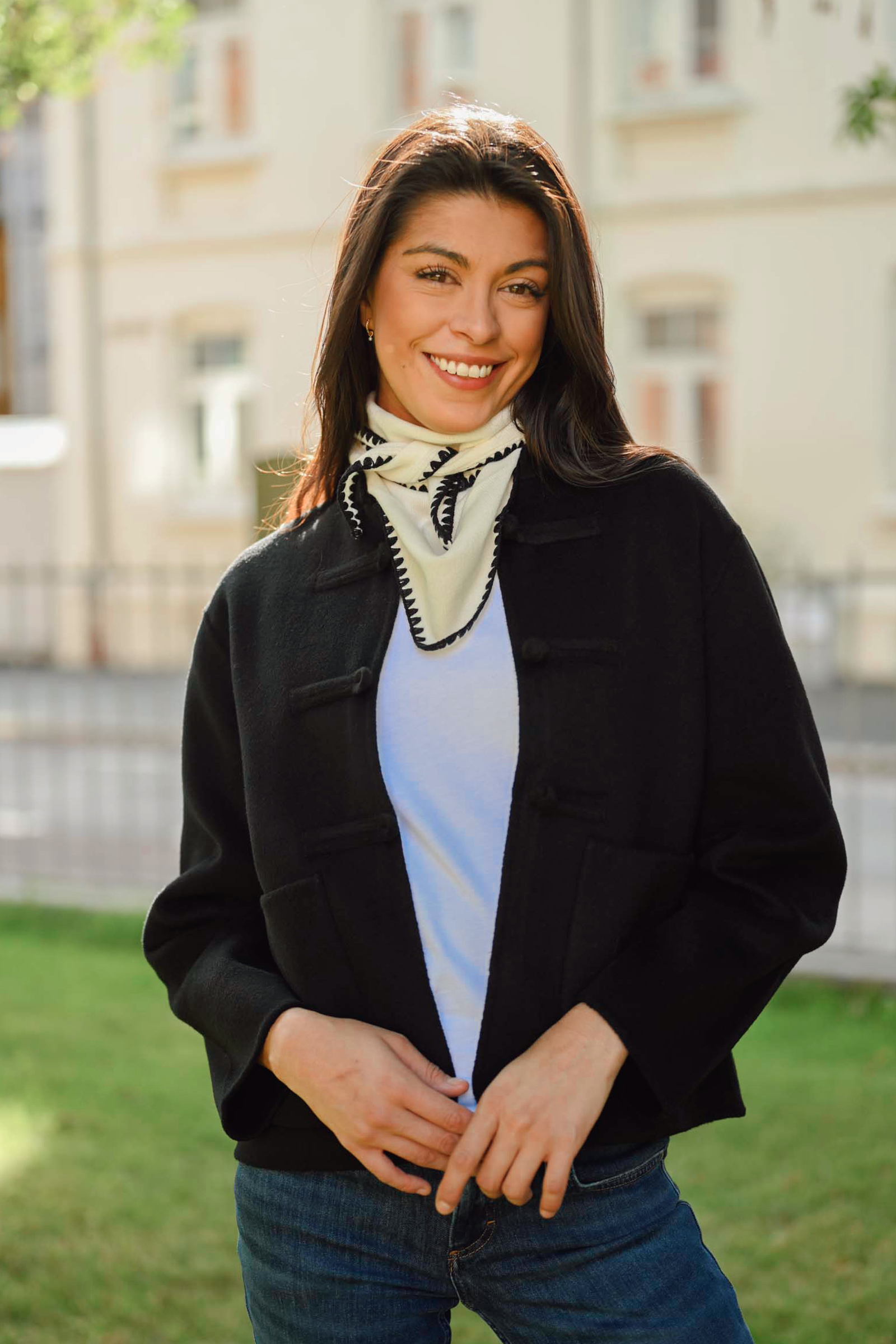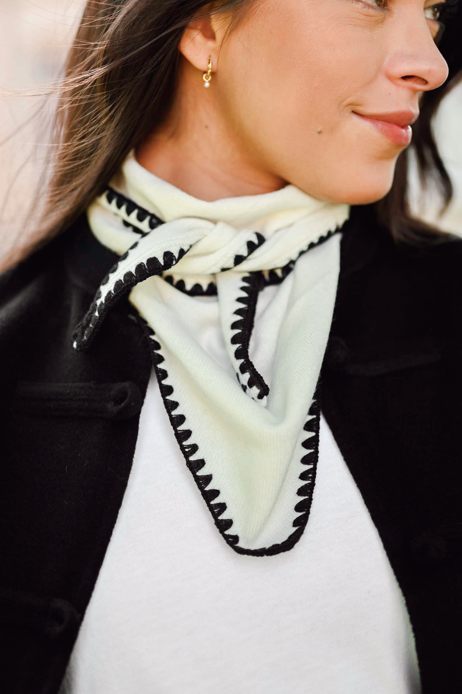 Mina Stiched Merino Scarf fra Christian Aks i fargen krem, er et elegant og funksjonelt skjerf som kombinerer luksus og komfort. Laget av høykvalitets merinoull, gir dette skjerfet en myk og varm følelse mot huden. Det trekantede designet gjør det enkelt å knyte rundt halsen for ekstra varme, mens de sorte broderte kantene gir et sofistikert preg til den klassiske kremfargen. Dette skjerfet er allsidig nok til å brukes både innendørs til skjorter og gensere, og utendørs til jakker.