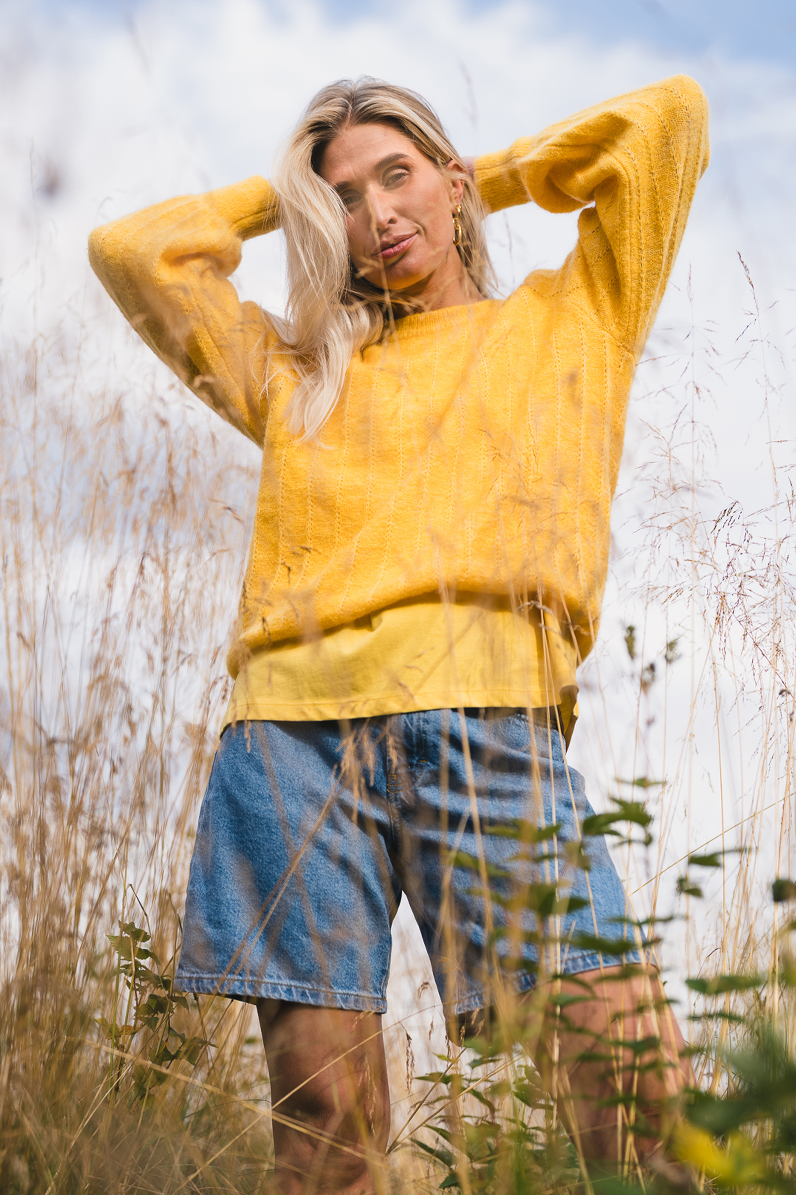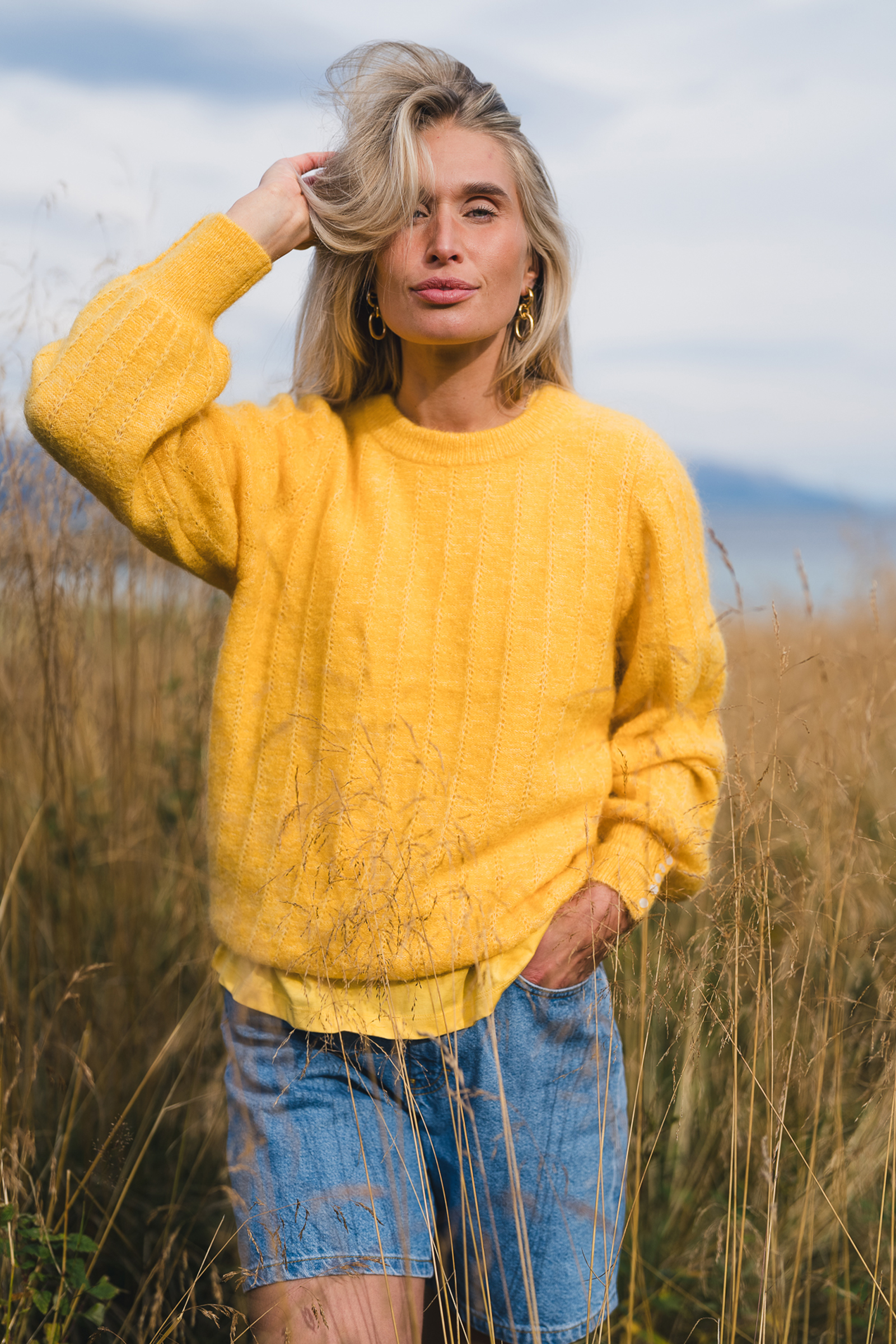 Mira Amalie Pullover fra Raus har nå kommet i en lekker og trendy gulfarge til sommeren. Dette er en myk og behagelig genser med feminine detaljer. Genseren har en rund, ribbestrikket hals og mansjetter med dekorative knapper, og er strikket i et delikat mønster som gir den et unikt uttrykk. Kombiner med en sommerlig kjole under på varme dager, eller et par blå jeans for et avslappet uttrykk!