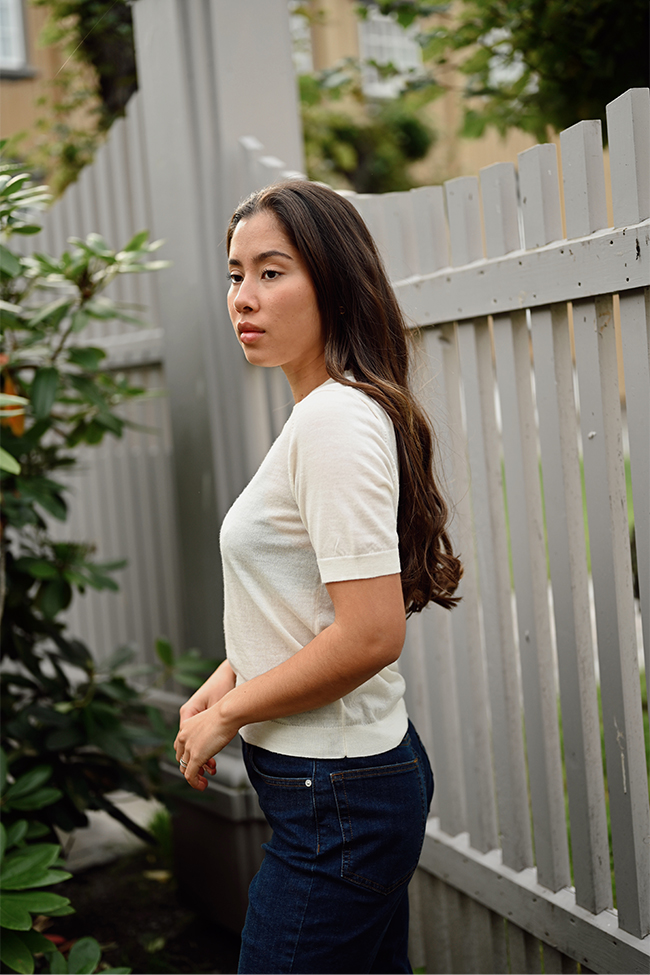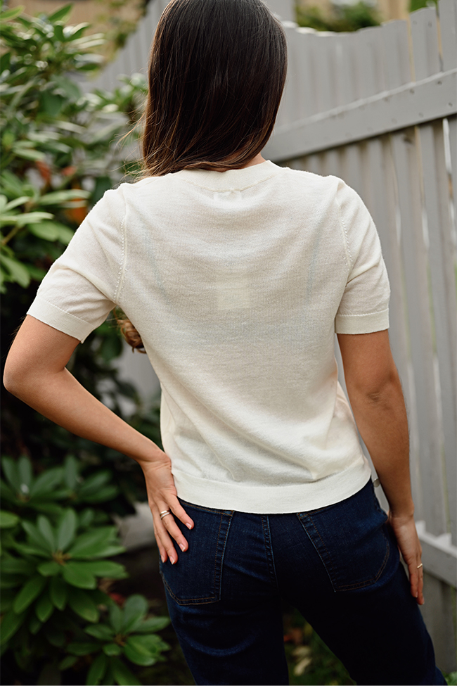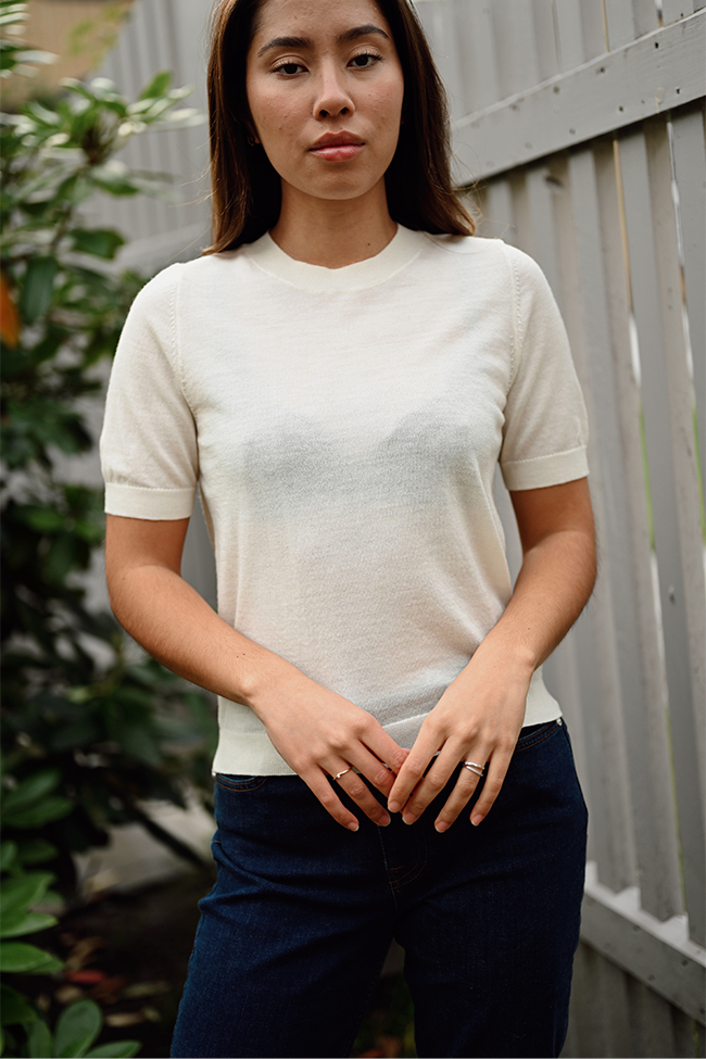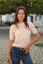 Klassisk, kremfarget merinogenser fra I´m Branded med korte ermer – en god base til de kaldere sesongene! Denne genseren har en rett passform, ribbestrikkede kanter og kommer i en tynnere ullkvalitet. Superfin å bruke både alene og under blazere og jakker. Den deilige kvaliteten av merinoull gjør denne til et must-have!