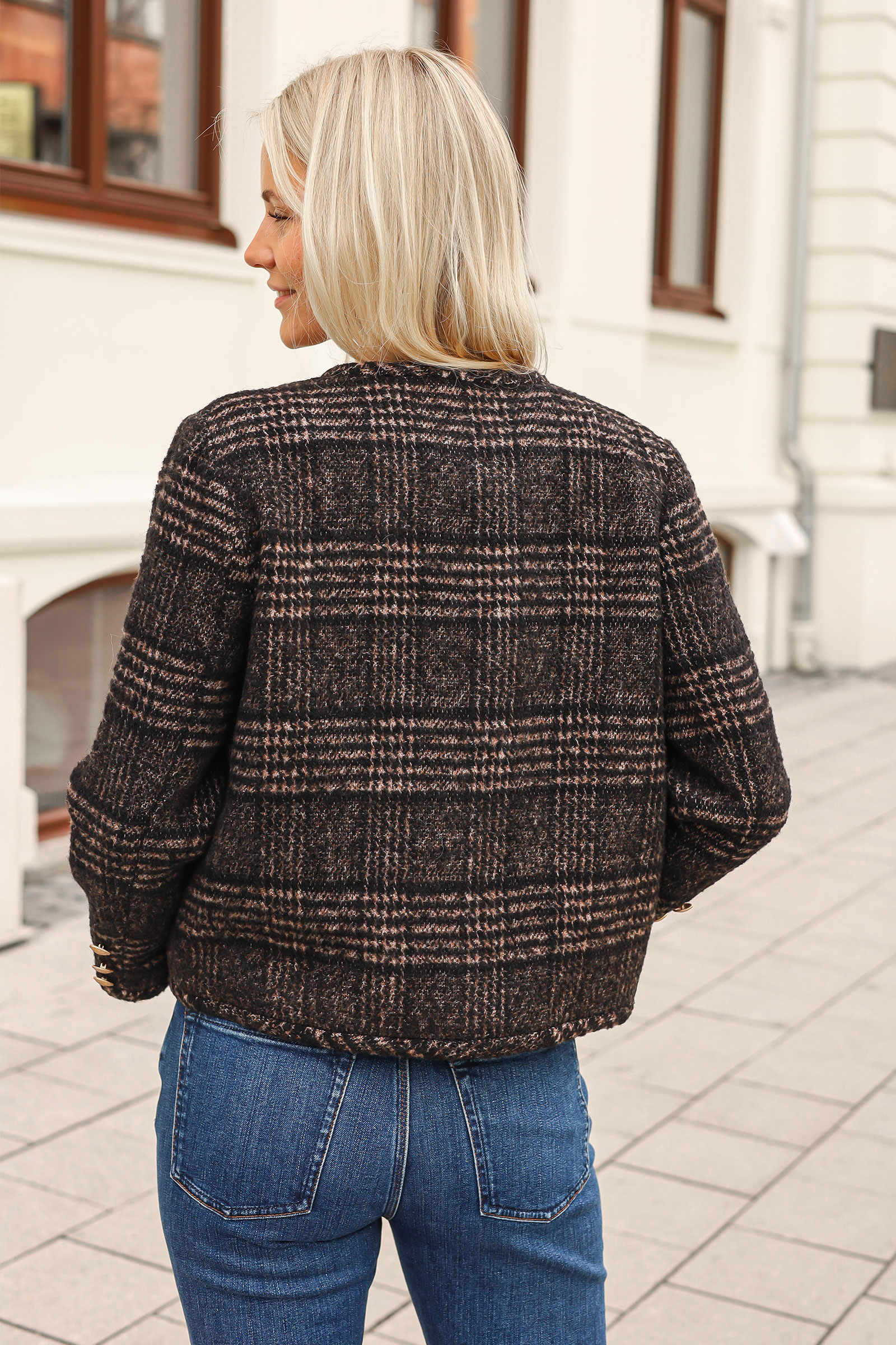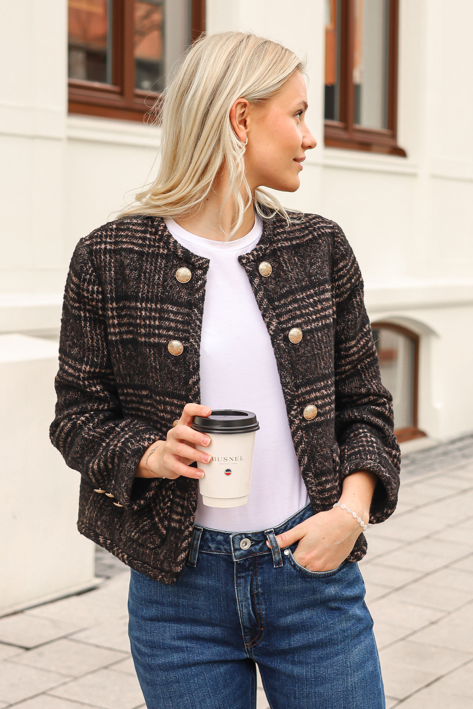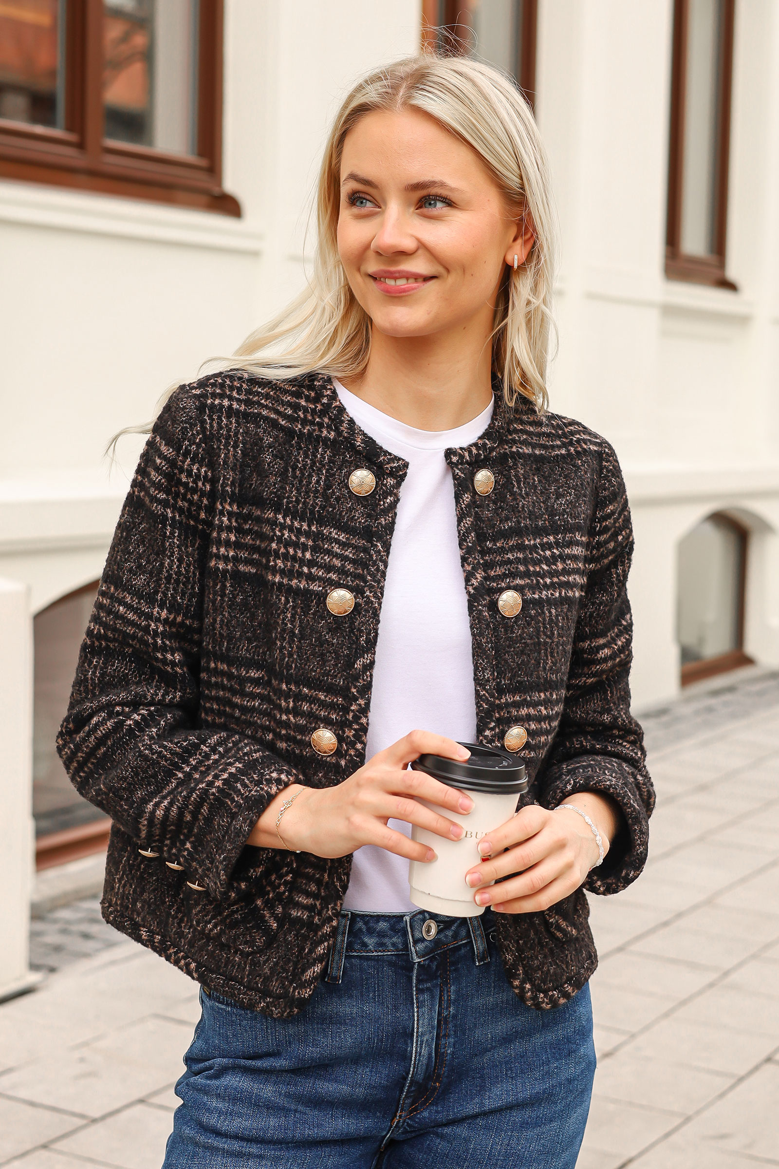 En sofistikert jakke fra Dea Kudibal med lekre detaljer. Nelldea har en rett passform med rund krage og lange ermer. Dekorative knapper i gullfarge gir en fin detalj til det rutete mønstret i mørke toner. En superfin jakke til høsten som er like fin å bruke til jeans som over en dressbukse og en pen bluse.