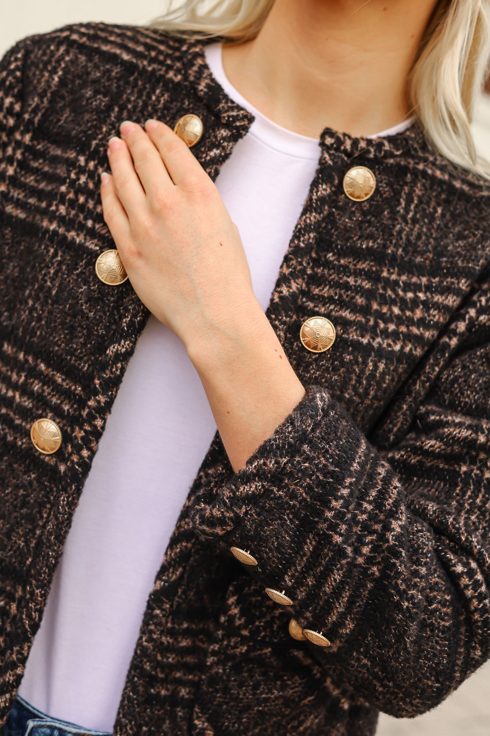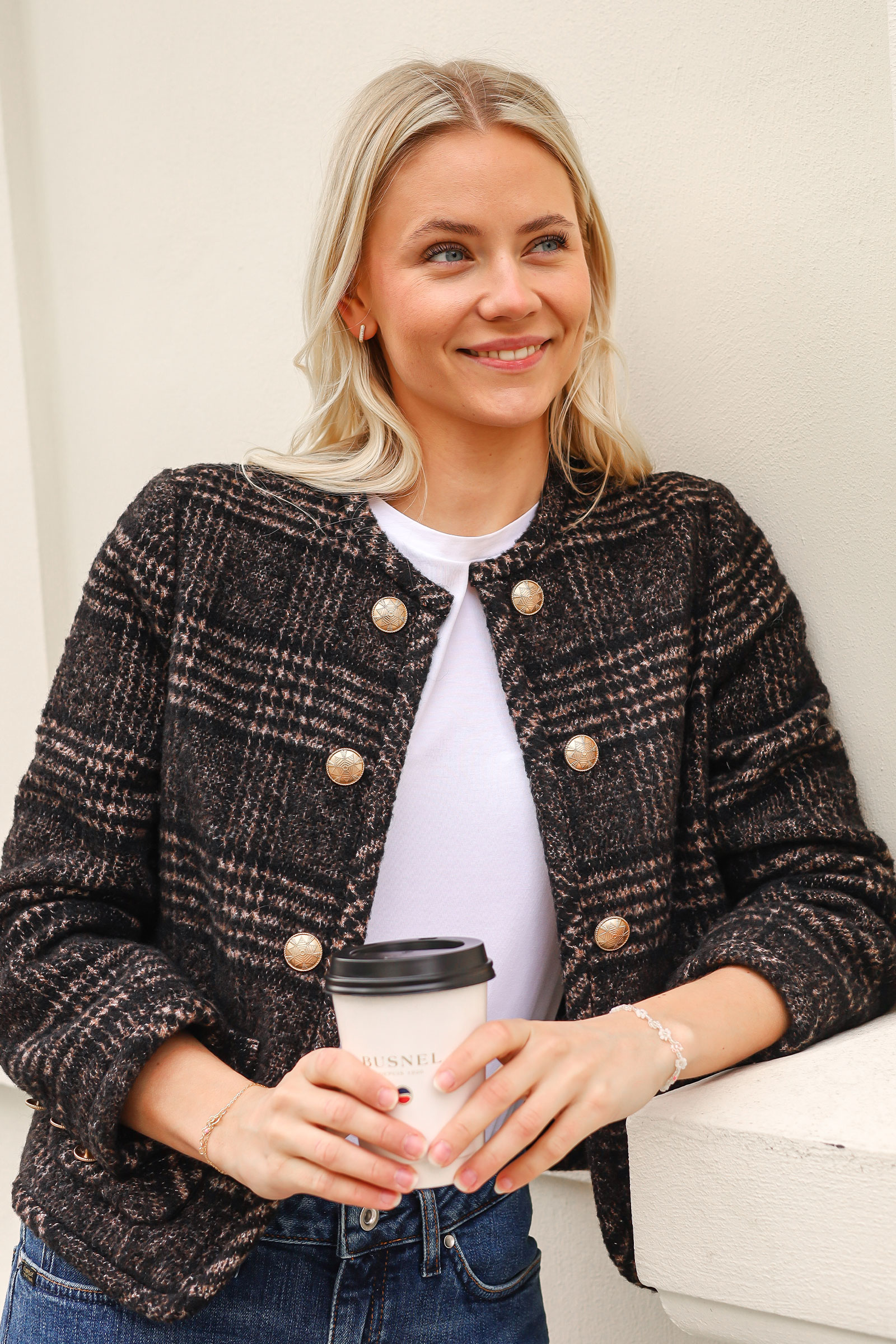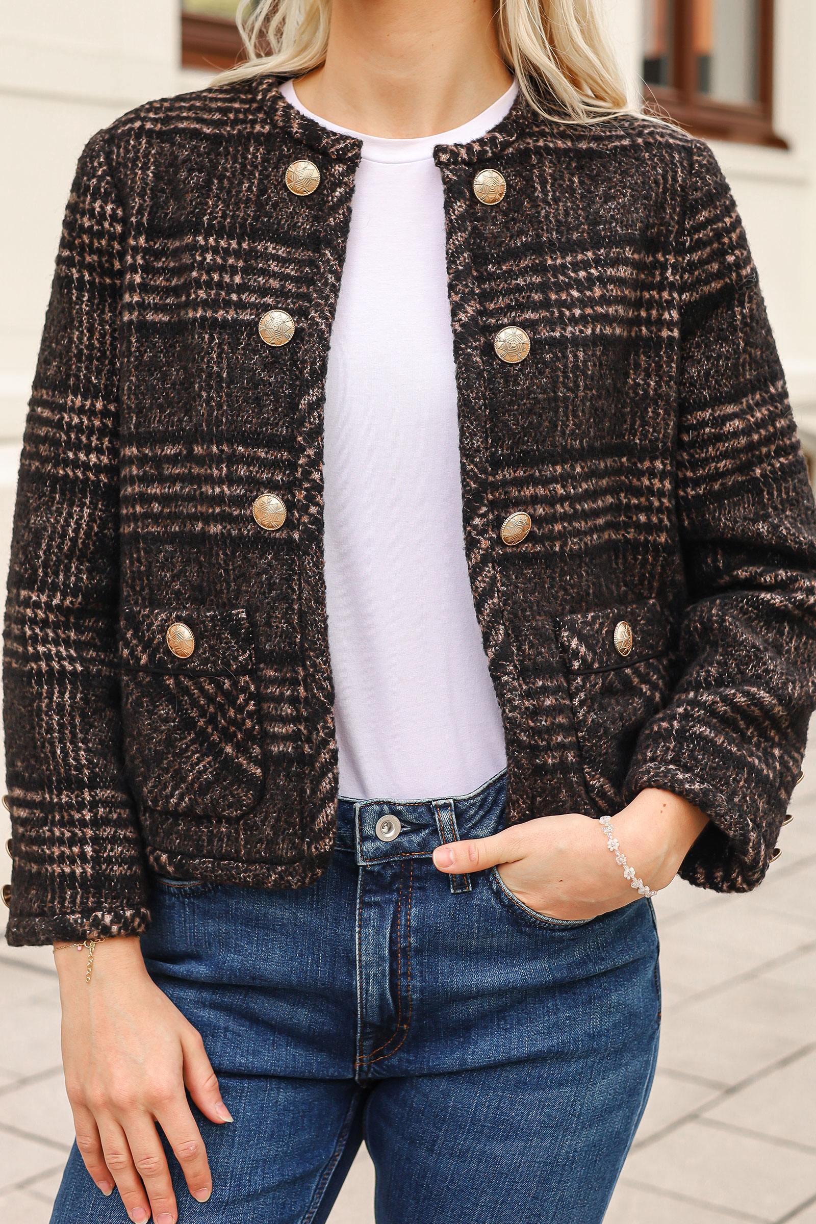 En sofistikert jakke fra Dea Kudibal med lekre detaljer. Nelldea har en rett passform med rund krage og lange ermer. Dekorative knapper i gullfarge gir en fin detalj til det rutete mønstret i mørke toner. En superfin jakke til høsten som er like fin å bruke til jeans som over en dressbukse og en pen bluse.