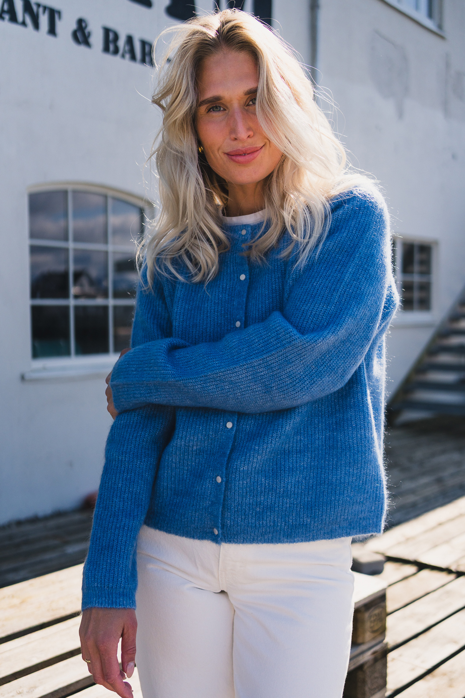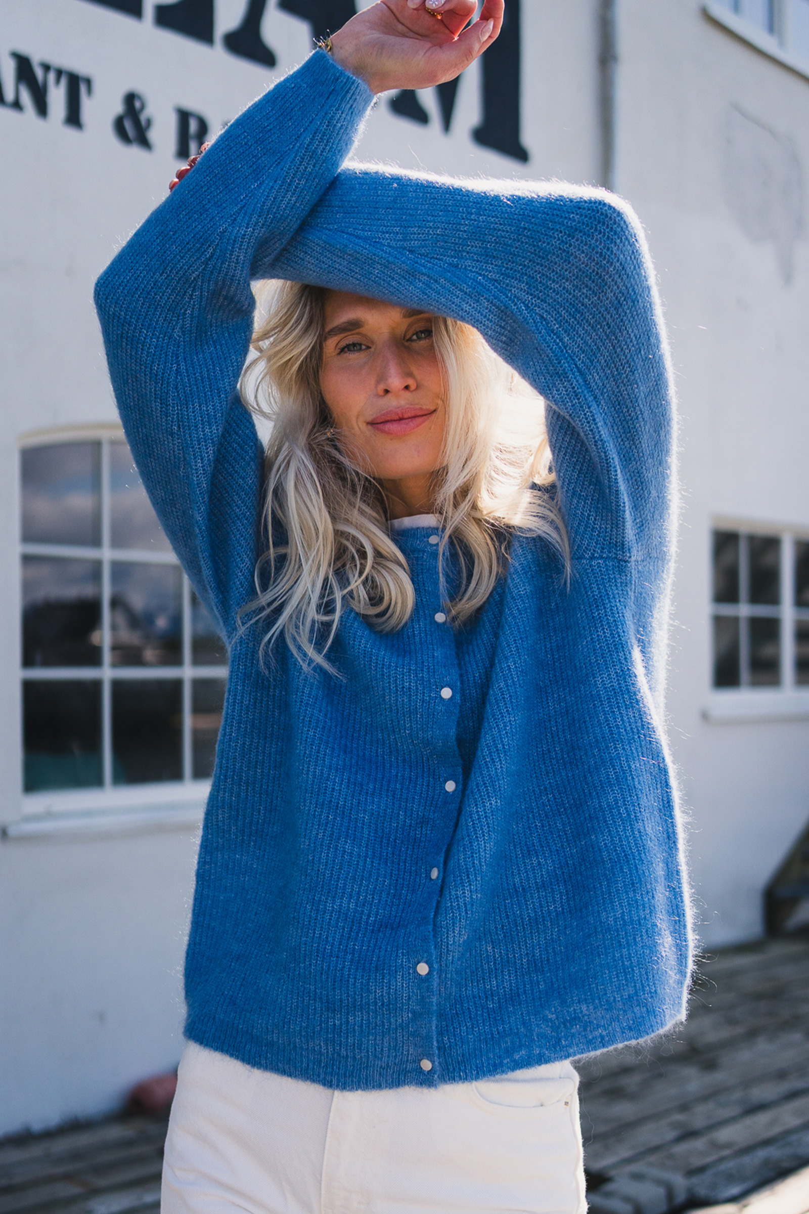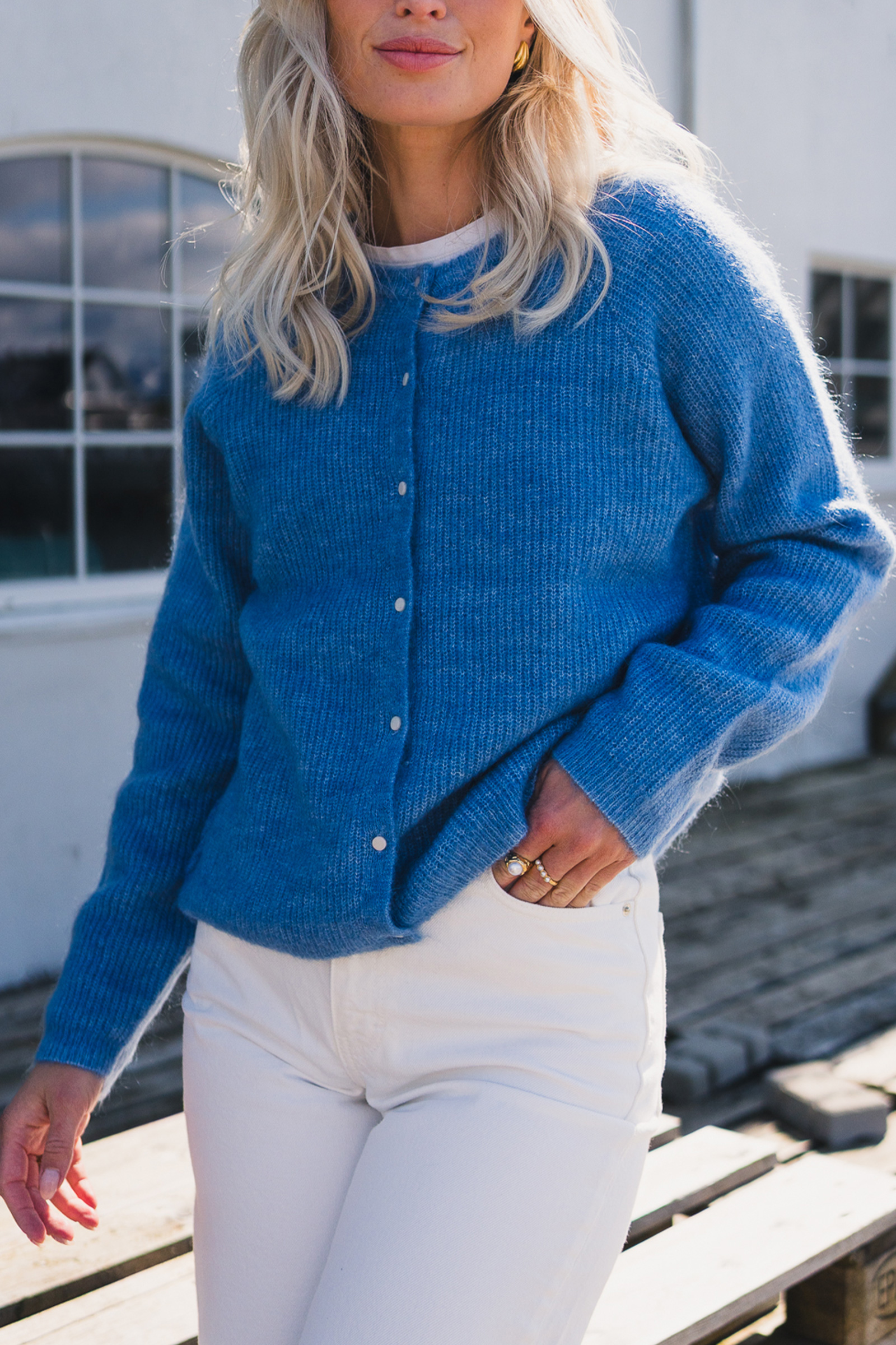 Bestselger fra Raus! Amalie er en myk og behagelig cardigan med knappelukking hele veien i front. Jakken har rund hals, et klassisk, ribbestrikket mønster og delikate, hvite knapper. Cardiganen er strikket i en varm kvalitet, og kommer i en frisk blåfarge som passer perfekt til vårsesongen! Amalie er enkel å slenge over en kjole eller en t-skjorte for å friske opp antrekket.