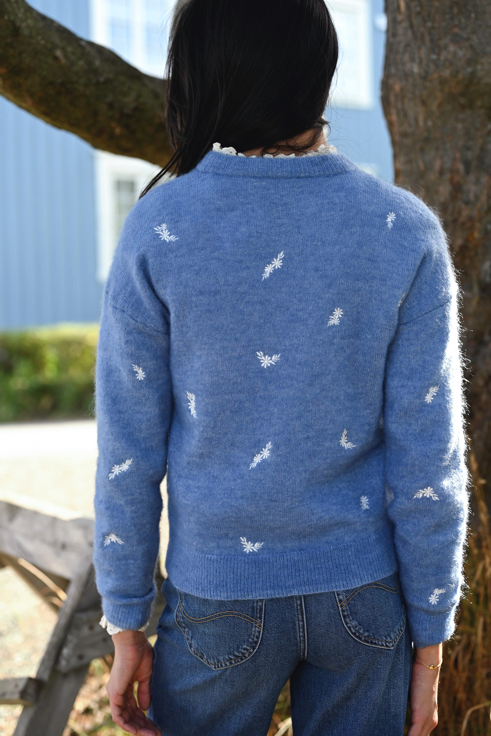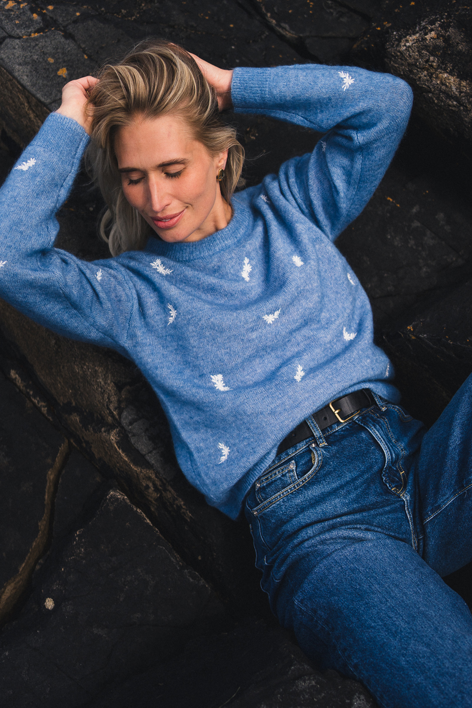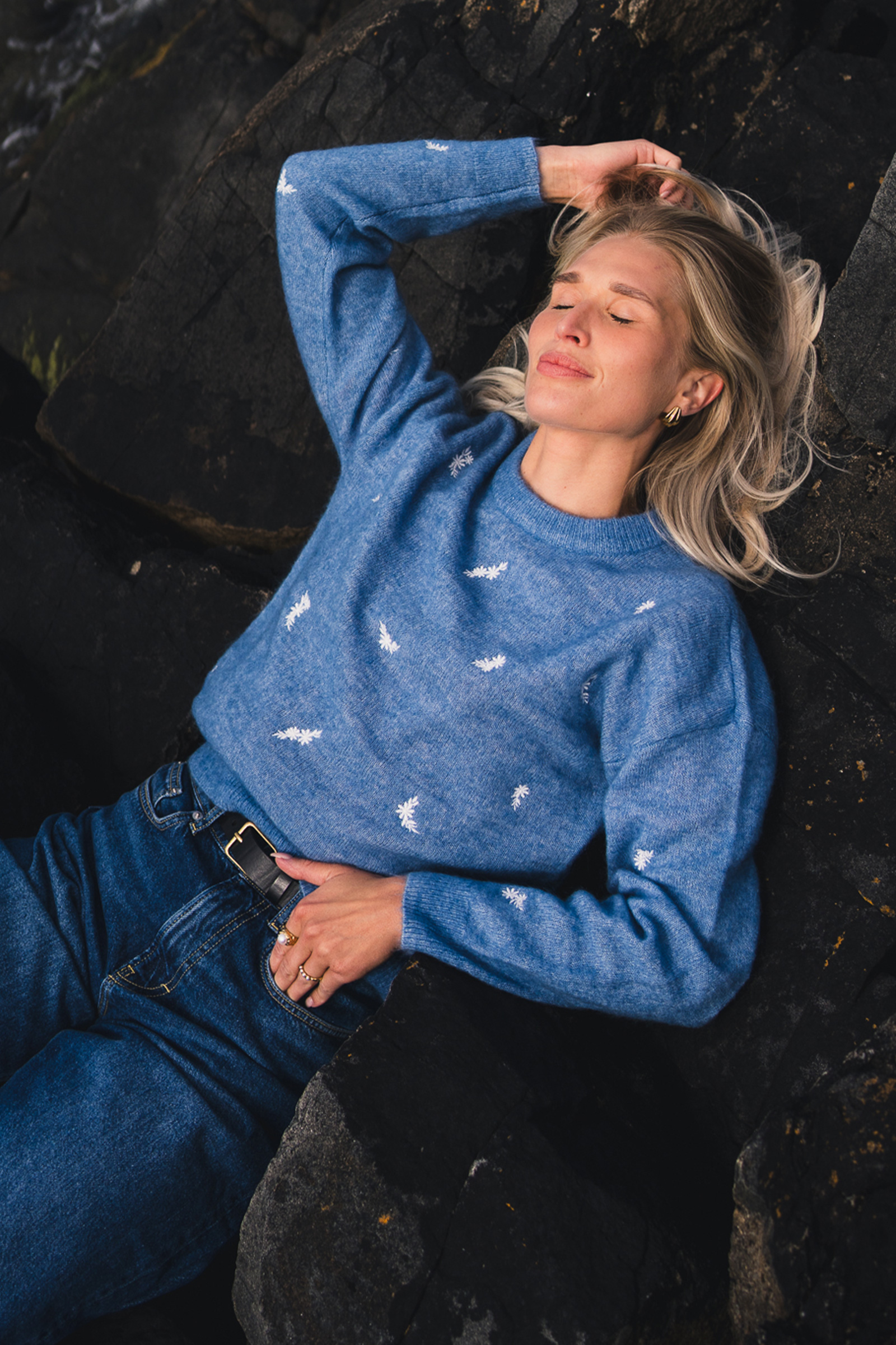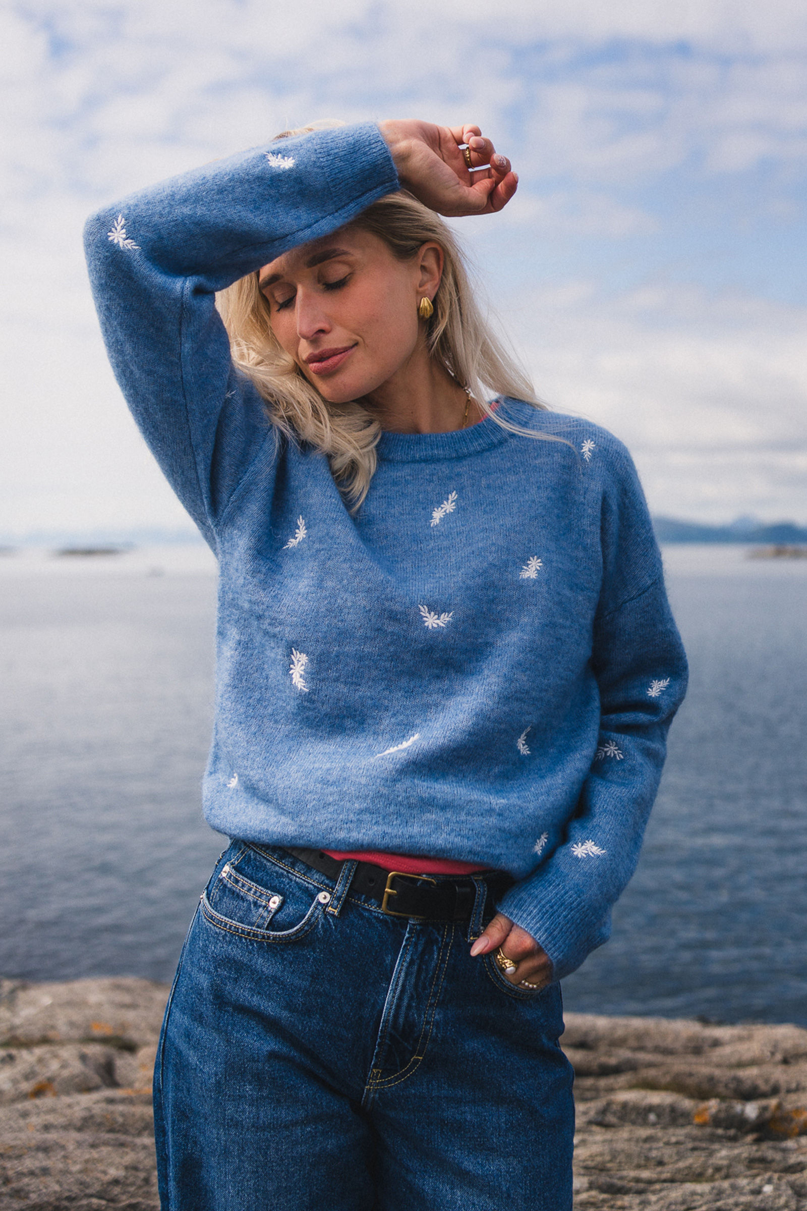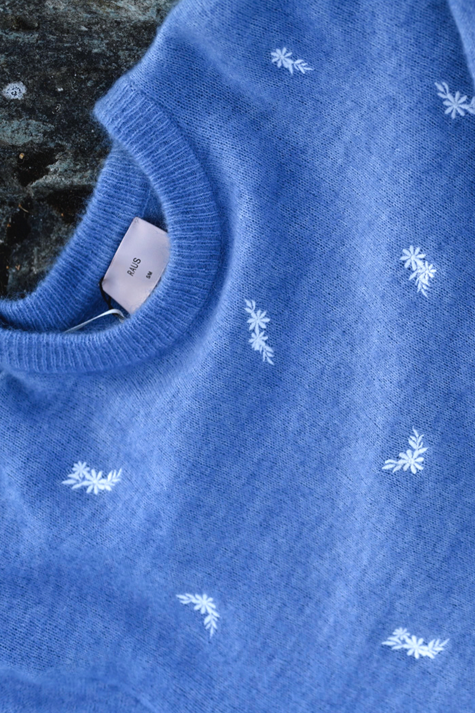 Amalie Pullover fra Raus har nå kommet i en nydelig blåfarge med broderte blomster. Dette er en myk og behagelig genser med feminine detaljer. Genseren har en rund, ribbestrikket hals og mansjetter med dekorative knapper, og er strikket i et delikat mønster som gir den et unikt uttrykk. Kombiner med en sommerlig kjole under på varme dager, eller et par blå jeans for et avslappet uttrykk!
