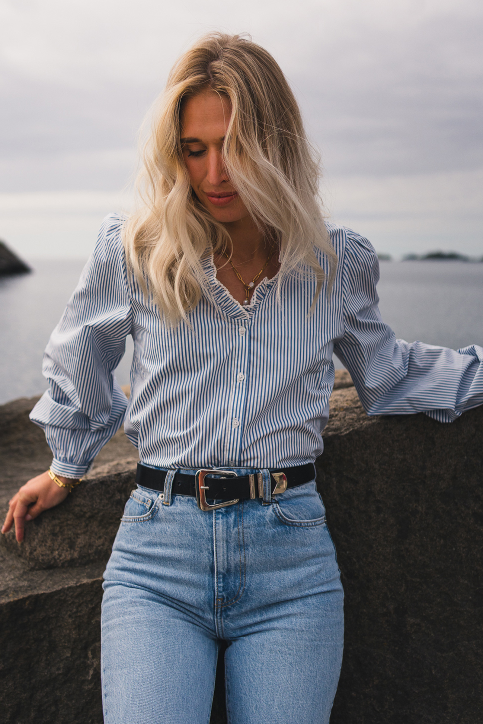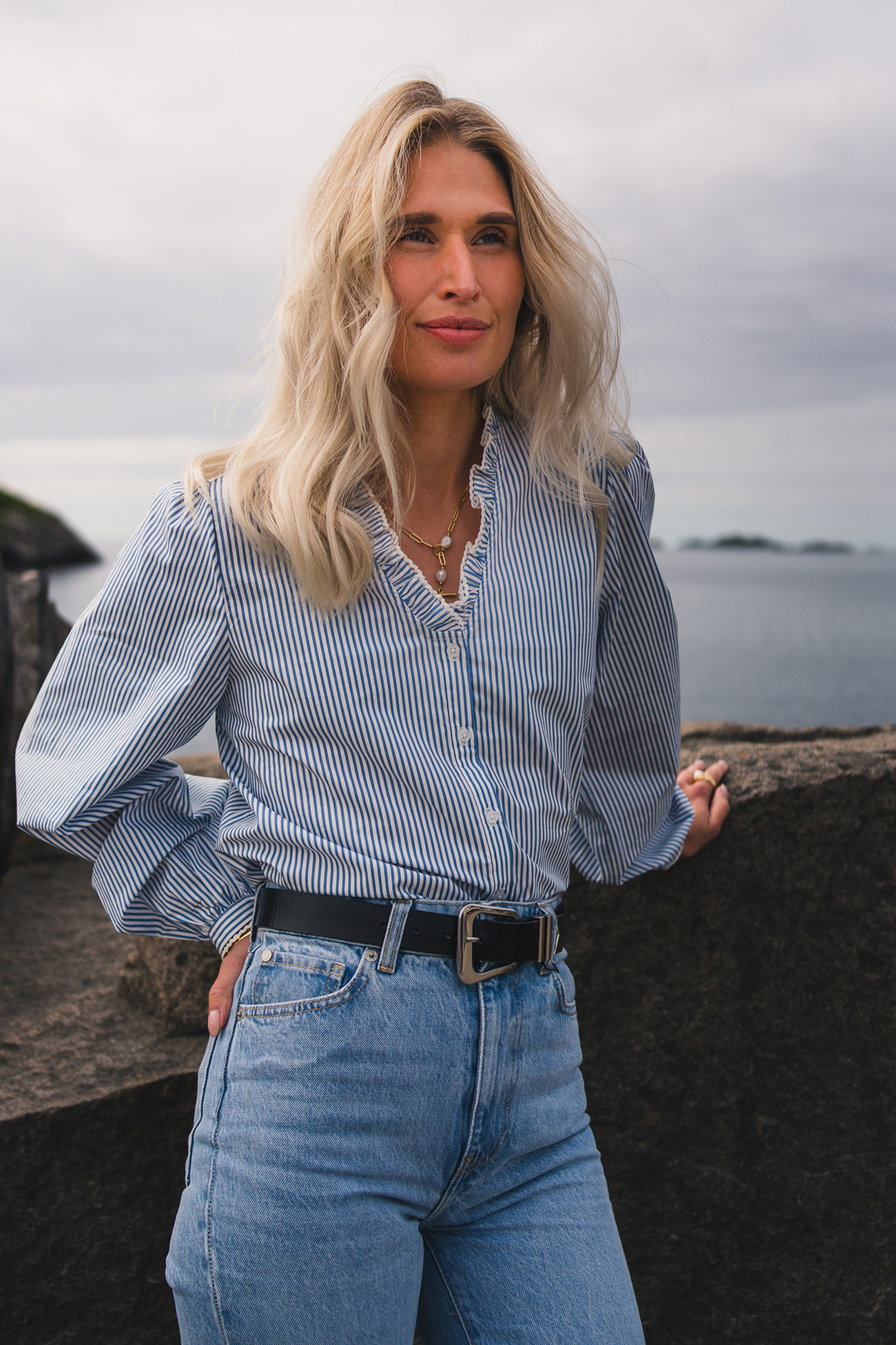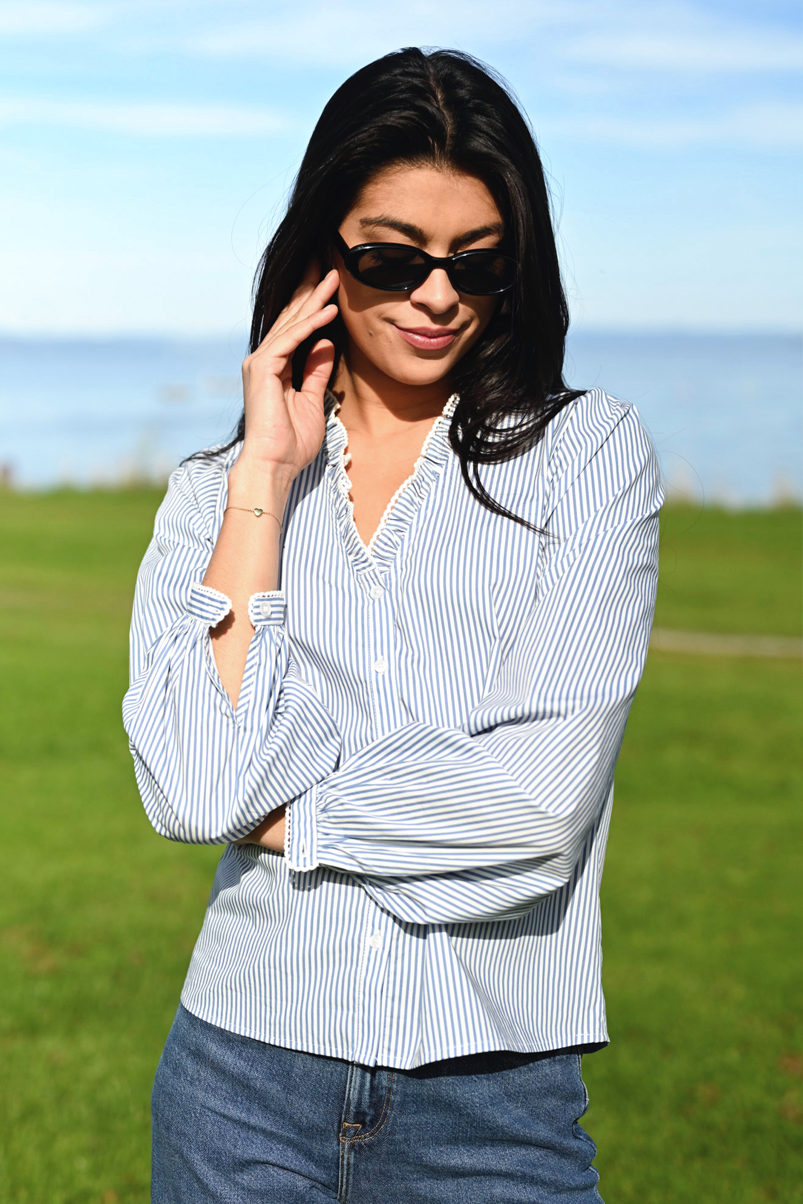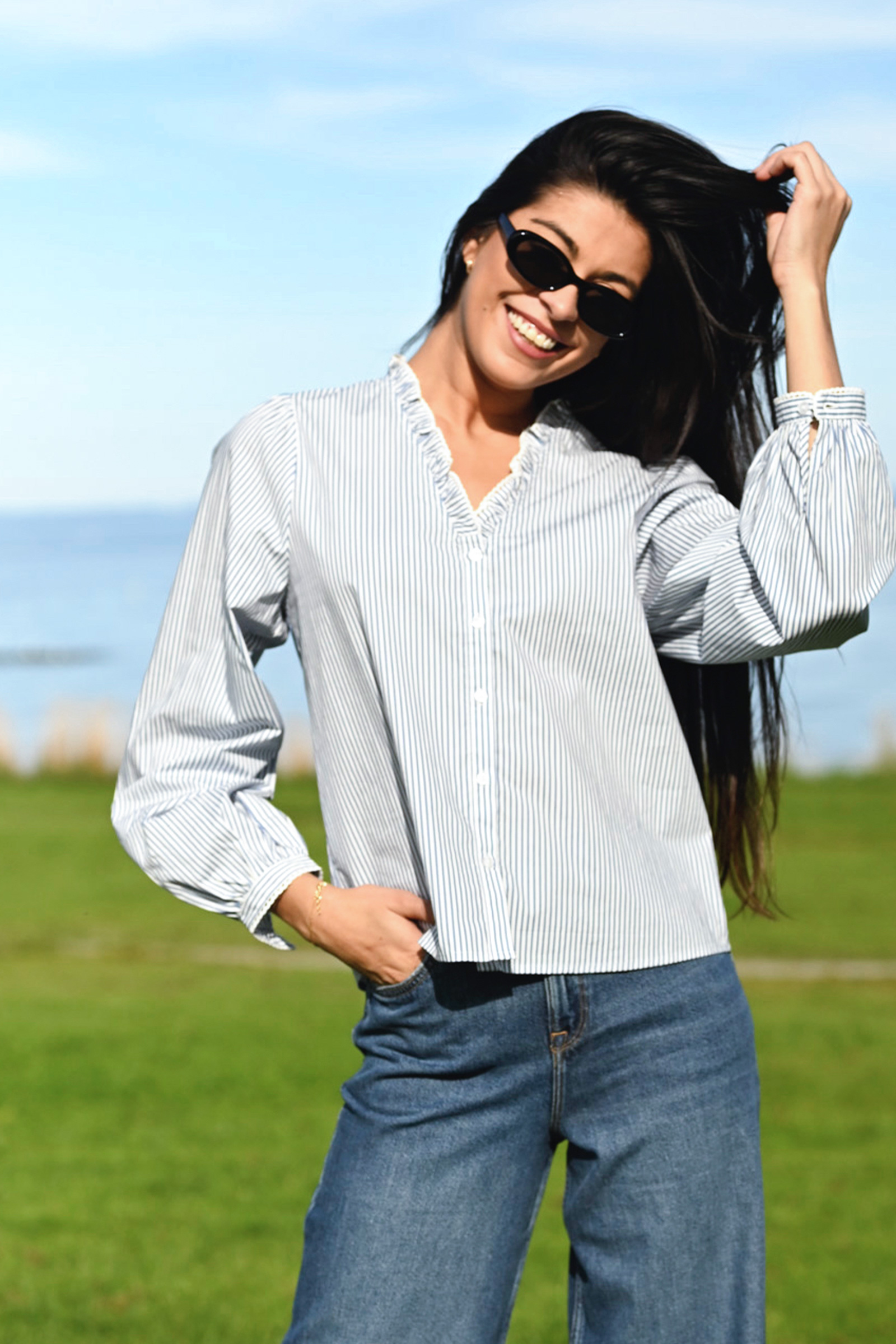 Delikat bluse fra Raus i et stipete mønster i hvit og blå toner. Ida har lange ermer med volum og stramme mansjetter, en rett passform samt en v-skjæring i halsen som gir et feminint snitt. De delikate volangene langs halsen gir et romantisk uttrykk og gjør at den passer perfekt inn i vår- og sommergarderoben. Superfin å kombinere til jeans!
