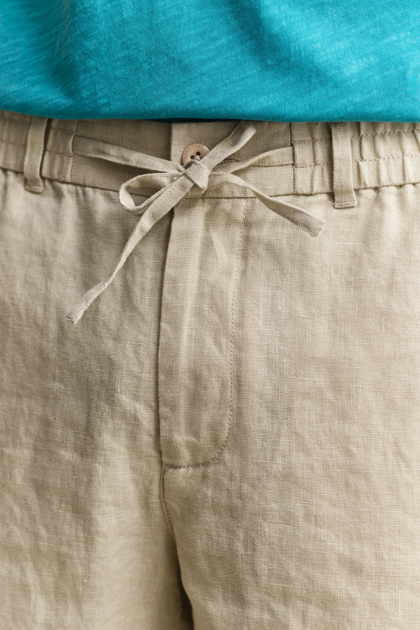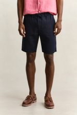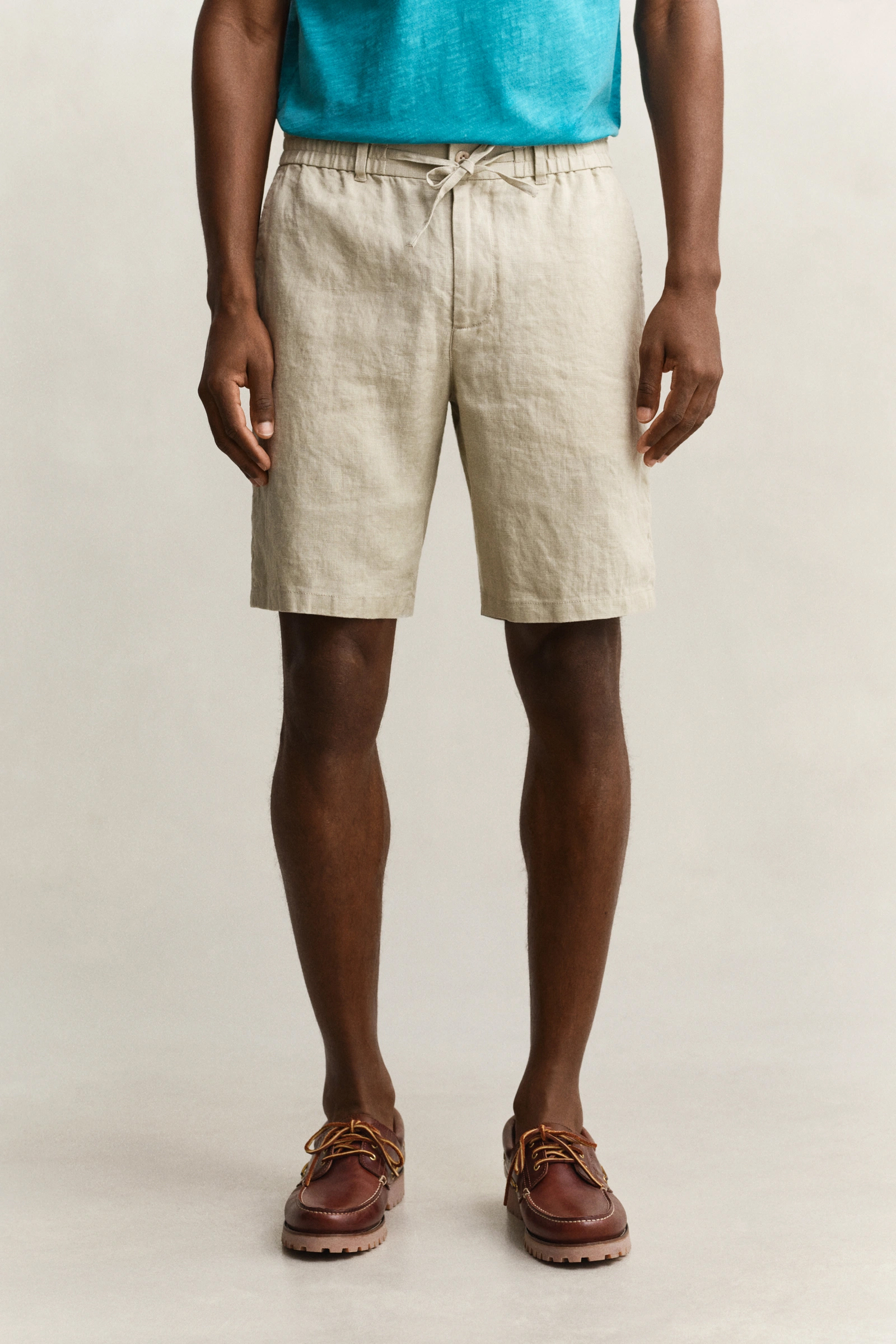 Beige, klassisk linshorts fra Gant. Reg Linen Shortss er av 100% lin, har en avslappet passform med snøring i livet, stikklommer i siden og en lengde til ca rett over kneet. Shortsen lukkes med glidelås og har også knappelukking i livet. Passer perfekt til en t-skjorte eller en piké for en komfortabel look.