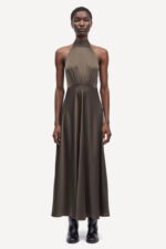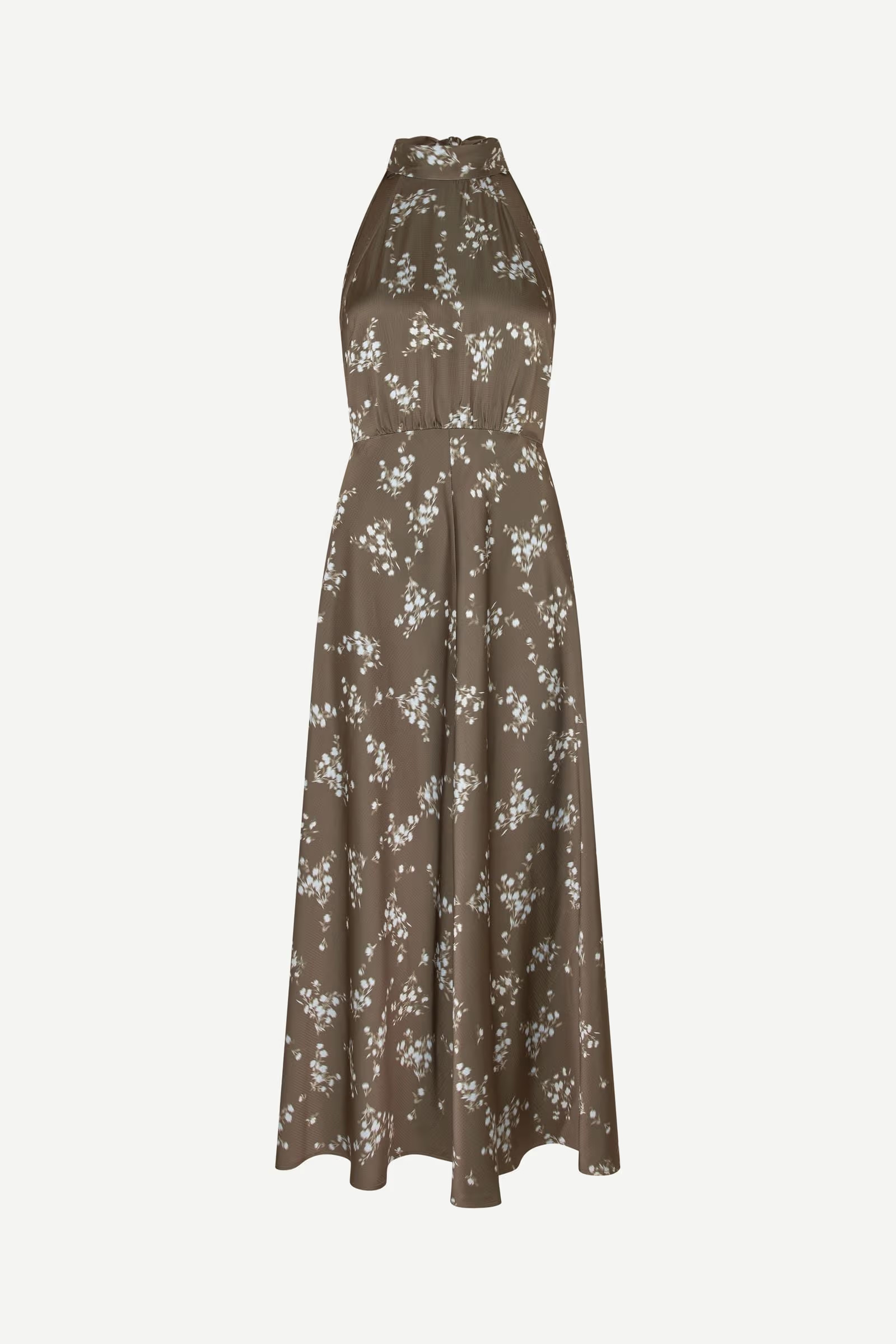 En nydelig kjole fra Samsøe Samsøe i en delikat bruntone med blomsterprint. Rheo Dress er en ermløs kjole i sateng med en smalpassform og et a-formet skjørt. Knyting bak i nakken som setter en trendy og moderne detalj. Dette blir helt klart en favoritt i festsesongen og er nydelig å kombinere med et par øredobber fra Enamel og et par høye hæler.