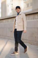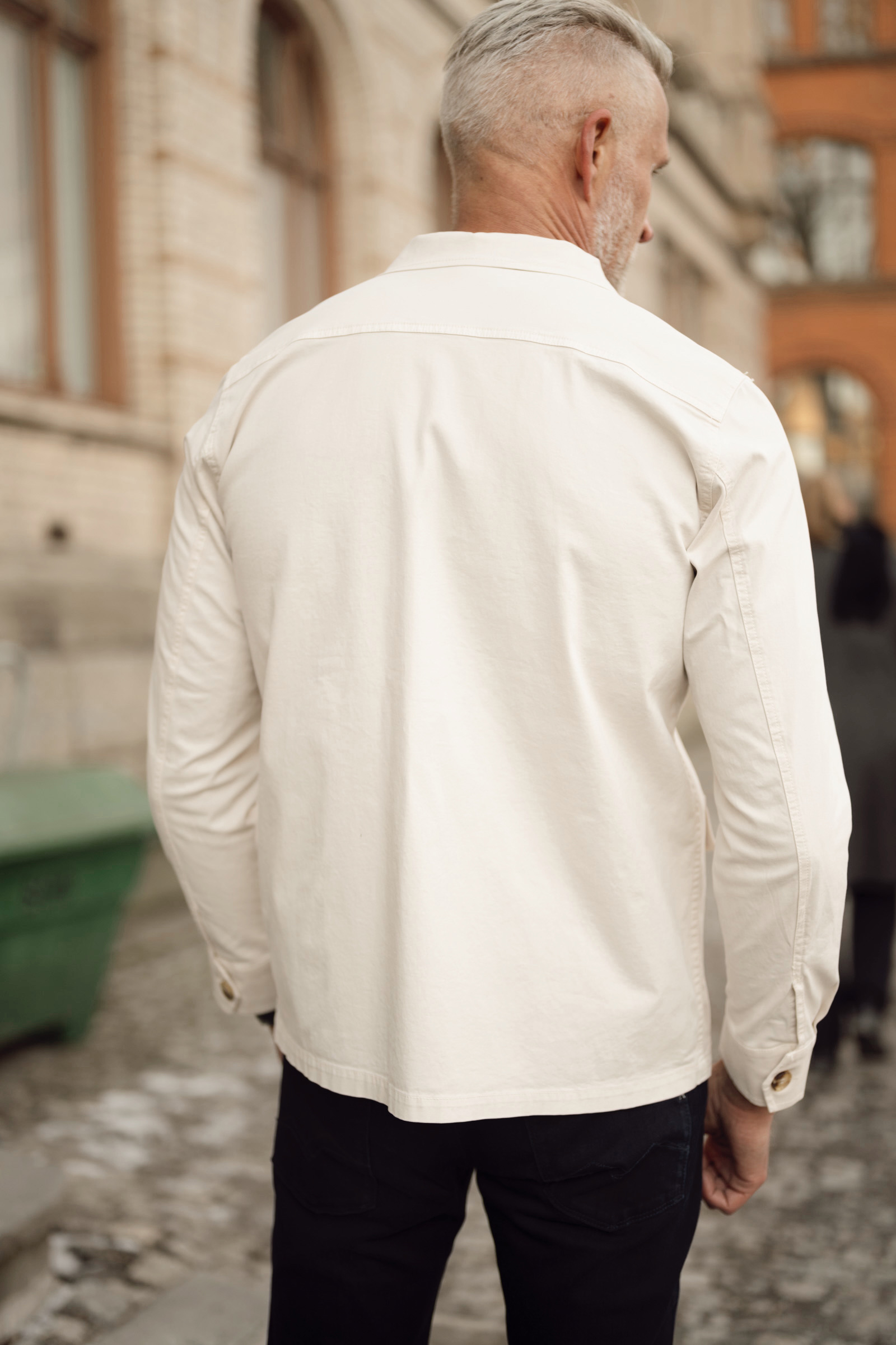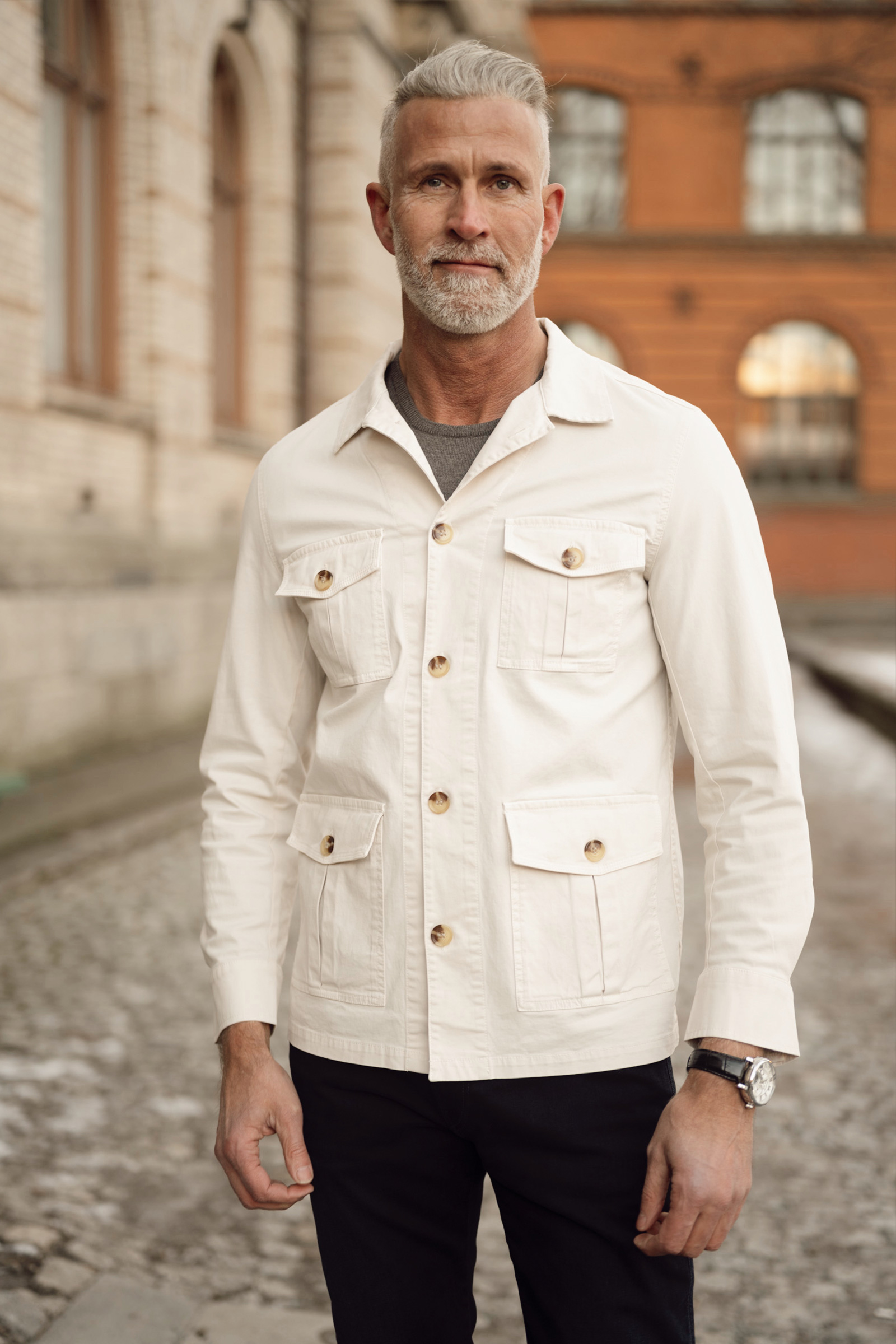 Rå overshirt fra Oscar Jacobson i en tidløs kremfarge. Safari Shirt har en stilig krage med slag, enkel knappelukking med brune knapper, lange ermer med mansjetter samt en rett passform for en uanstrengt og behagelig look. Fire romslige lommer i front som understreker det tøffe uttrykket. Med sin deilige kvalitet i bomull er dette en lett vår- og sommerjakke som er perfekt både til hverdagen og penere bruk.
