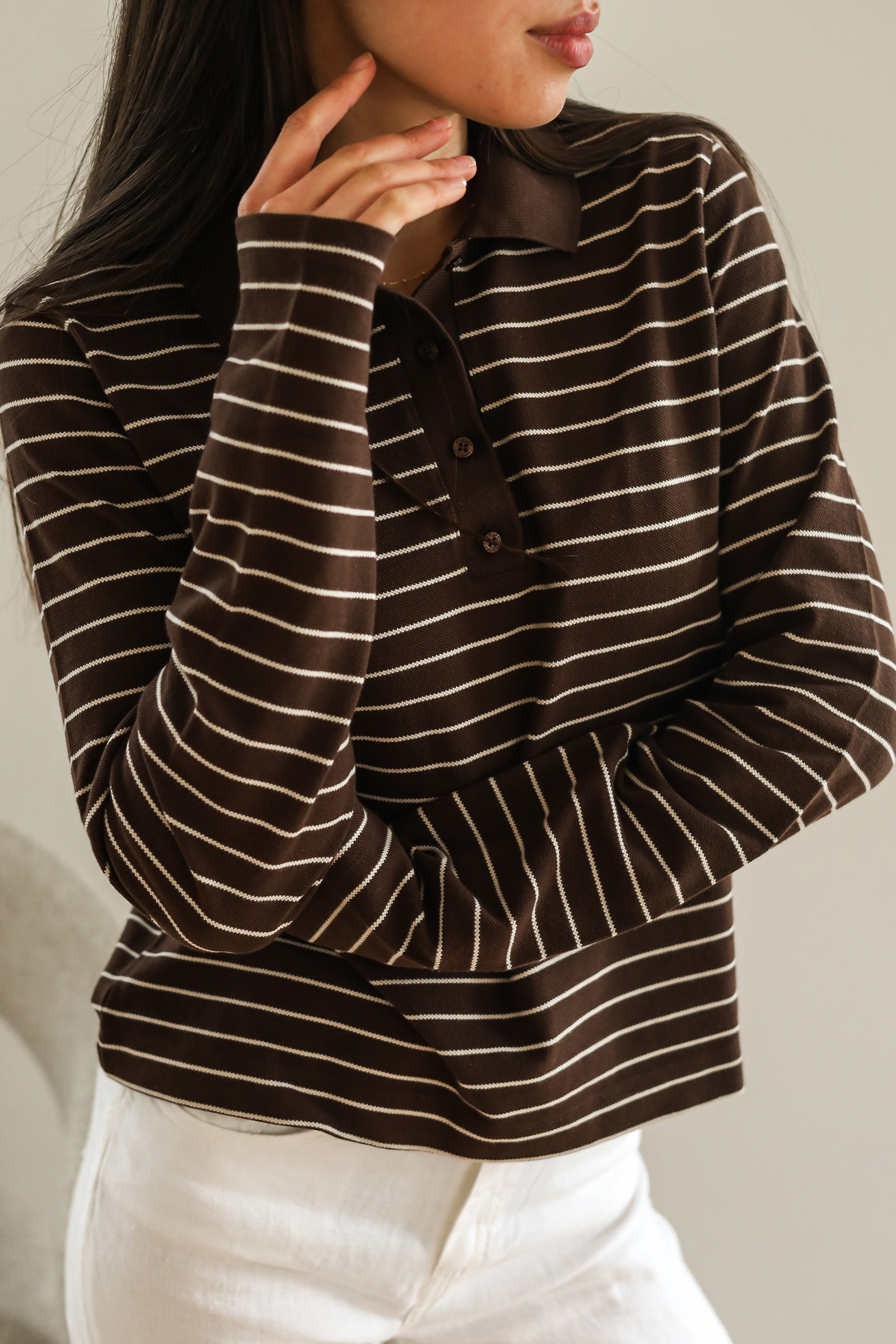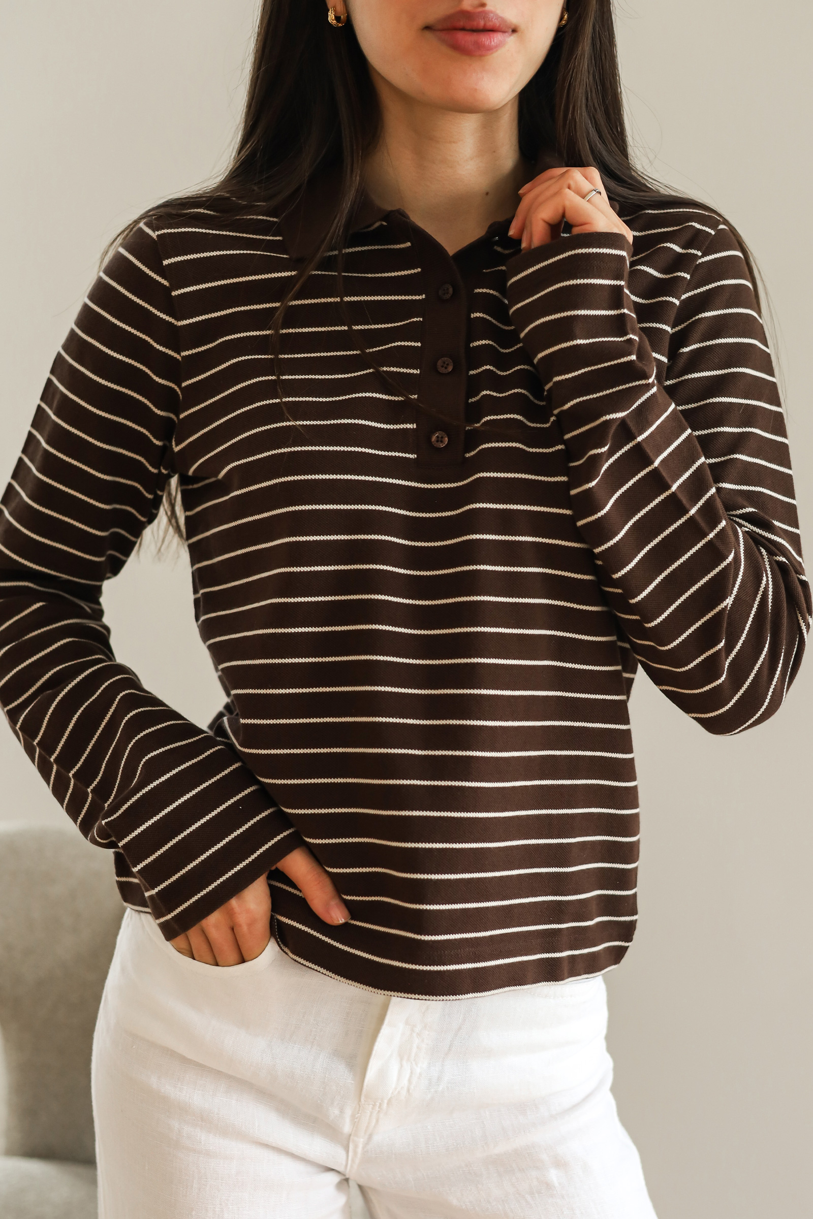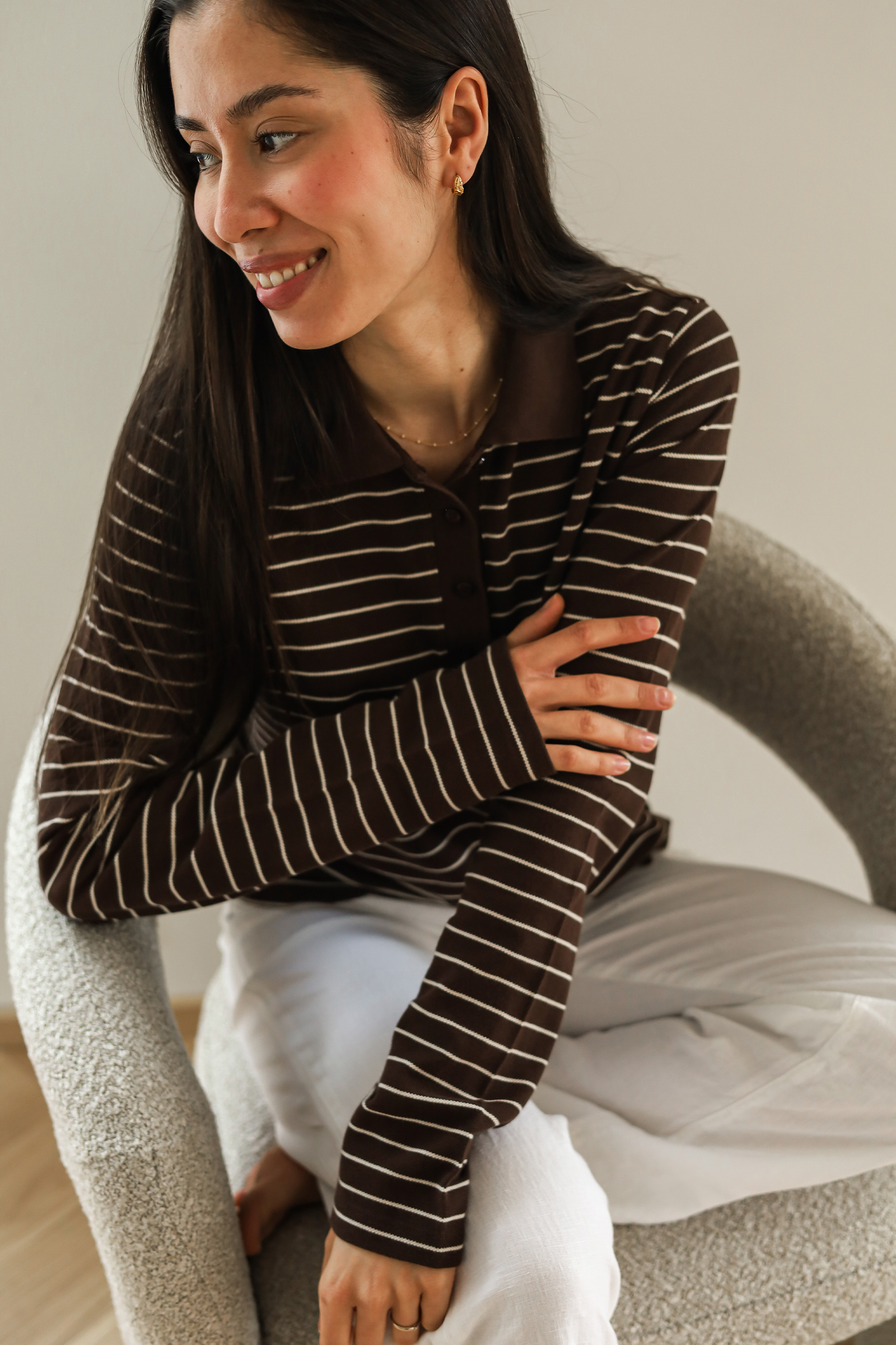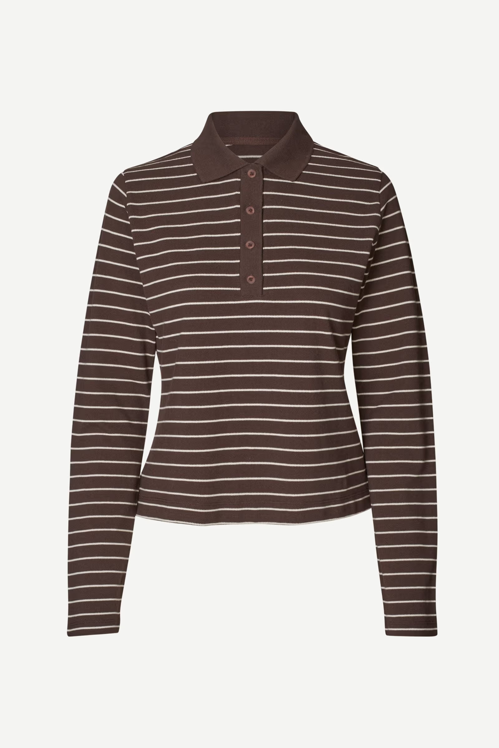 Trendy og rå pologenser fra Samsøe Samsøe i mørk brun med lyse striper. Samia kommer i en rett passform med krage og knappestolpe til brystet samt lange ermer. Laget i 100% bomull hvilket gjør at den føles god mot huden. Kjempefin å style både med lyse bukser og denim.