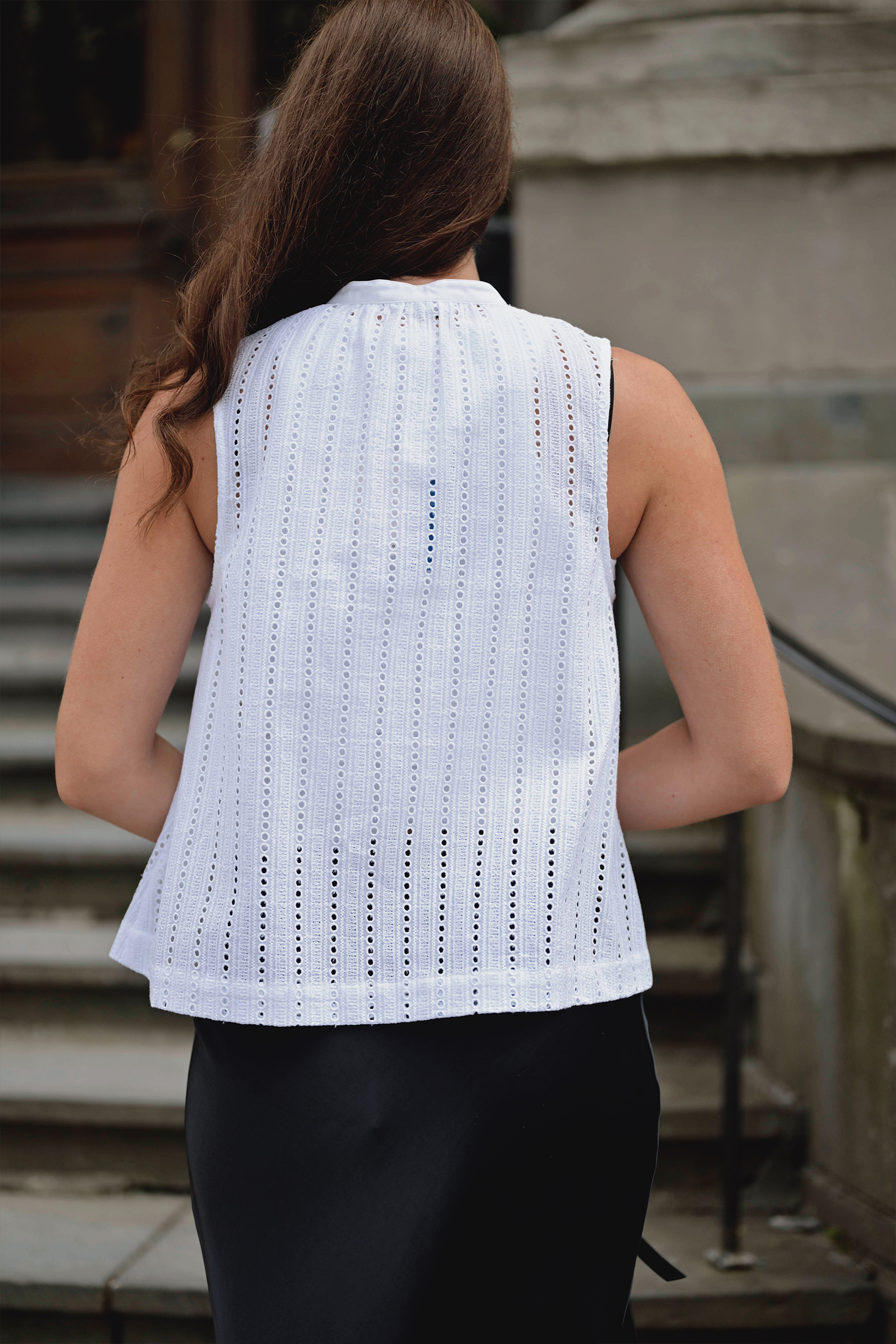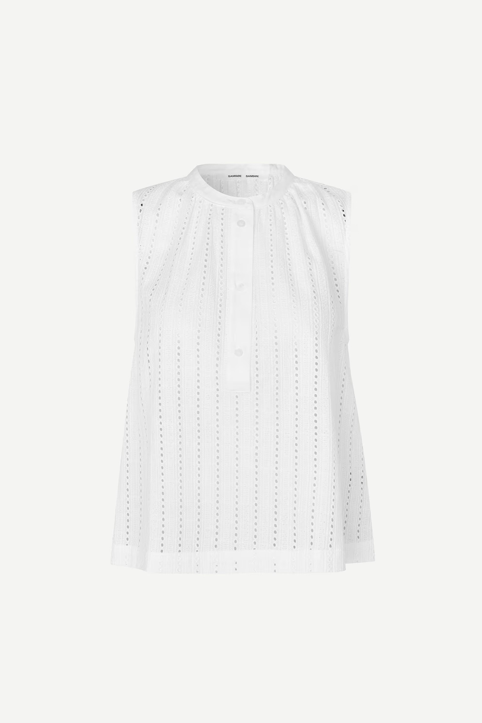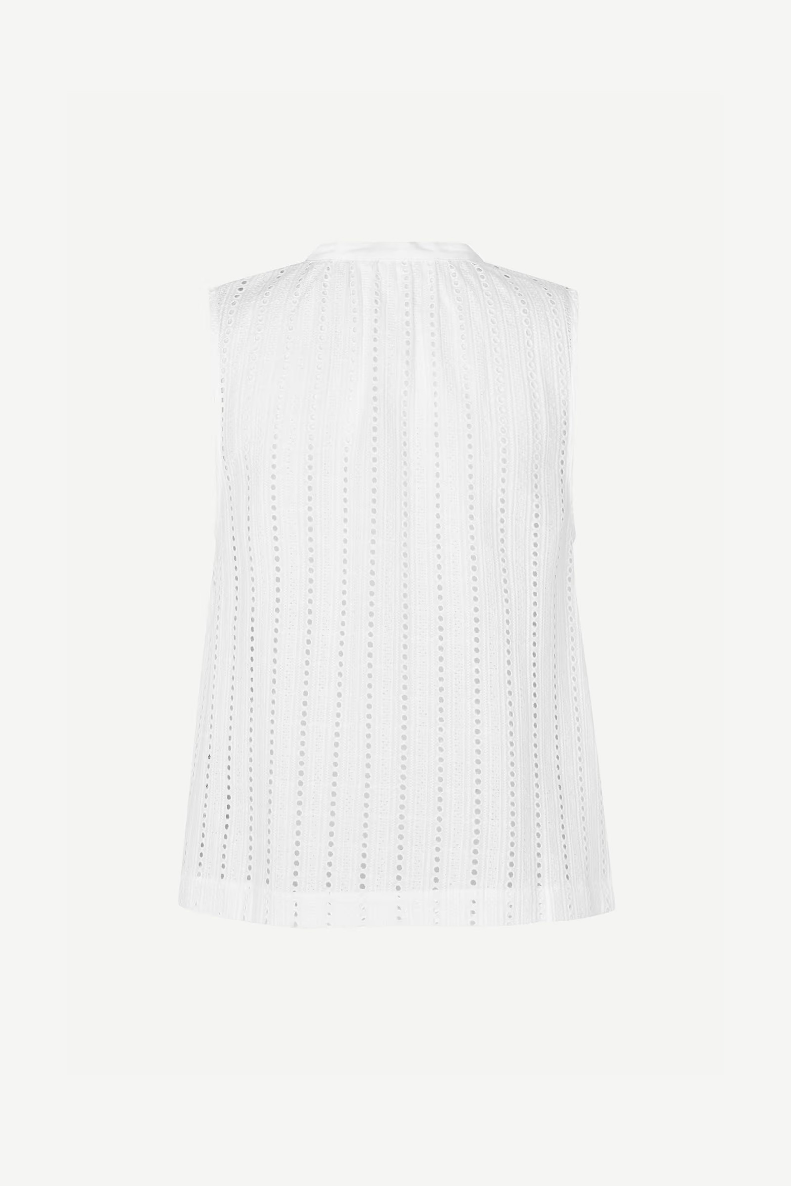 Romantisk bluse fra Samsøe Samsøe! Samanarola Top er en ermeløs topp med engelske blonder og avslappet passform, rund hals og knappelukking i front. Kombiner med både jeans, skjørt eller shorts på varme dager!