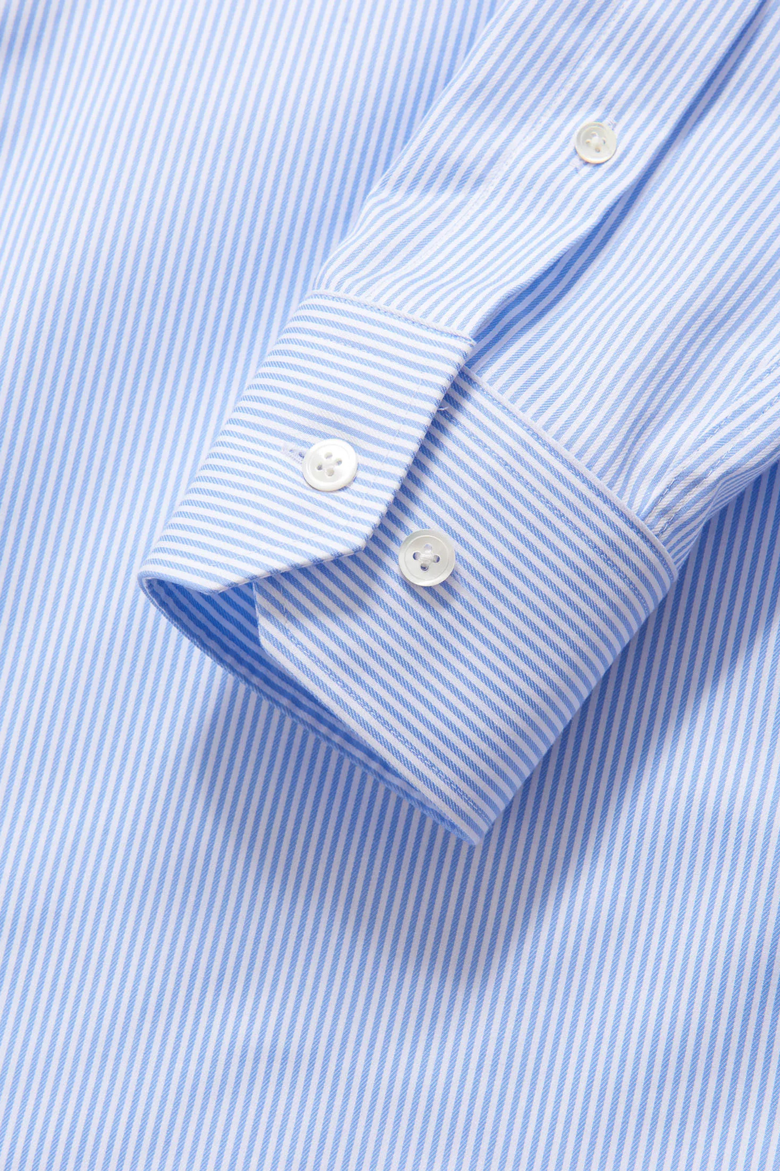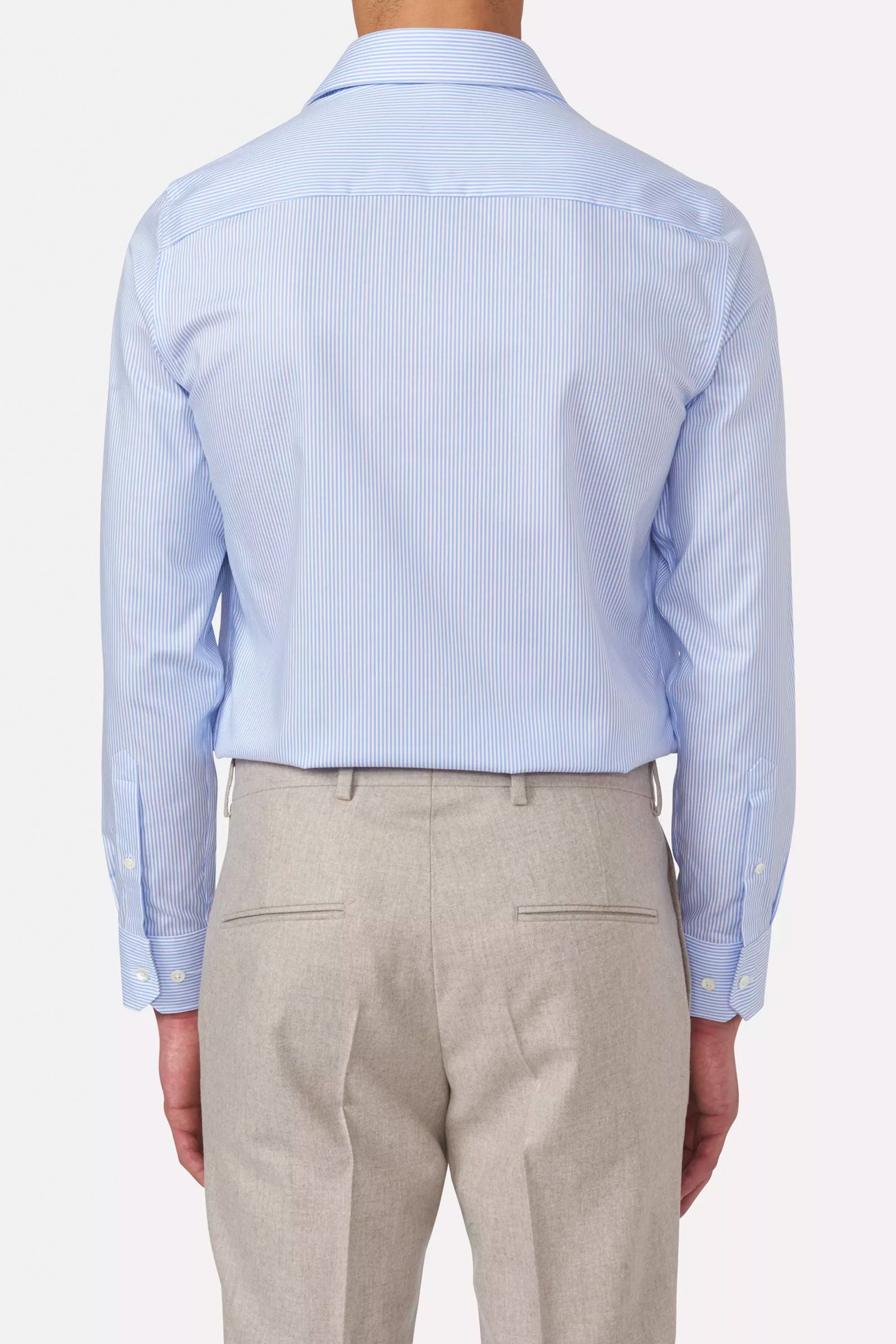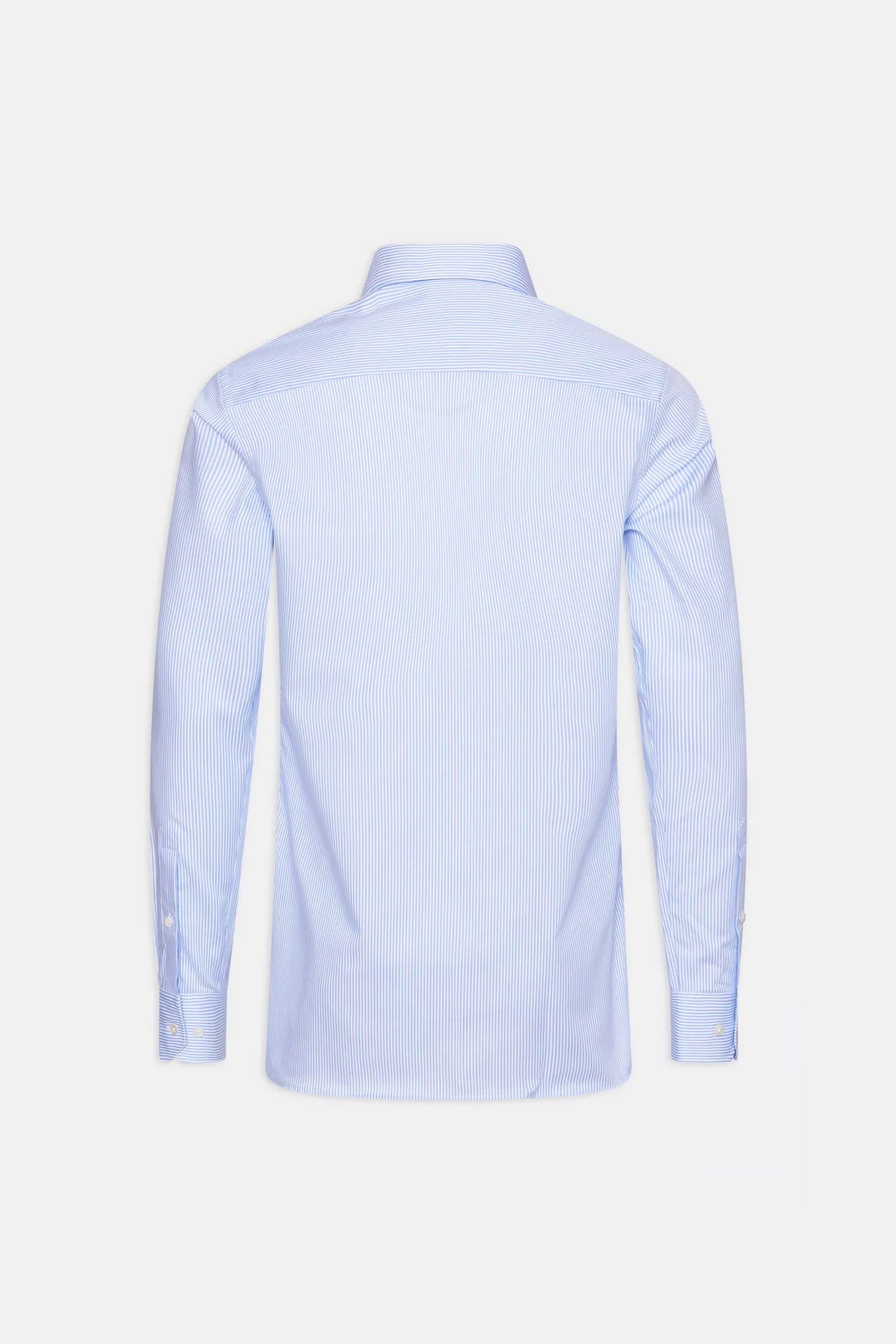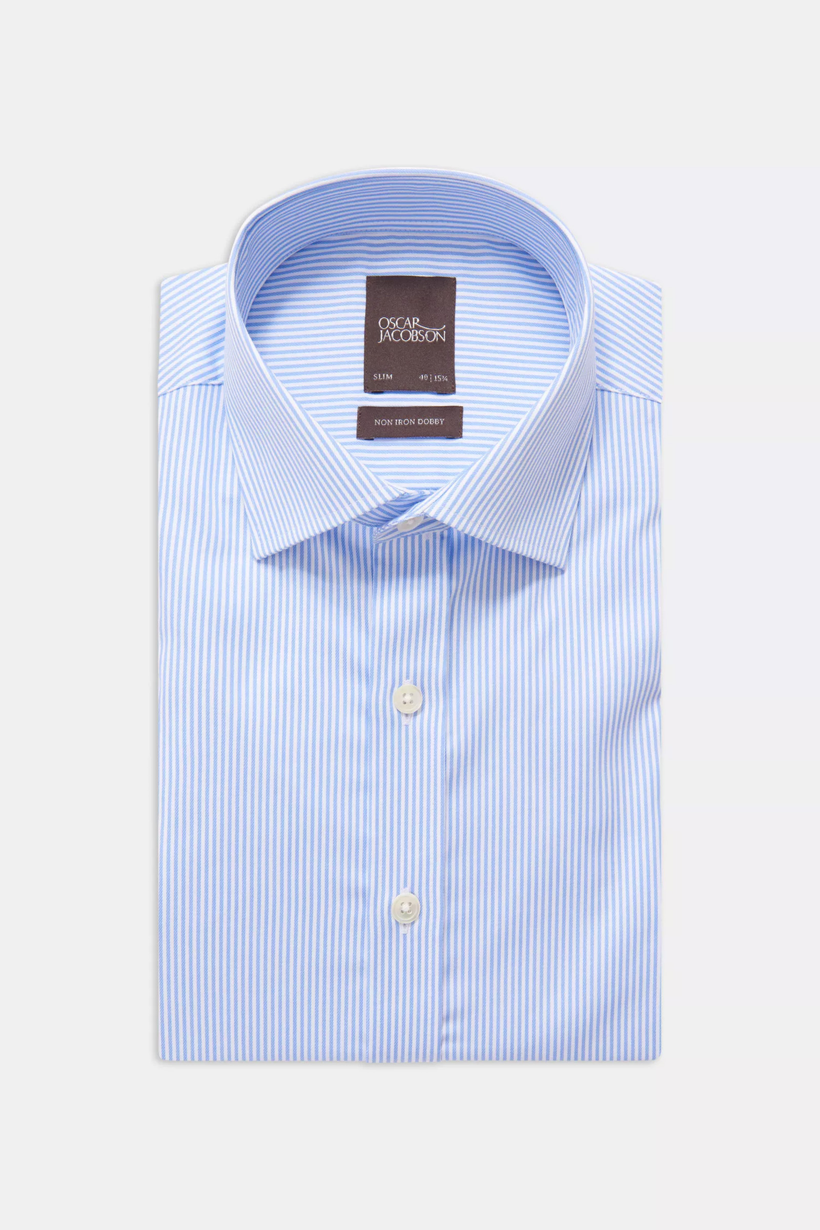 En klassisk skjorte med banker-striper fra Oscar Jacobson. Skjorten har en slim fit passform, med en klassisk krage og lyse knapper. Denne er laget i et strykefritt, bomullsstoff som føles behagelig på kroppen og gjør hverdagen litt enklere.