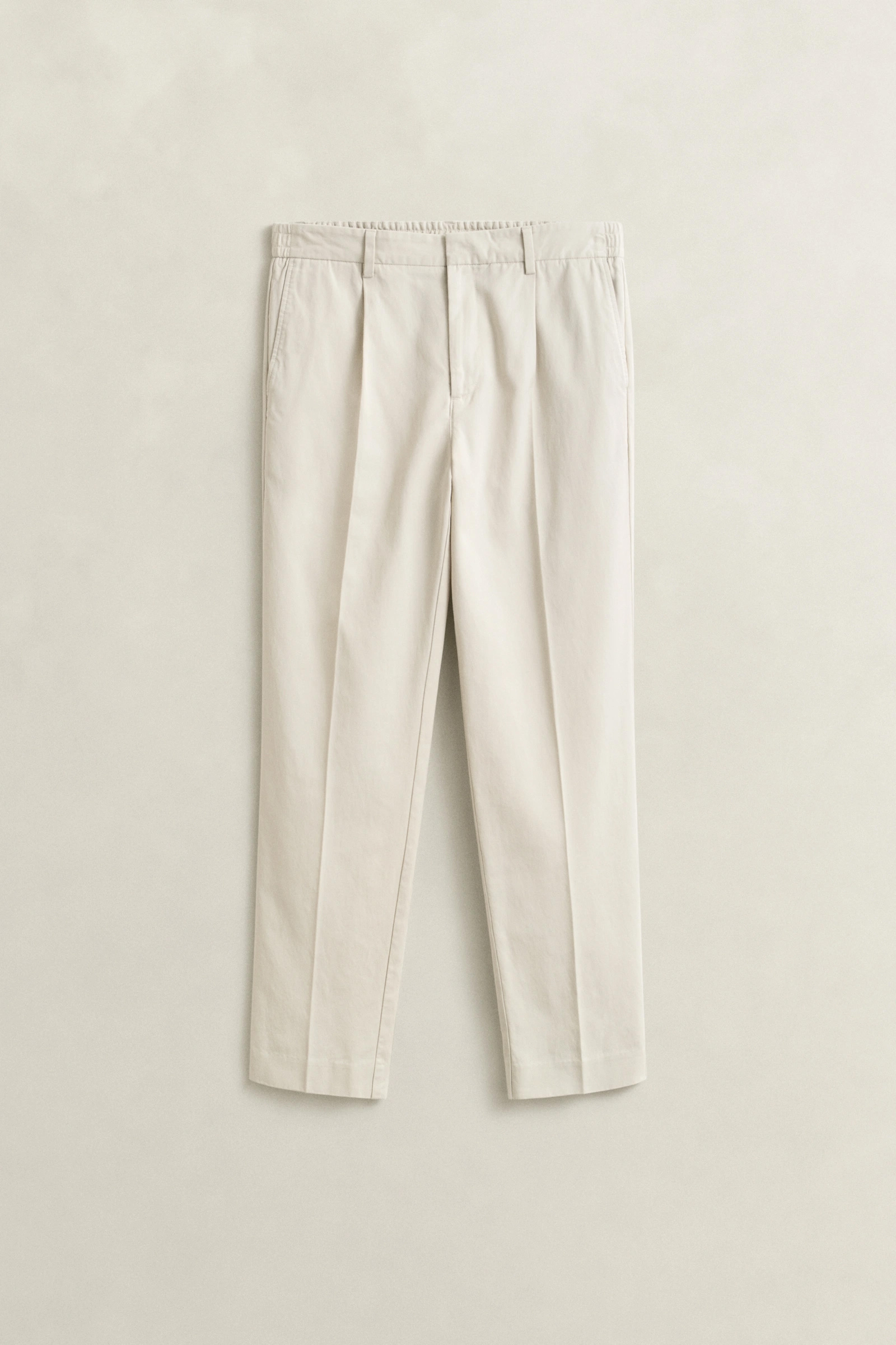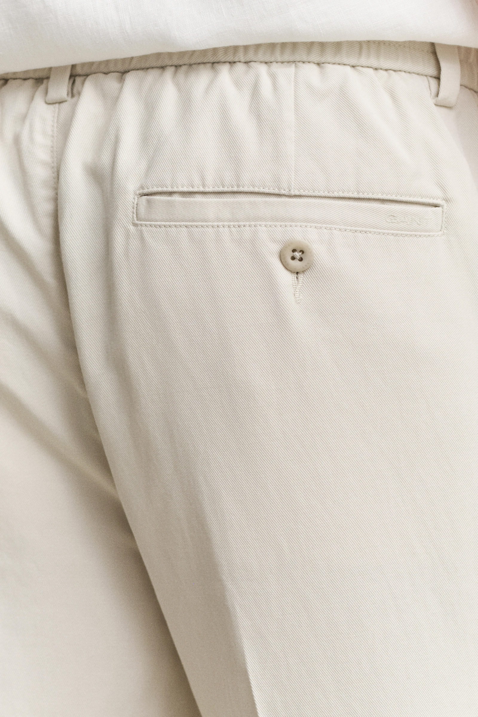 Tidløse chinos fra GANT i krem – perfekte til smart-casual antrekk. Disse chinosene har en karakteristisk silhuett med mid-rise liv og smal passform fra hofte til ben. Laget i myk bomullsblanding med lycocell noe som gjør dem både behagelige og gir dem et tidløst uttrykk. En moderne tolkning av en klassisk preppy favoritt, med detaljer som corozo-knapper, skrå sidelommer, passepoilerte baklommer og knappelukking foran.