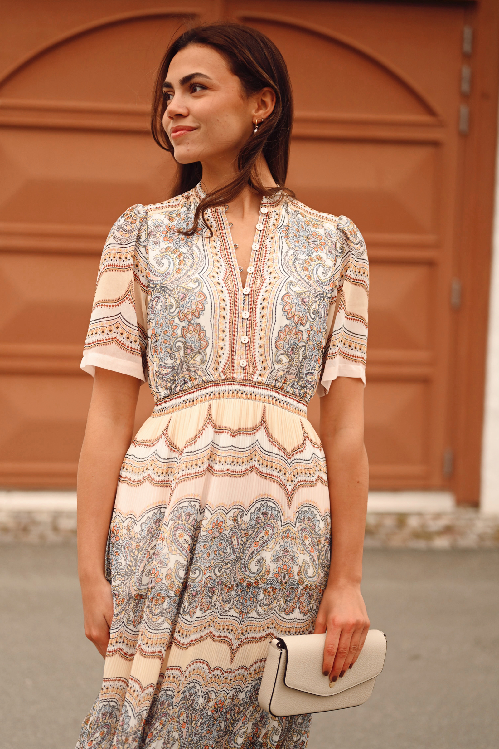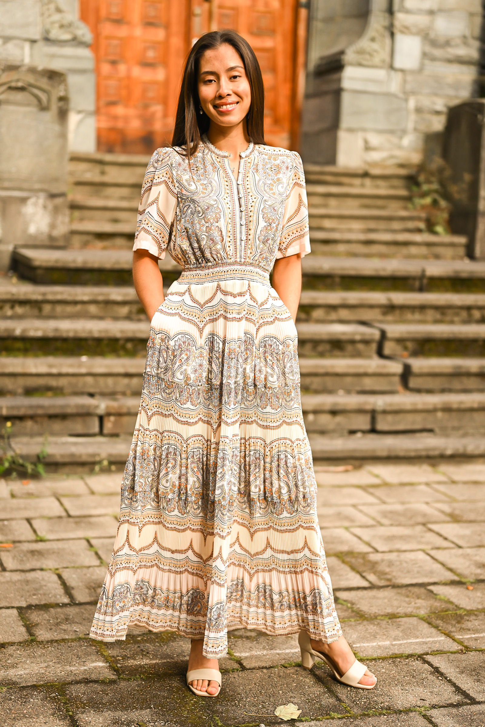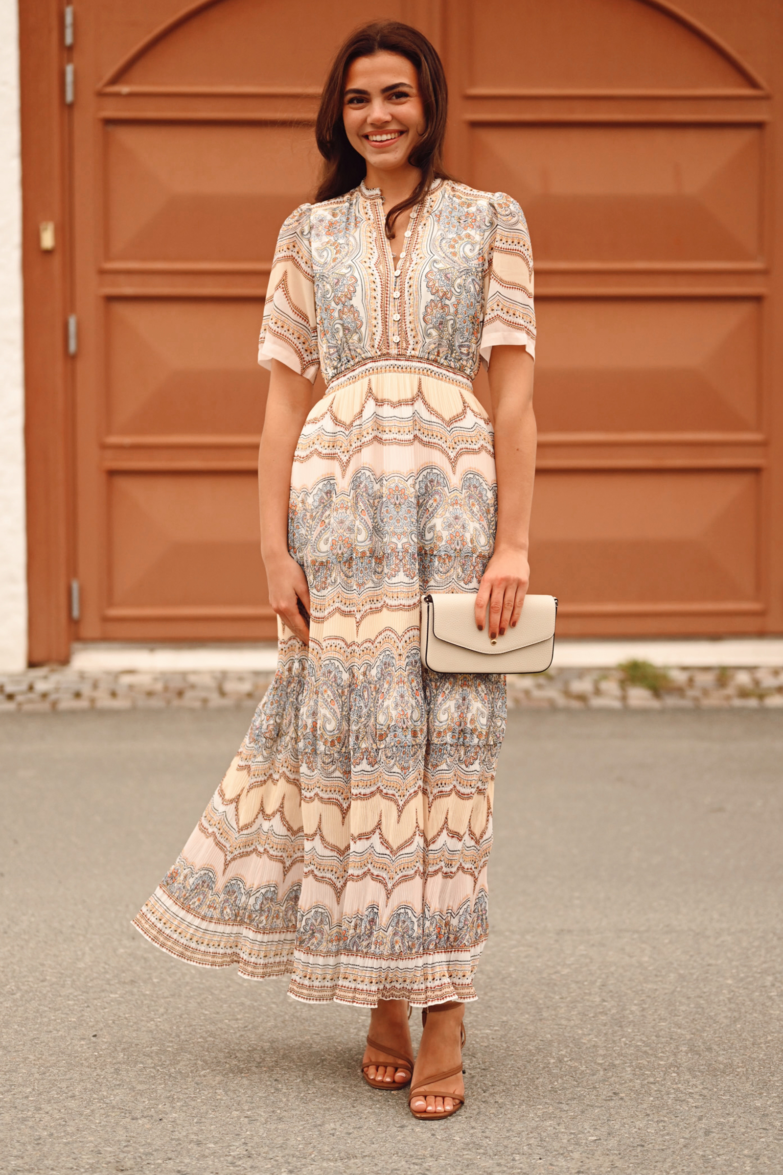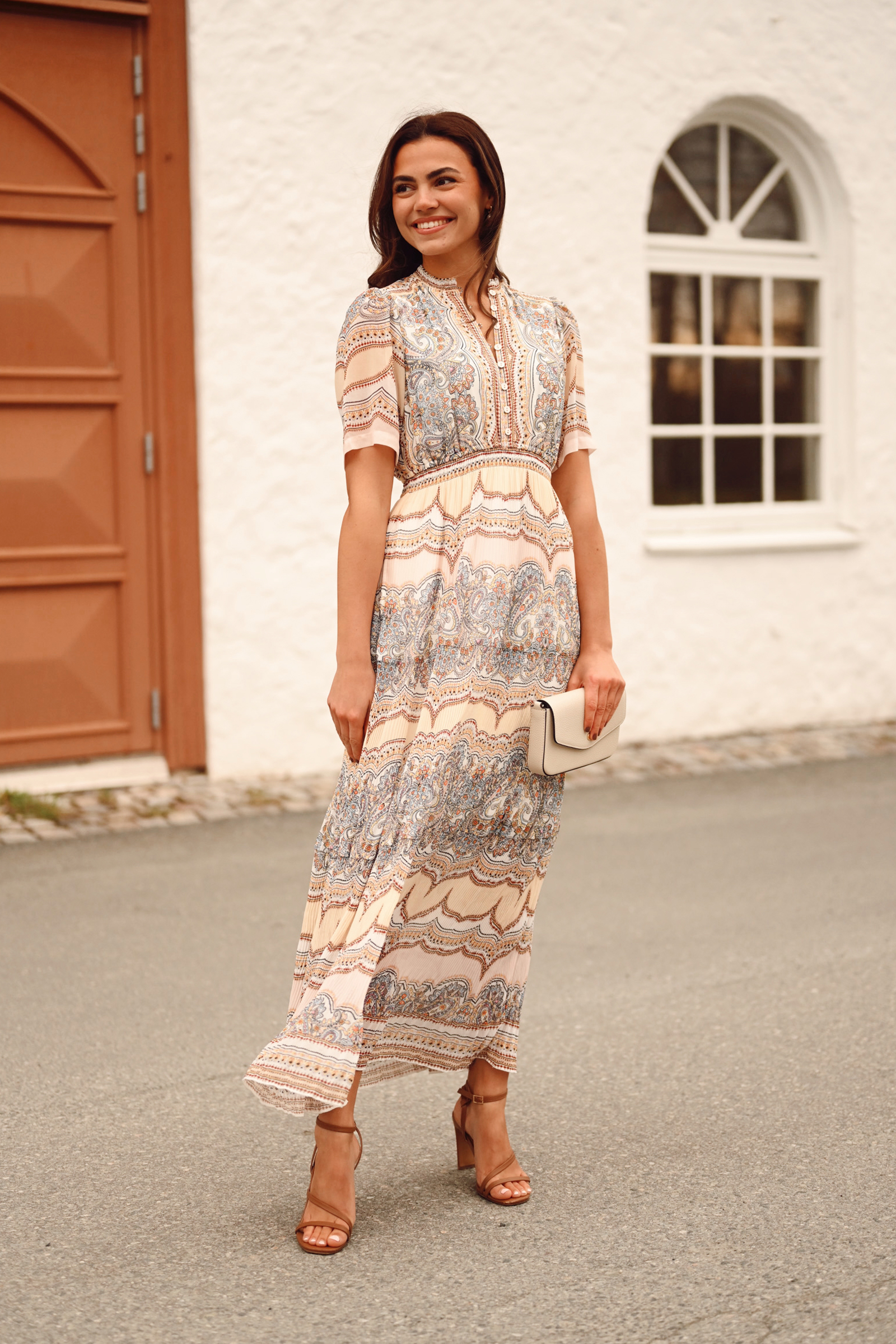 Delikat kjole fra Hale Bob i et beige, bohemsk print. Vale Dres gir et feminint uttrykk med sin maxi lengde og innsving i midjen. Med korte ermer, tilbyr den både stil og komfort som understrekes av lommene i siden. De duse fargene og det flotte snittet gjør den til en favoritt gjennom vår og sommer. Bruk den enkelt med sandaler for en avslappet hverdagsstil, og sett prikken over i’en med smykker for en festlig anledning.