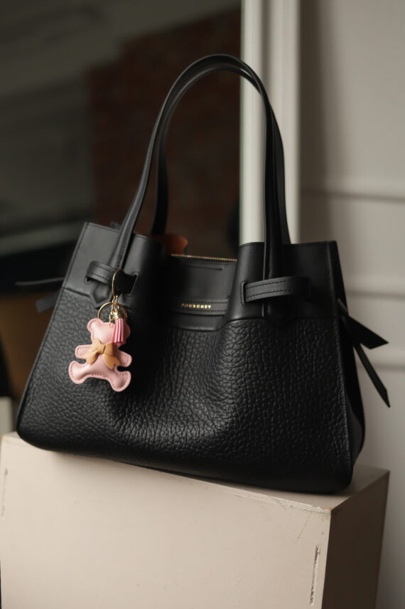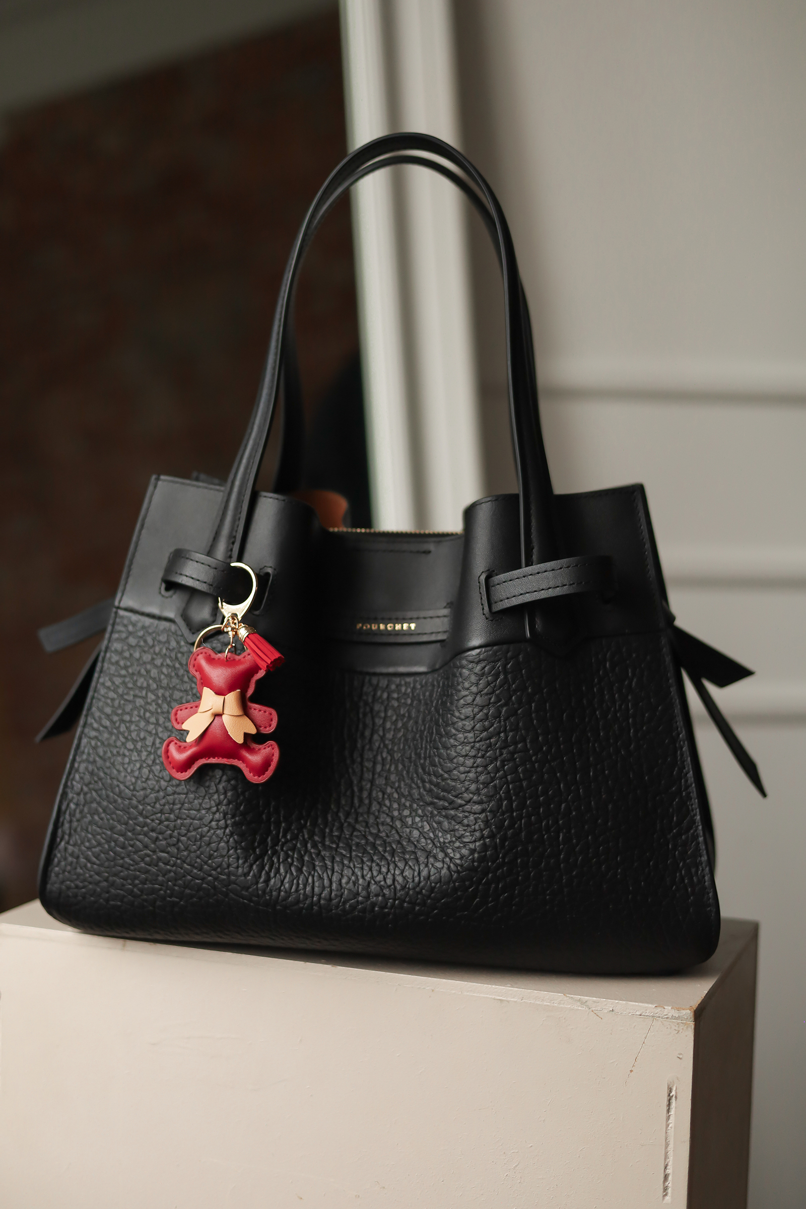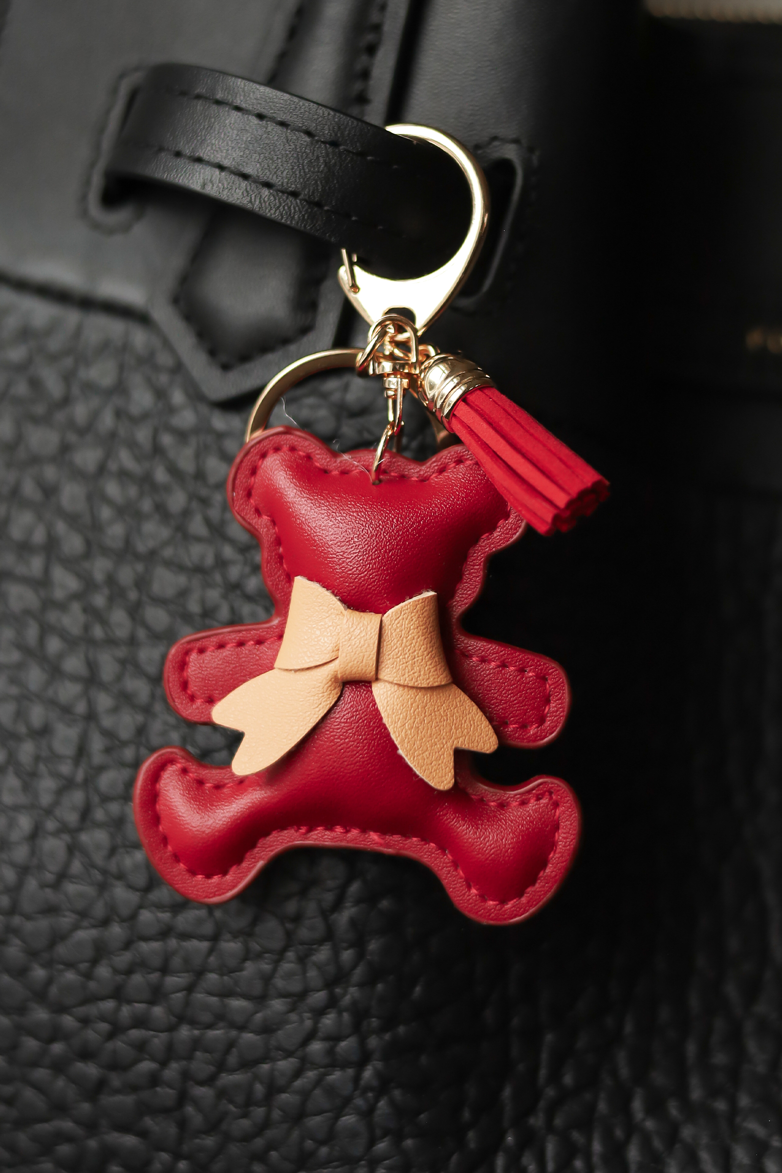 Trendy veskepynt med en søt skinnbamse og dusk i burgunder. Du kan enkelt fjerne og legge til motiver om ønskelig og er like fin å ha på vesken som mobilpynt. Pynt opp vesken din med det lille ekstra!