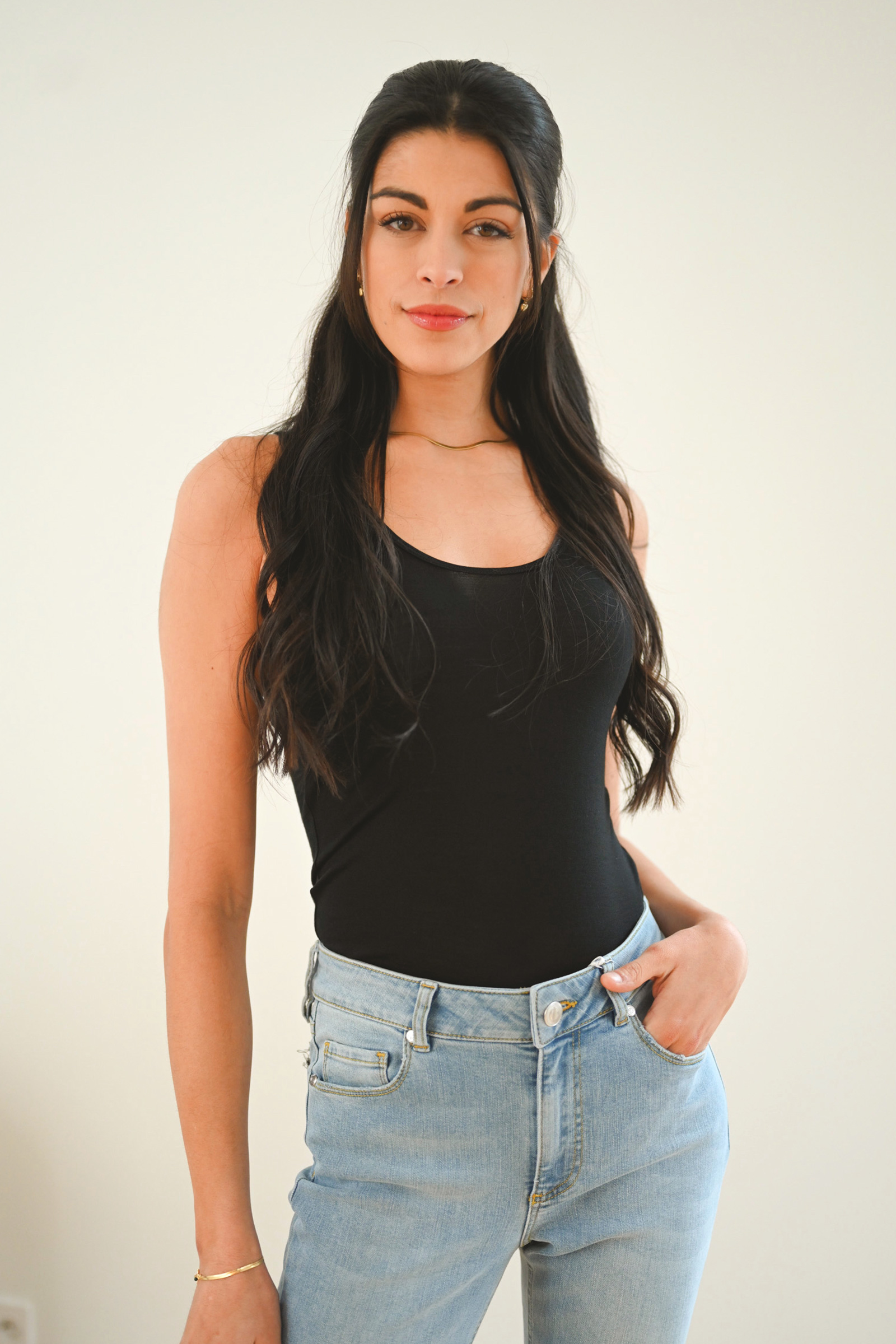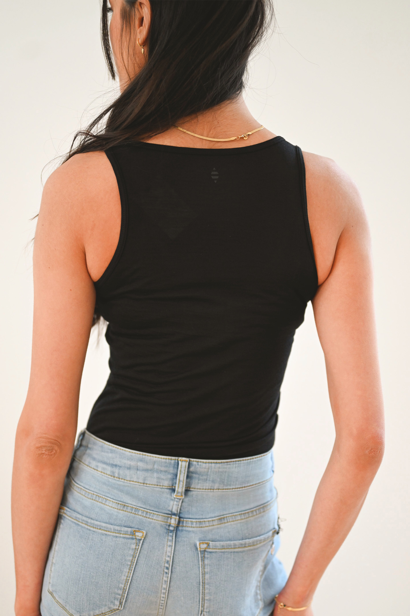 En tynnere singlett fra Panos Emporio i sort. Overdelen er laget i en miks av ull og tencel som regulerer kroppstemperaturen. Den perfekte base, både sommer og vinter, og kan styles både til fest og trening.